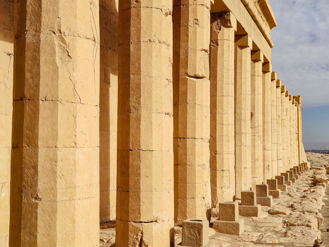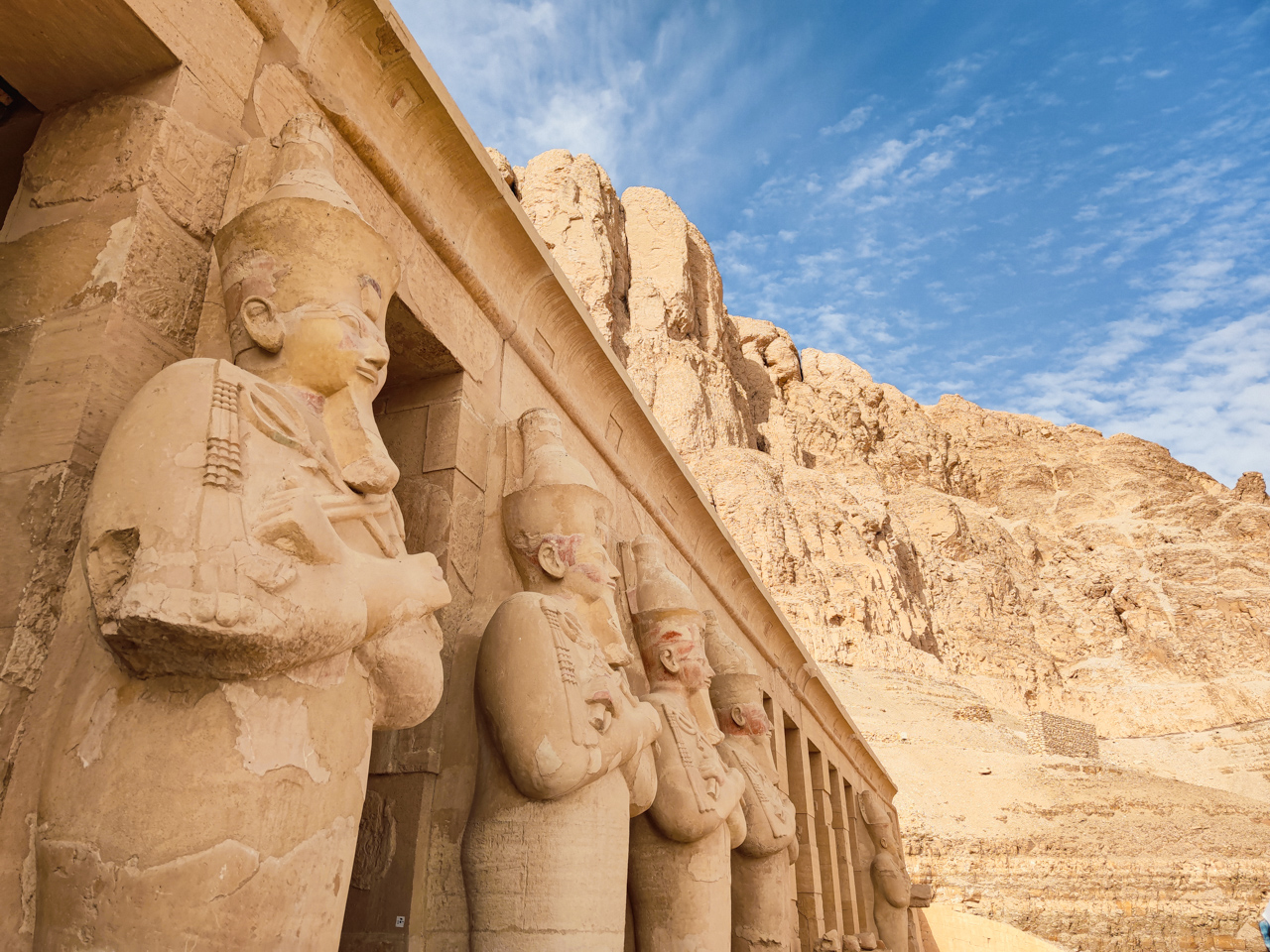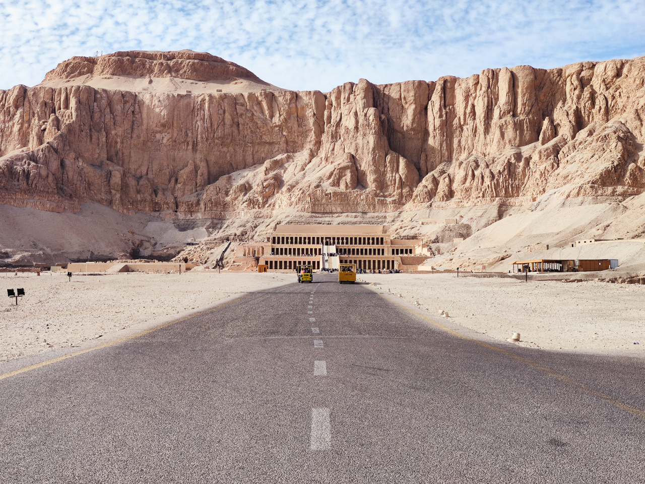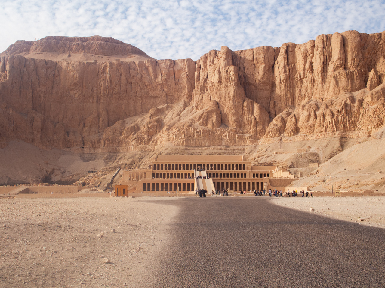 En sortant on appelle Ahmed notre chauffeur pour le prévenir que l’on revient au parking et que l’on a été beaucoup plus long que prévu. Il nous récupère et propose de visiter le temple d’Hatchepsout, un des symboles de Louxor, édifié au pied de la falaise. Le temple est construit en trois terrasses,.