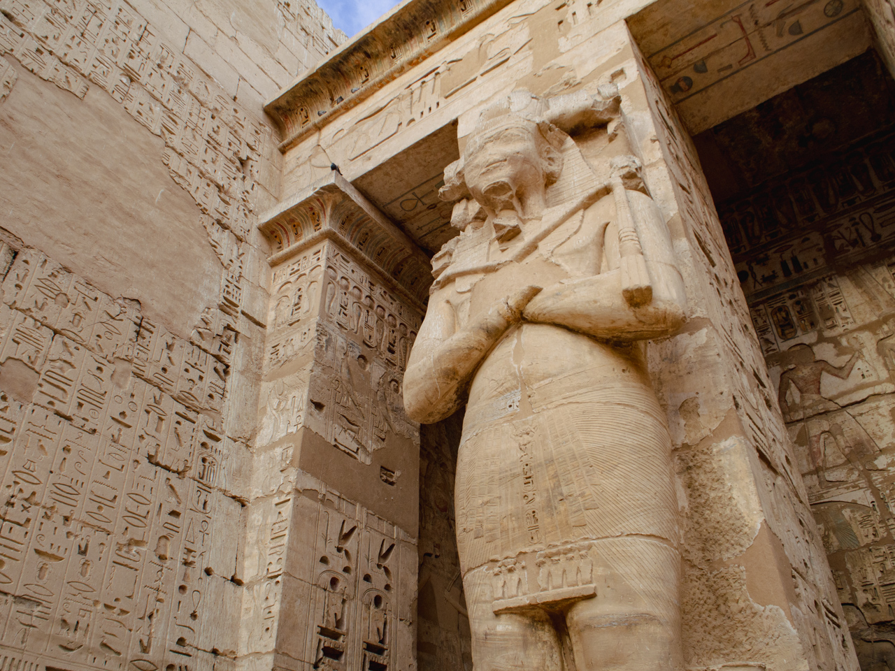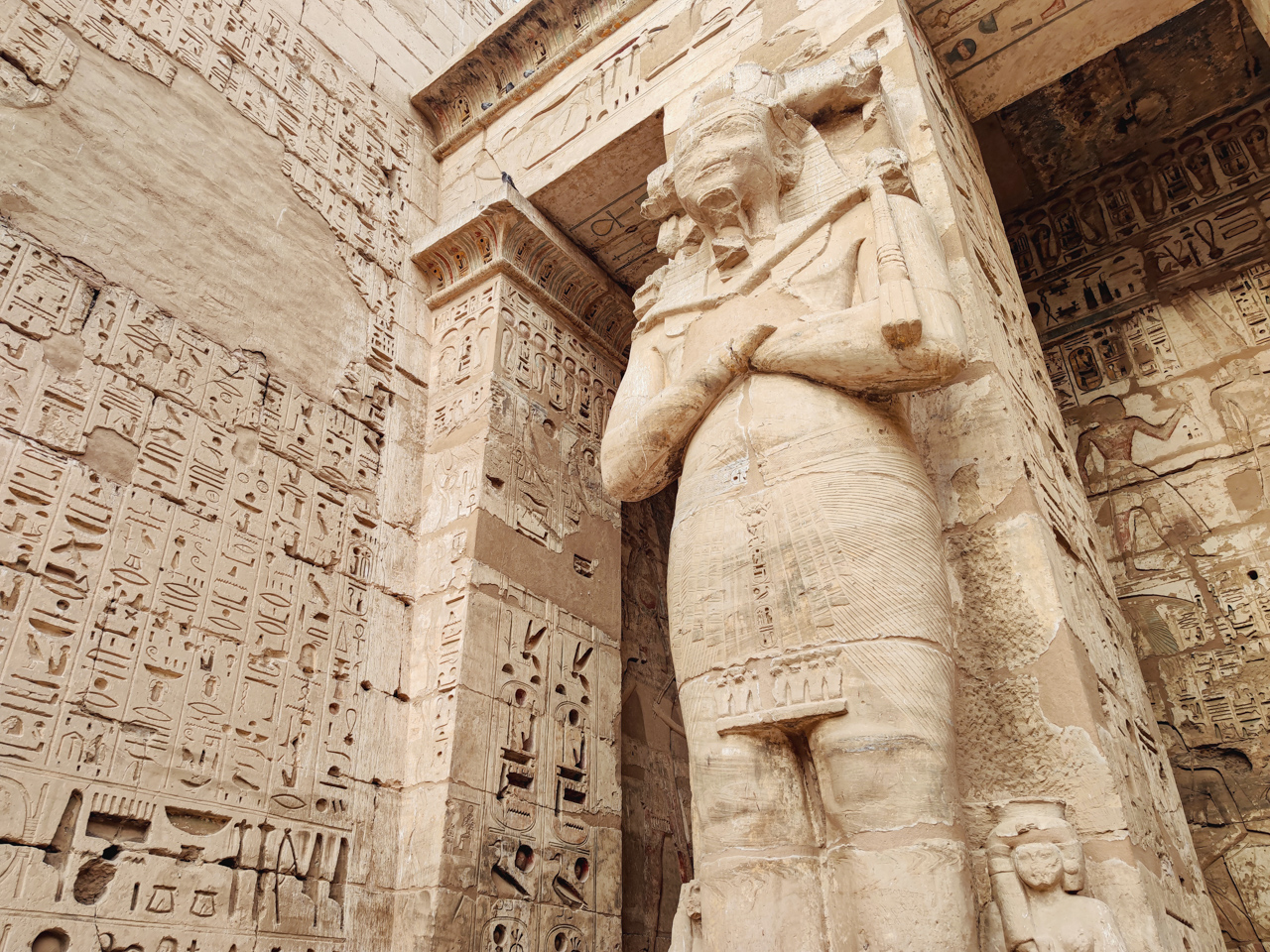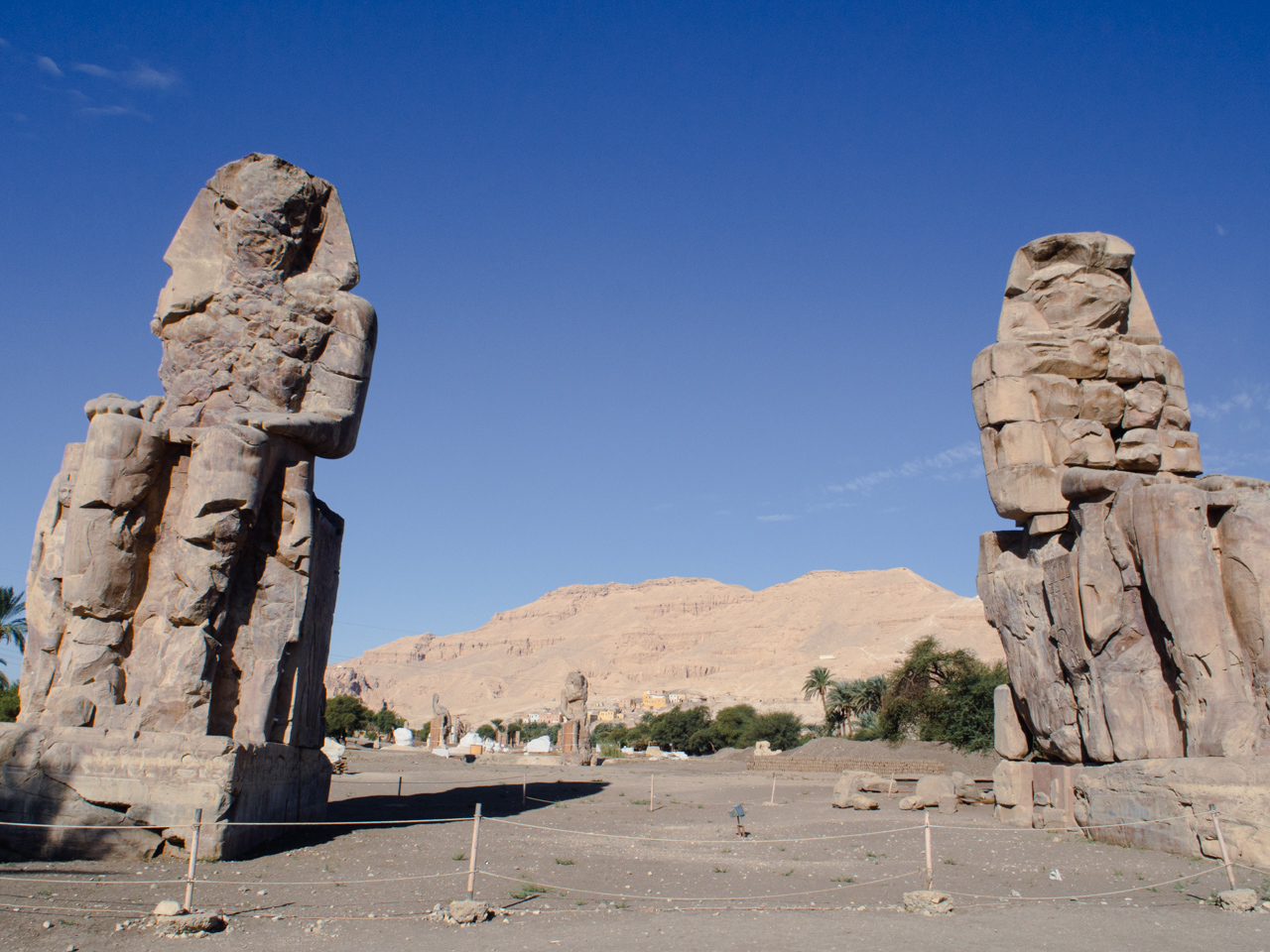 Nous partons du Old Winter et traversons la route pour trouver un bateau pour faire la traversée. Pas besoin de chercher longtemps, soit on va prendre le ferry public, soit on prend un bateau privé pour le double du prix mais un départ juste devant l’hôtel. On décide de faire confiance à un des bateliers et on traverse le fleuve lorsqu’un des amis du capitaine discute avec nous pour nous proposer de nous amener visiter la partie Ouest. On sympathise rapidement sachant qu’il nous propose un prix tout à fait honnête, en fait après quelques jours en Egypte, on a décidé de ne plus se prendre la tête avec les négociations outre mesure et les demandes insistantes. Si la personne nous semble gentille et ce qu’il propose nous intéresse on tente le coup. On a remarqué que c’est une façon de rendre le voyage en Egypte très détendu, on suit donc notre nouveau guide qui nous amène à sa voiture et on discute ensemble de ce que l’on pourra faire durant cette journée ensemble sur la rive Ouest. Il nous conseille d’aller déjà à la vallée des rois, ce qui nous convient parfaitement. Sur la route, on passe devant les colosses de Memnon où on fait une halte pour les découvrir de plus près.