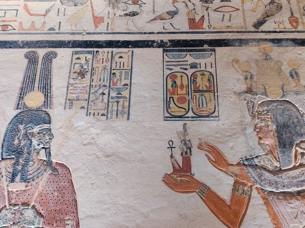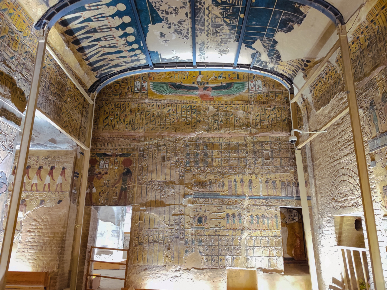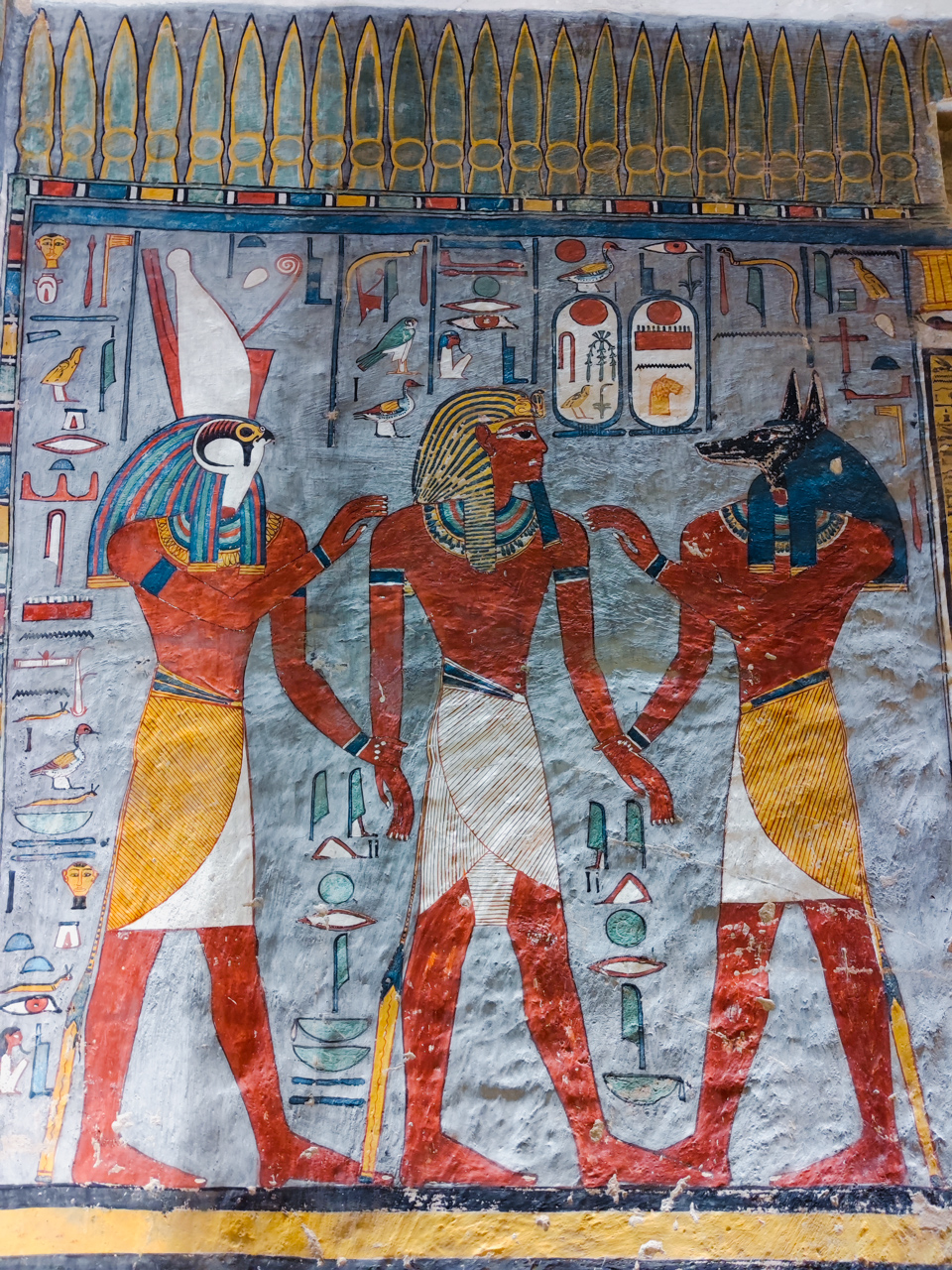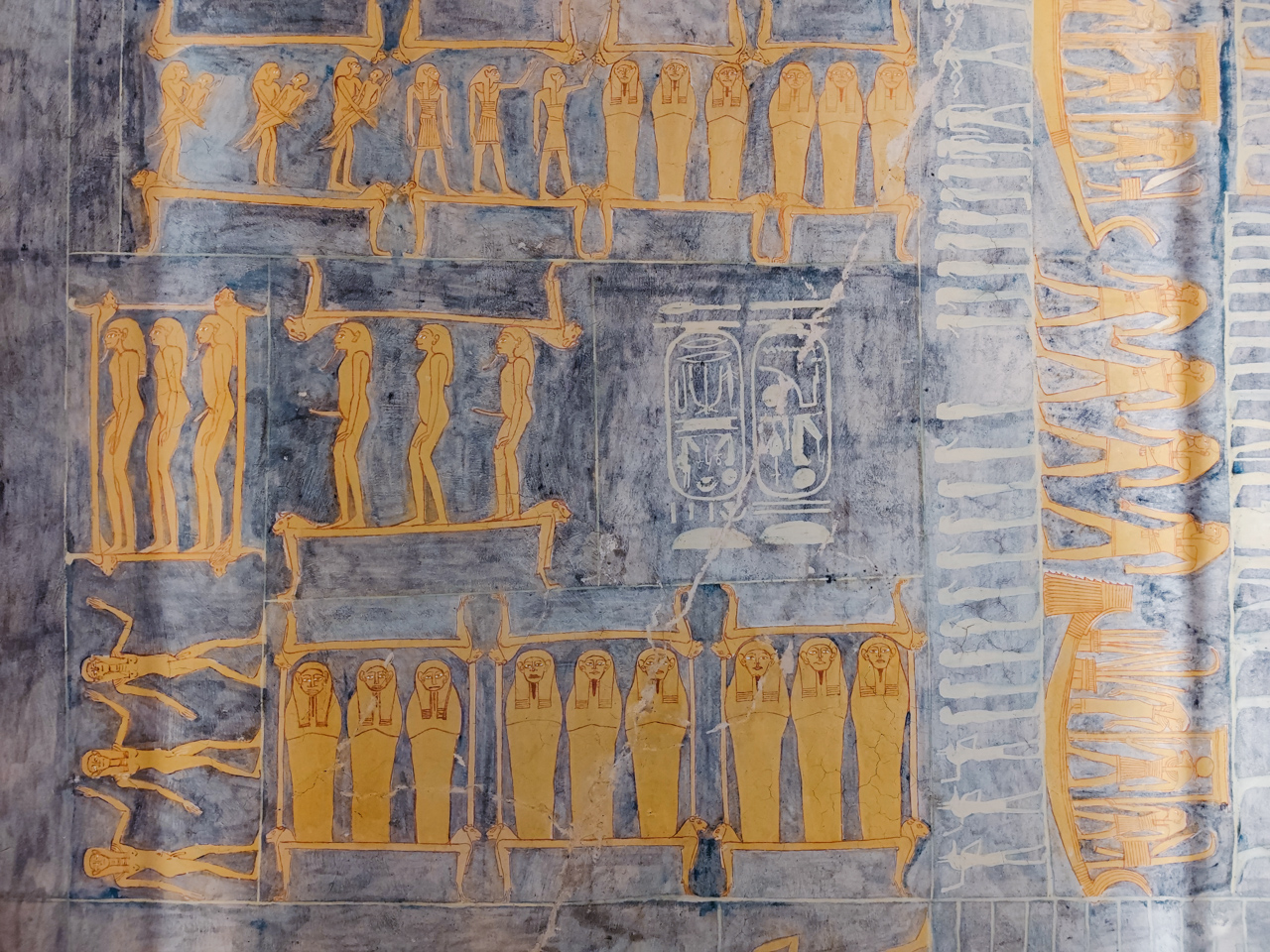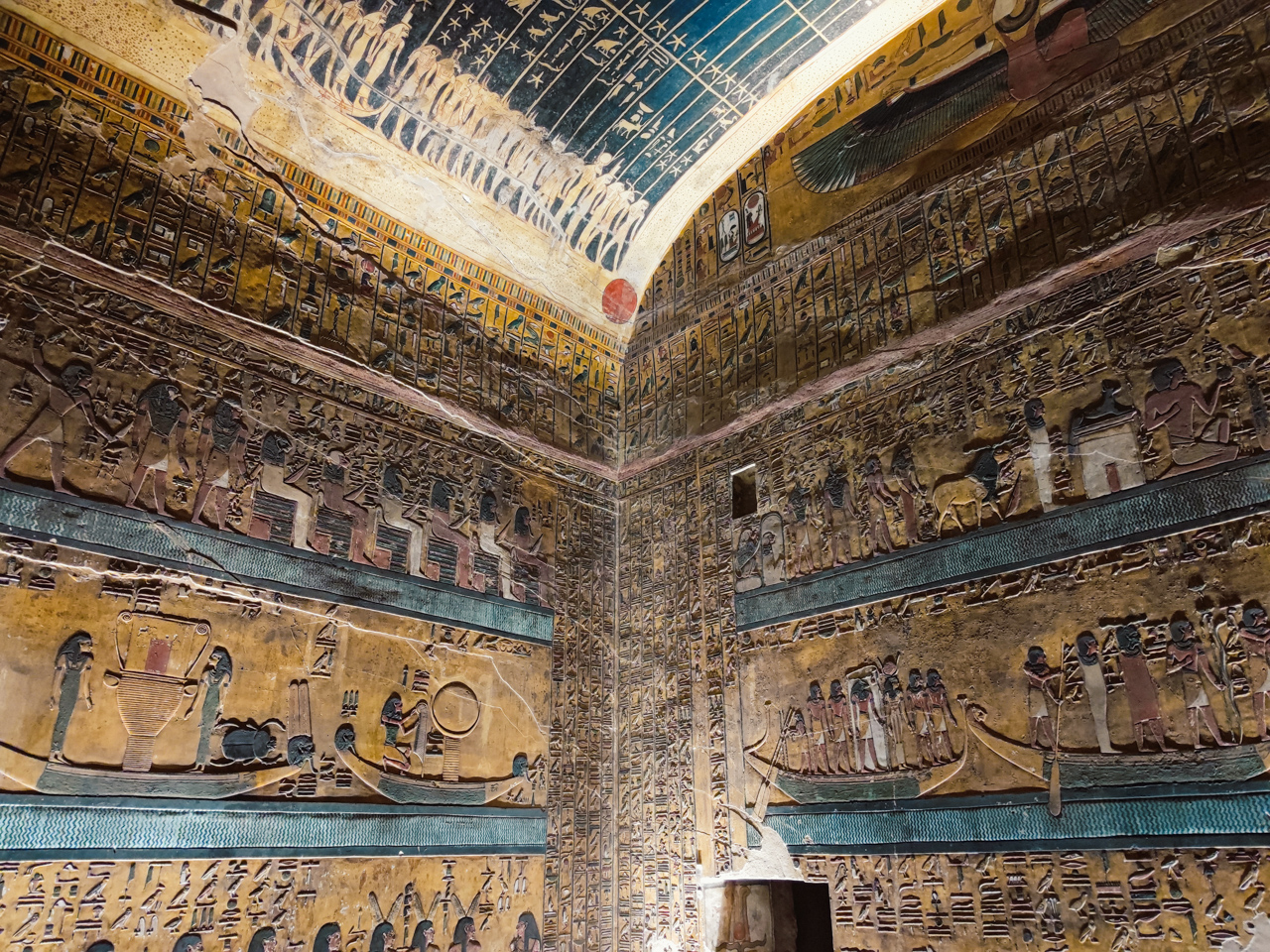 On ne veut pas partir, on a envie d’en voir plus après la visite libre de trois tombes. On retourne au guichet pour racheter une entrée pour la tombe de Seti Ier, environ 50 euro par personne pour une seule tombe, mais on se dit que l’on a peu de chances de revenir donc on veut voir la plus belle. Il n’y a personne dans cette tombe, qui est très profonde, avec une profusion de couleurs et de détails.