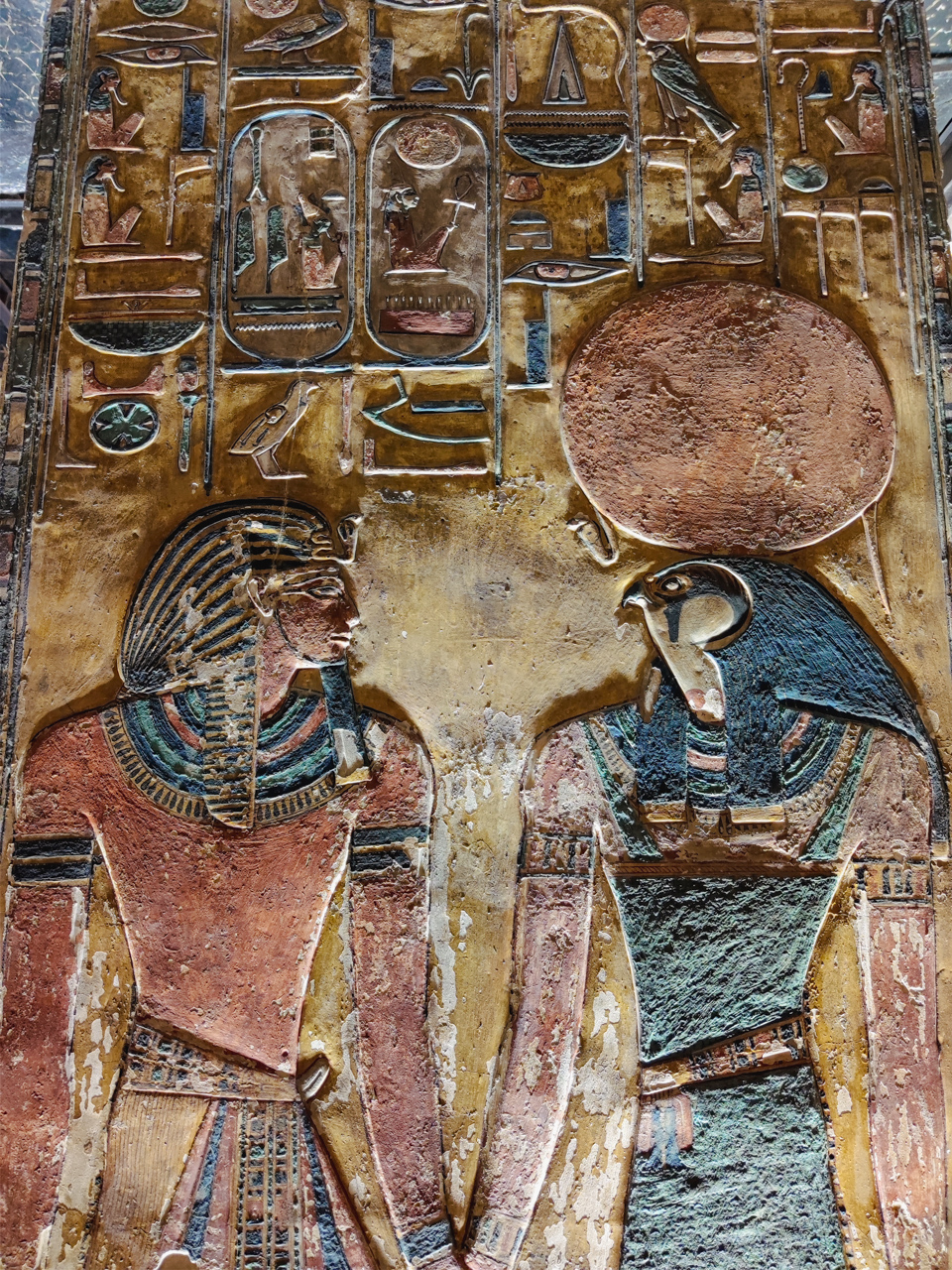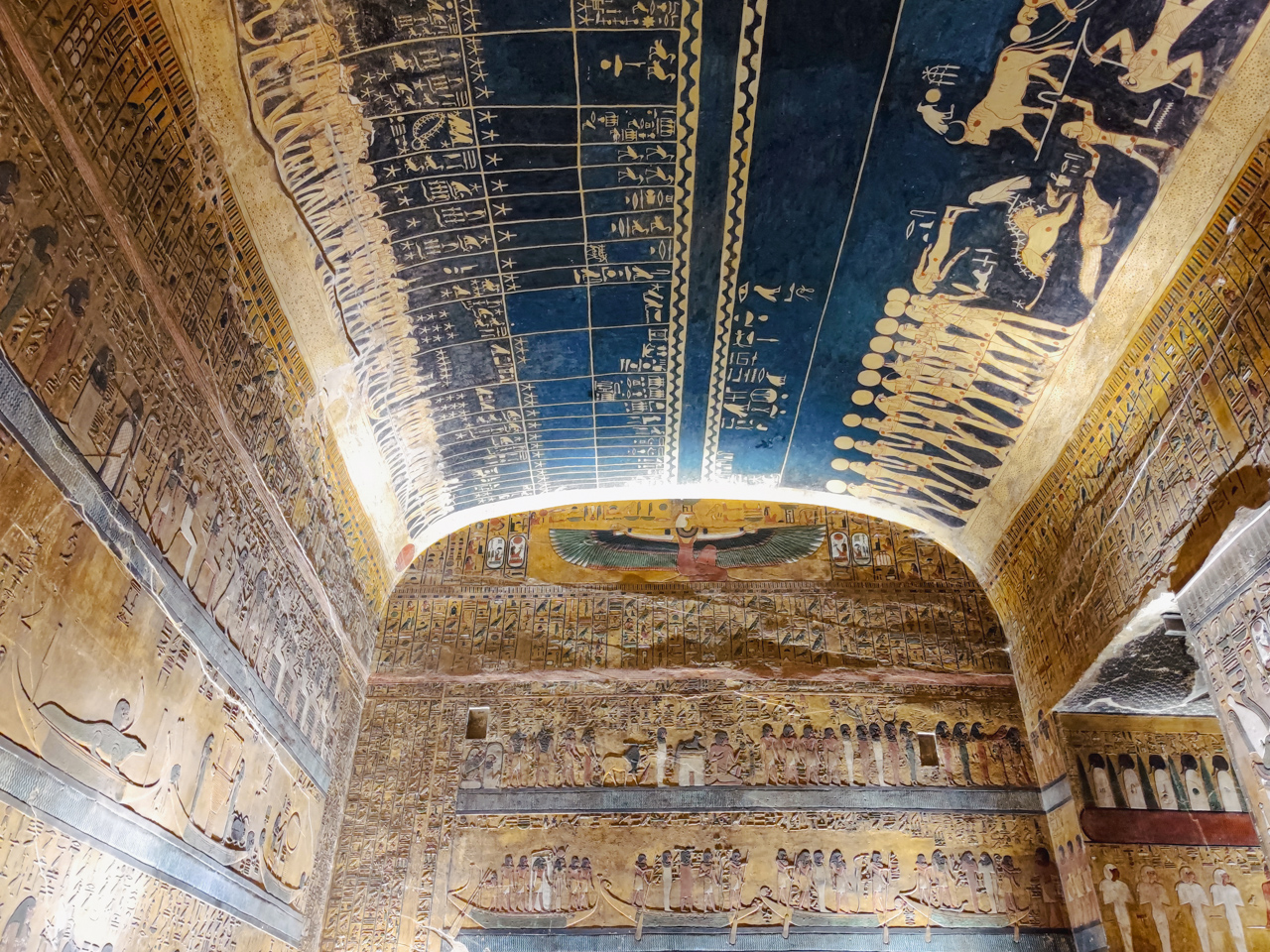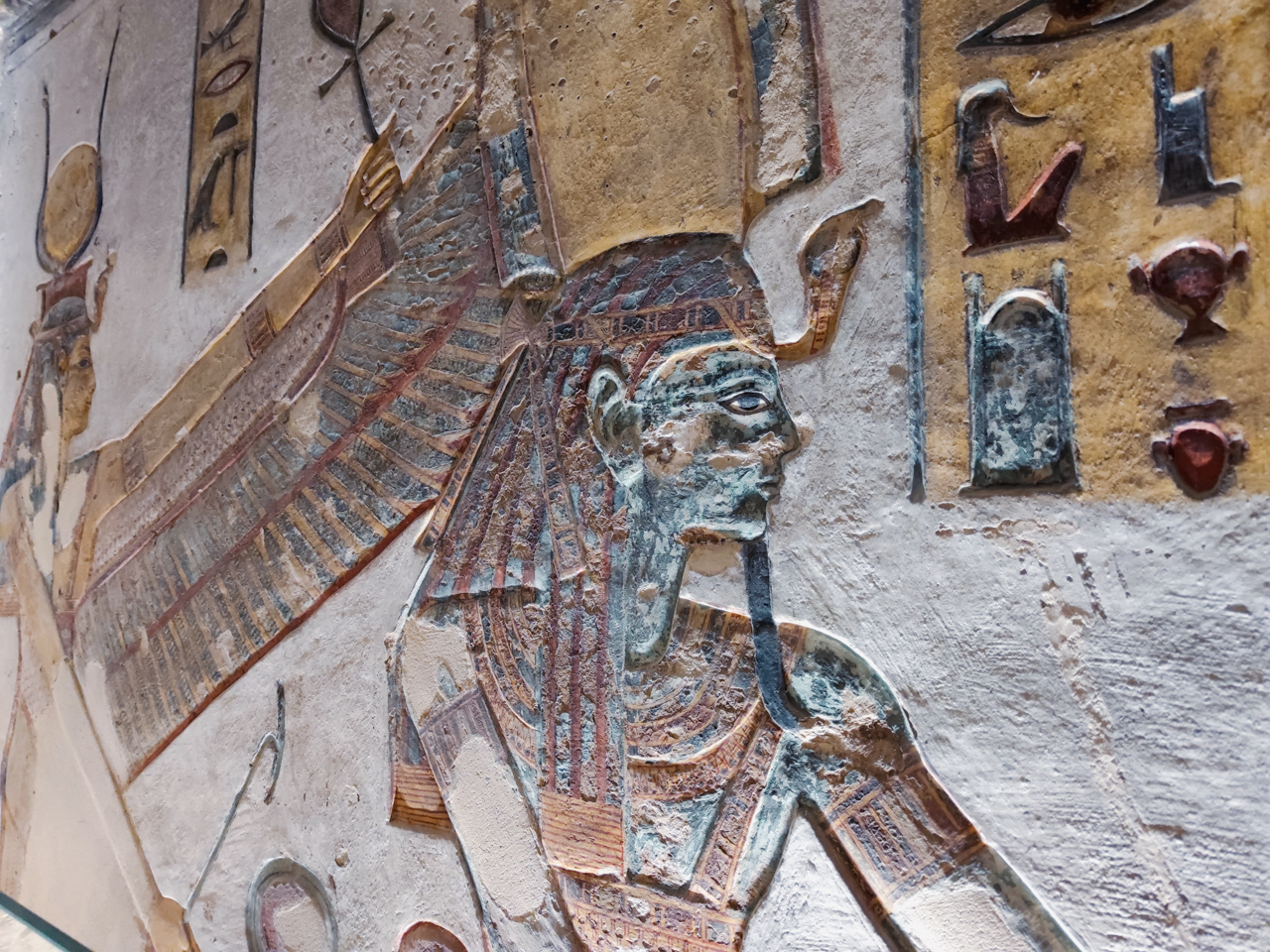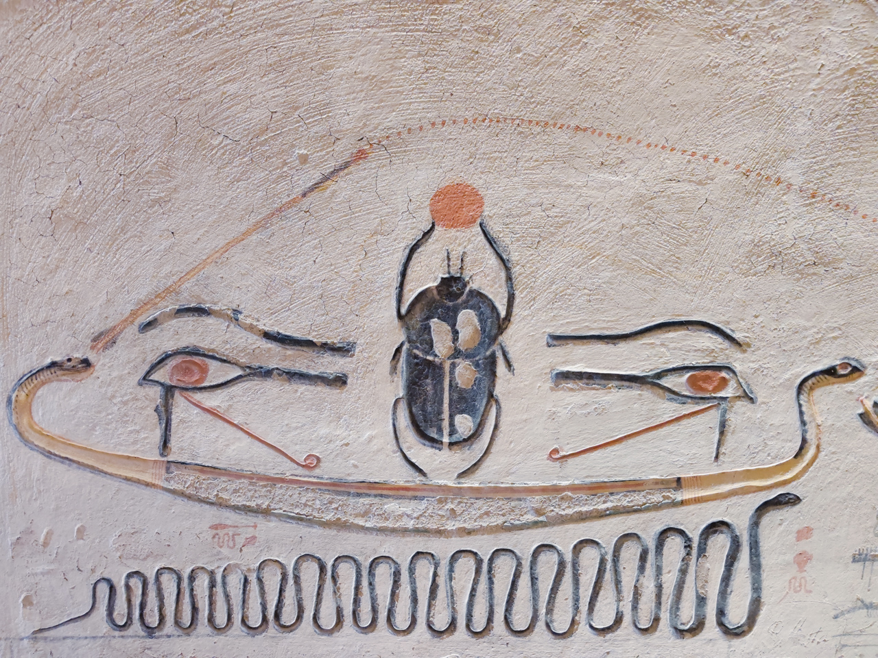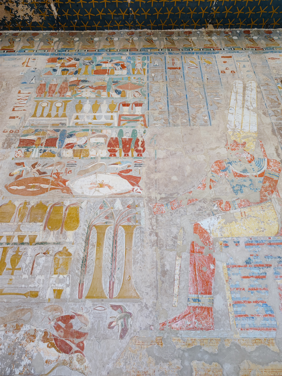 On ne veut pas partir, on a envie d’en voir plus après la visite libre de trois tombes. On retourne au guichet pour racheter une entrée pour la tombe de Seti Ier, environ 50 euro par personne pour une seule tombe, mais on se dit que l’on a peu de chances de revenir donc on veut voir la plus belle. Il n’y a personne dans cette tombe, qui est très profonde, avec une profusion de couleurs et de détails.