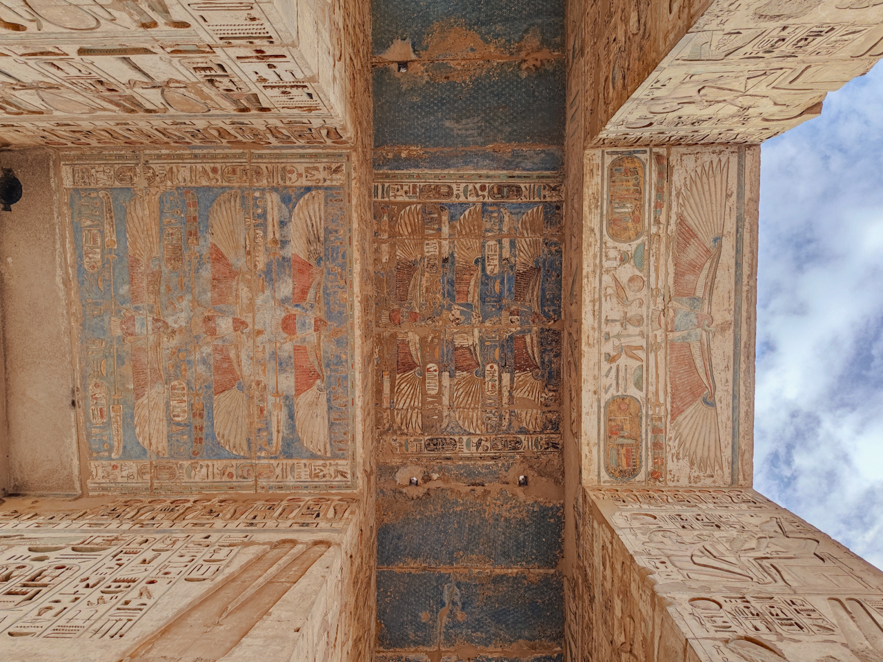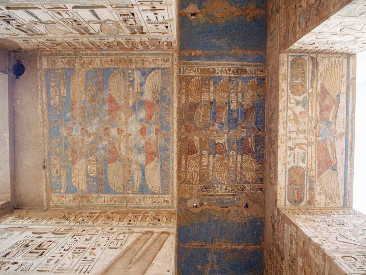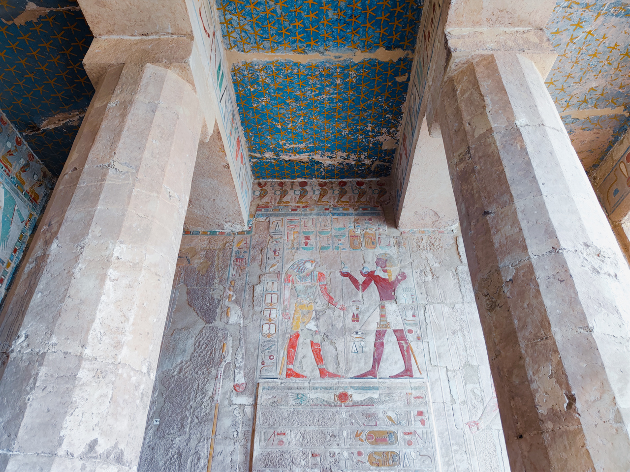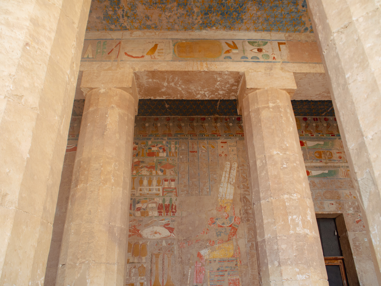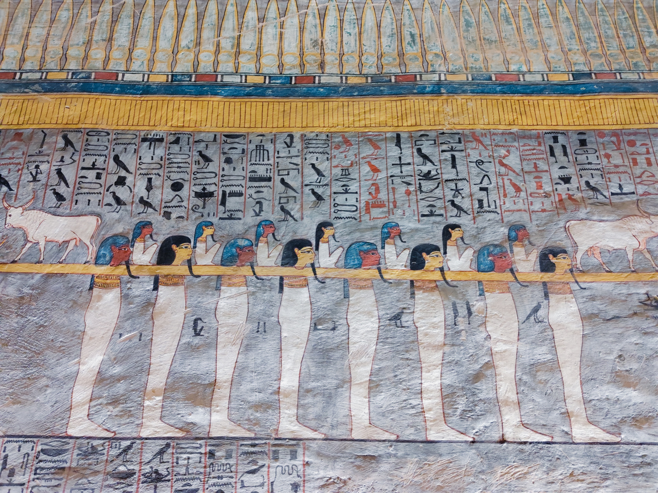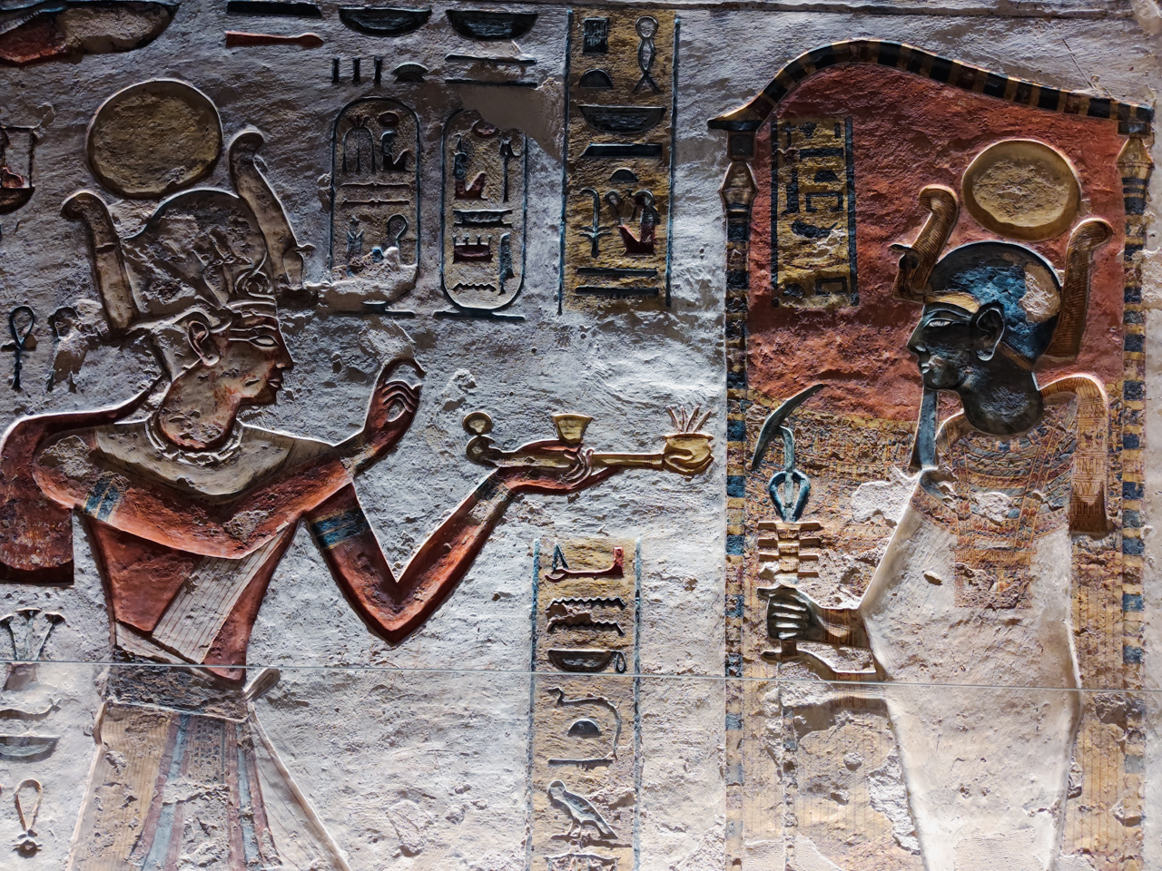 On ne veut pas partir, on a envie d’en voir plus après la visite libre de trois tombes. On retourne au guichet pour racheter une entrée pour la tombe de Seti Ier, environ 50 euro par personne pour une seule tombe, mais on se dit que l’on a peu de chances de revenir donc on veut voir la plus belle. Il n’y a personne dans cette tombe, qui est très profonde, avec une profusion de couleurs et de détails.