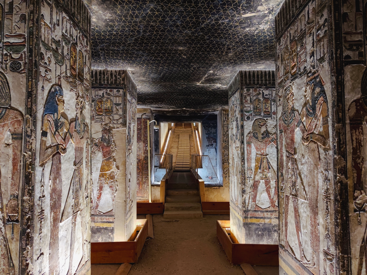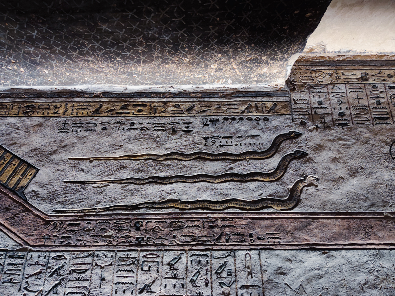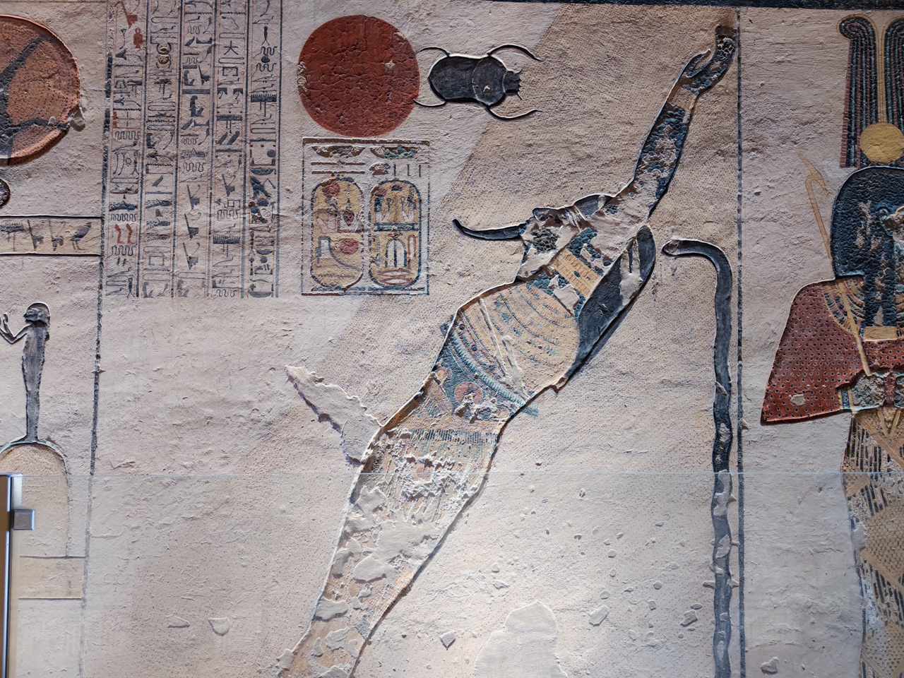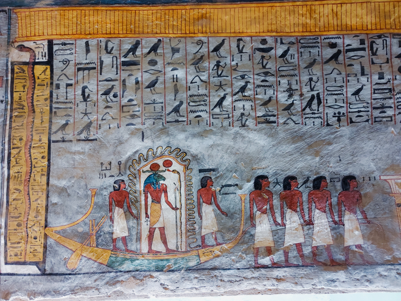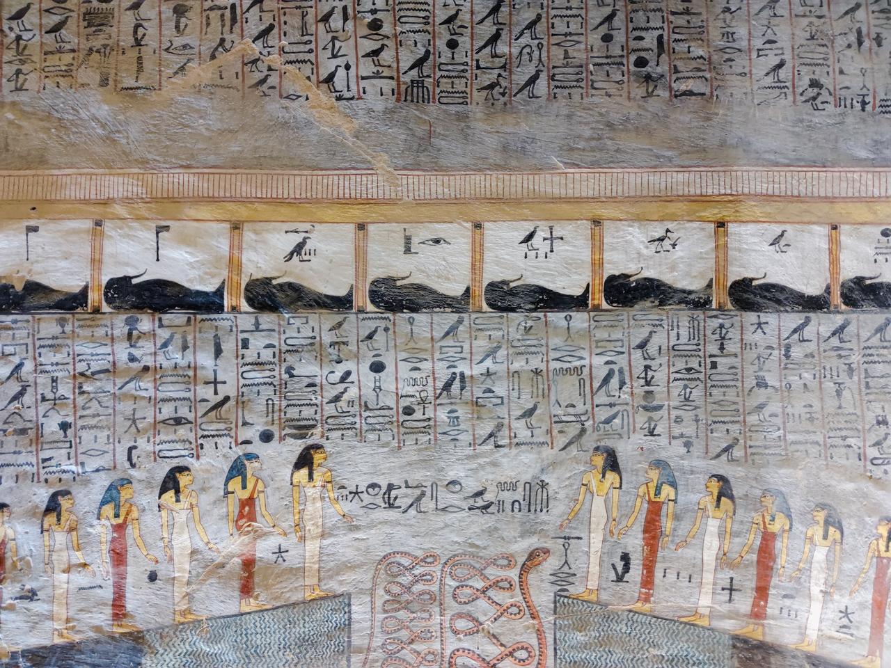 On ne veut pas partir, on a envie d’en voir plus après la visite libre de trois tombes. On retourne au guichet pour racheter une entrée pour la tombe de Seti Ier, environ 50 euro par personne pour une seule tombe, mais on se dit que l’on a peu de chances de revenir donc on veut voir la plus belle. Il n’y a personne dans cette tombe, qui est très profonde, avec une profusion de couleurs et de détails.