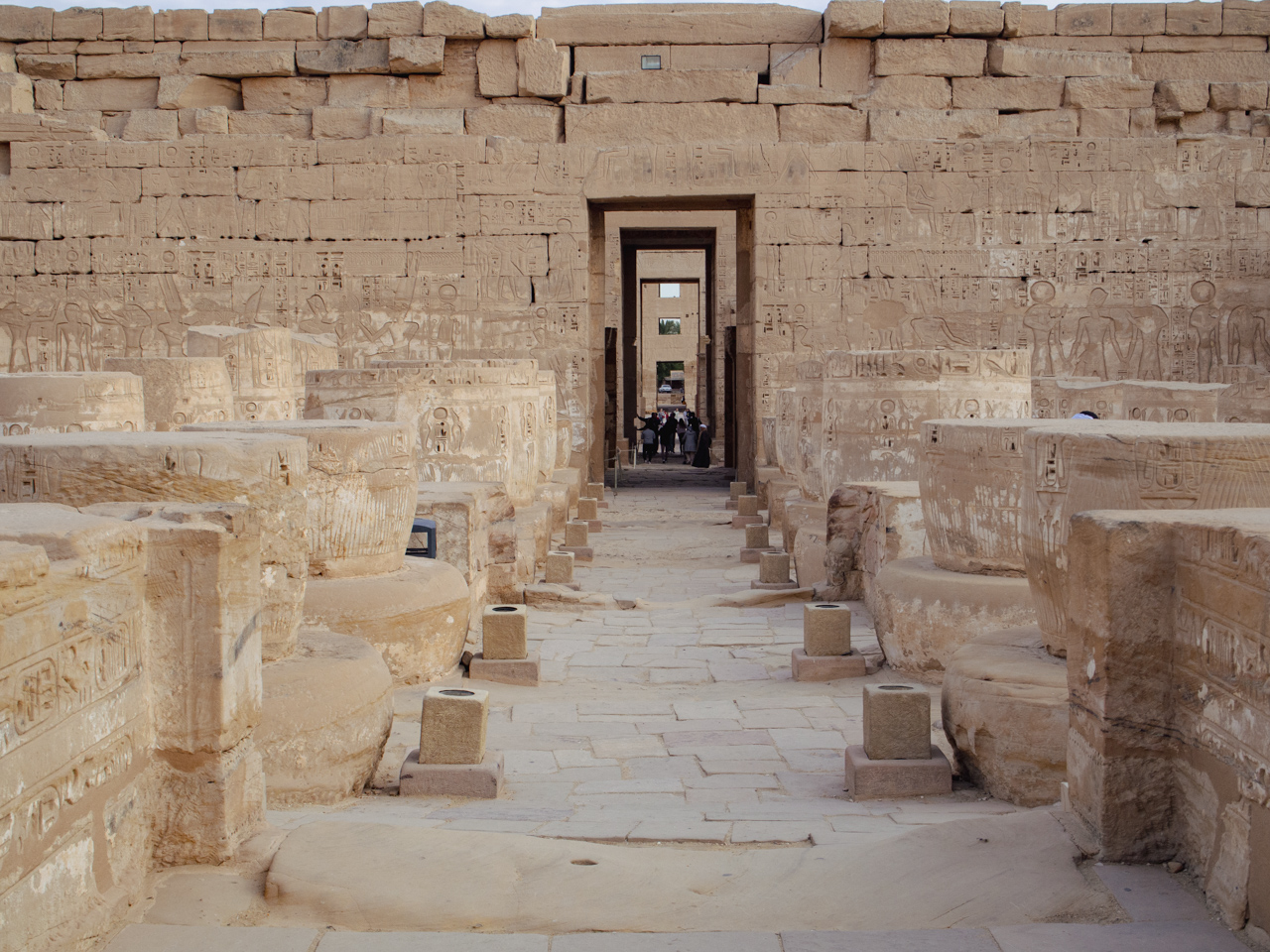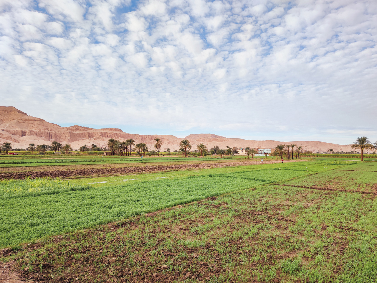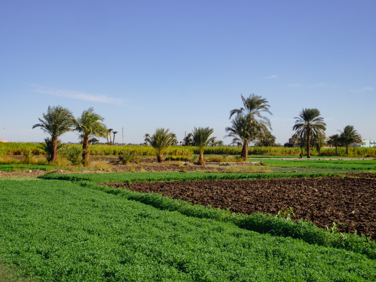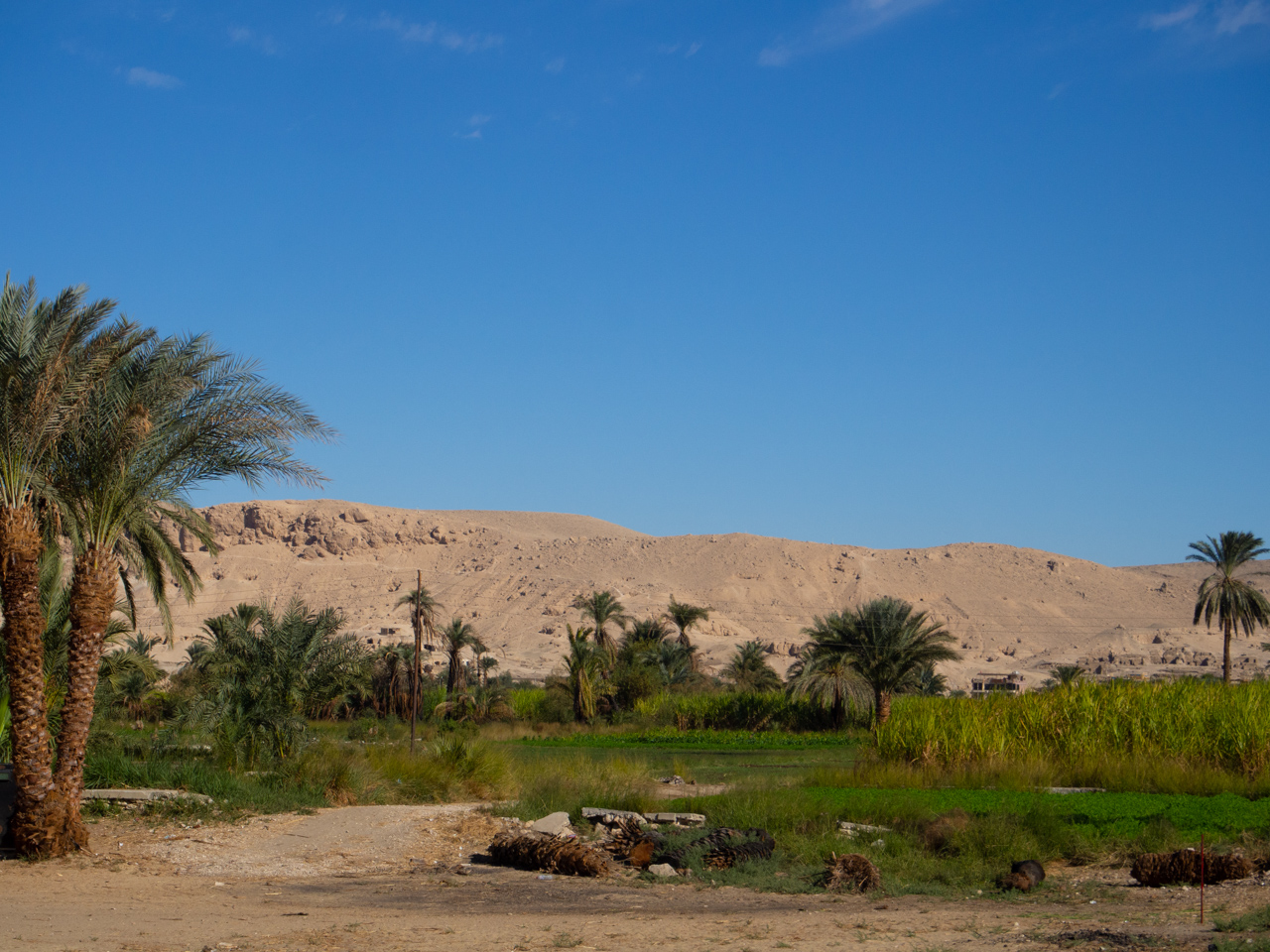 Le paysage est très bucolique, l’oasis autour du Nil est d’un vert magnifique, un peu plus loin des femmes étendent les récoltes de tomates pour les sécher. On a du mal à imaginer que pendant l’Antiquité se trouvait ici l’entrée d’un immense temple.