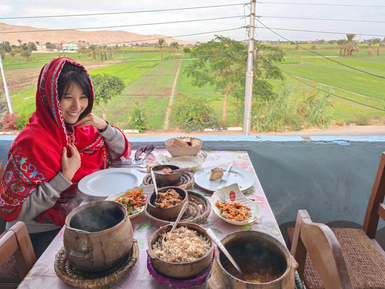 Comme ce matin nous avons pris un énorme petit déjeuner, ce n’est qu’en milieu d’après midi que l’on se décide à manger quelque chose. Ahmed nous amène devant un restaurant qui donne sur les plantations de l’oasis, la vue est superbe. On fait plus connaissance avec lui, il faut dire que ma chérie est très curieuse et lui pose pleins de questions pour comprendre un peu mieux les moeurs et habitudes des gens en Egypte.