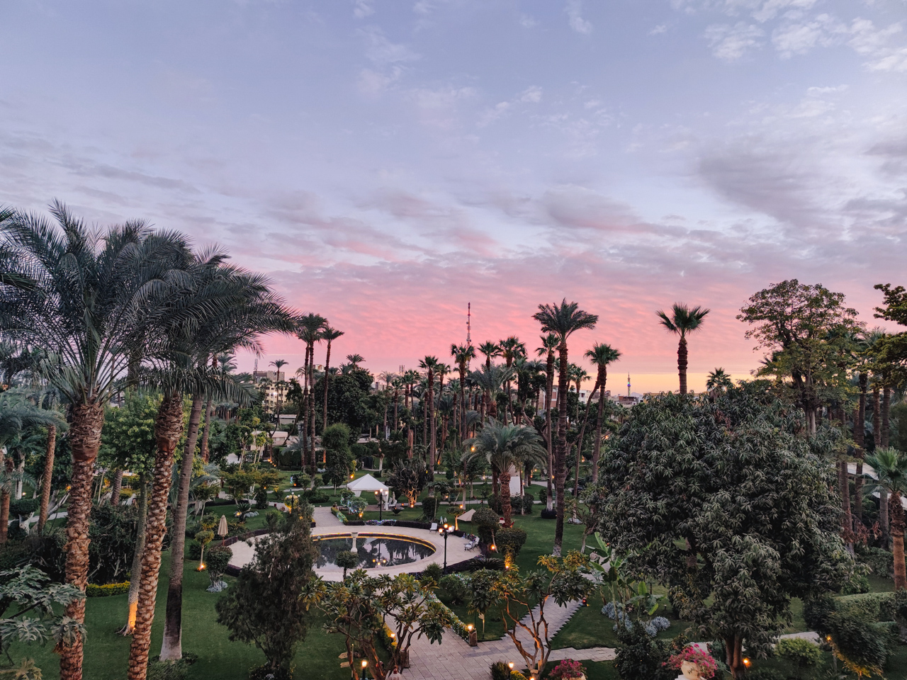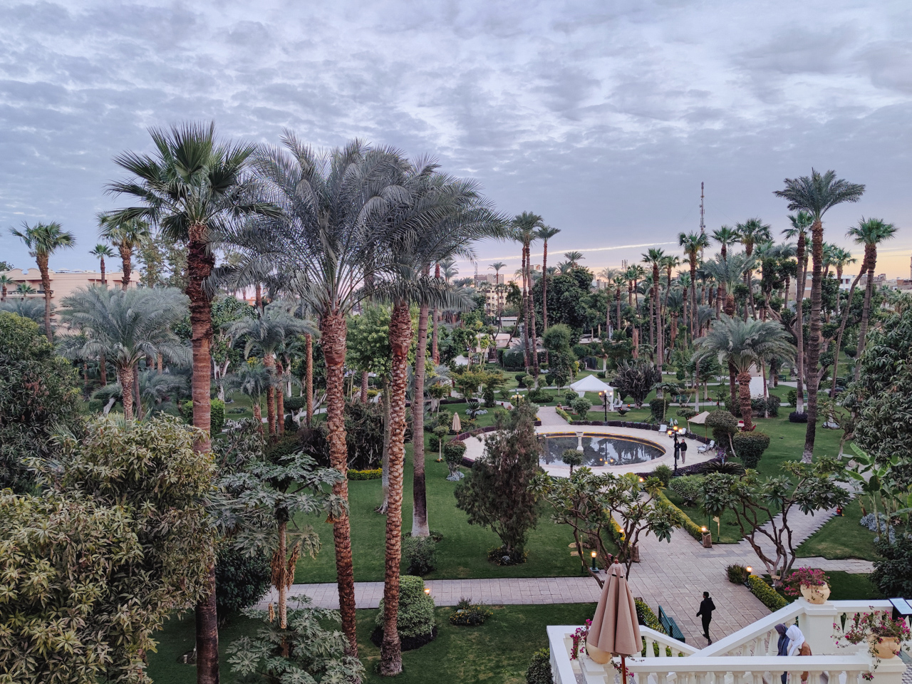 On se repose un moment sur le balcon de notre chambre de l’hôtel qui donne sur le grand jardin planté de palmiers.
