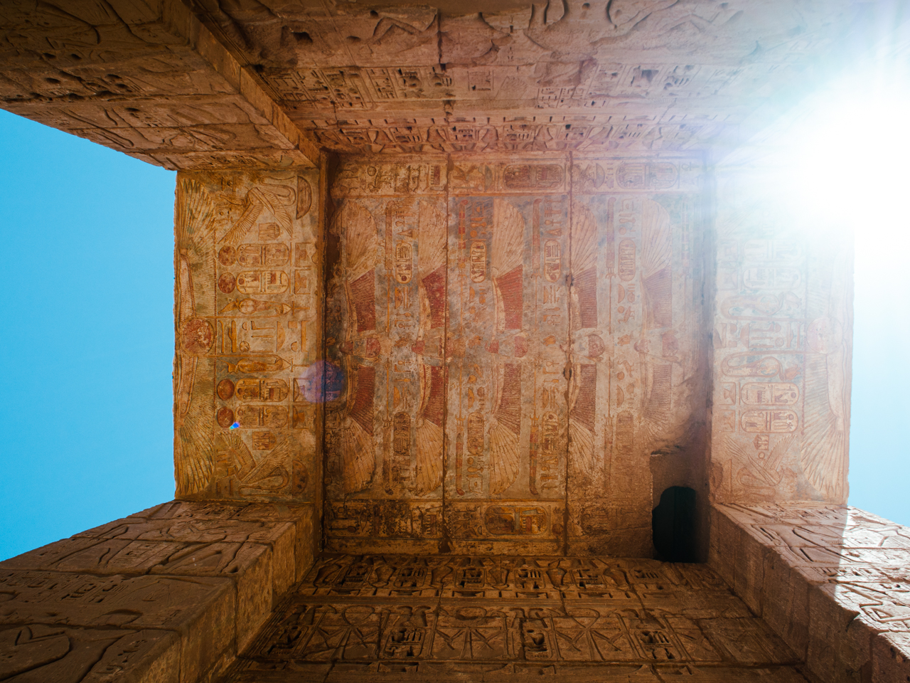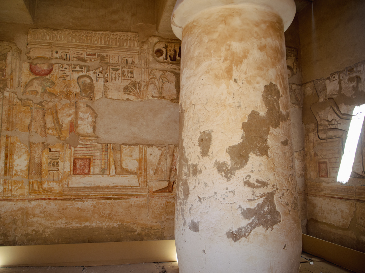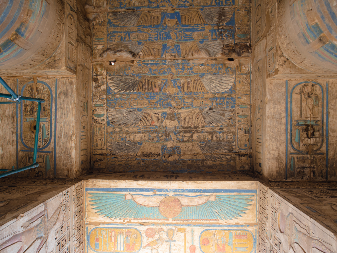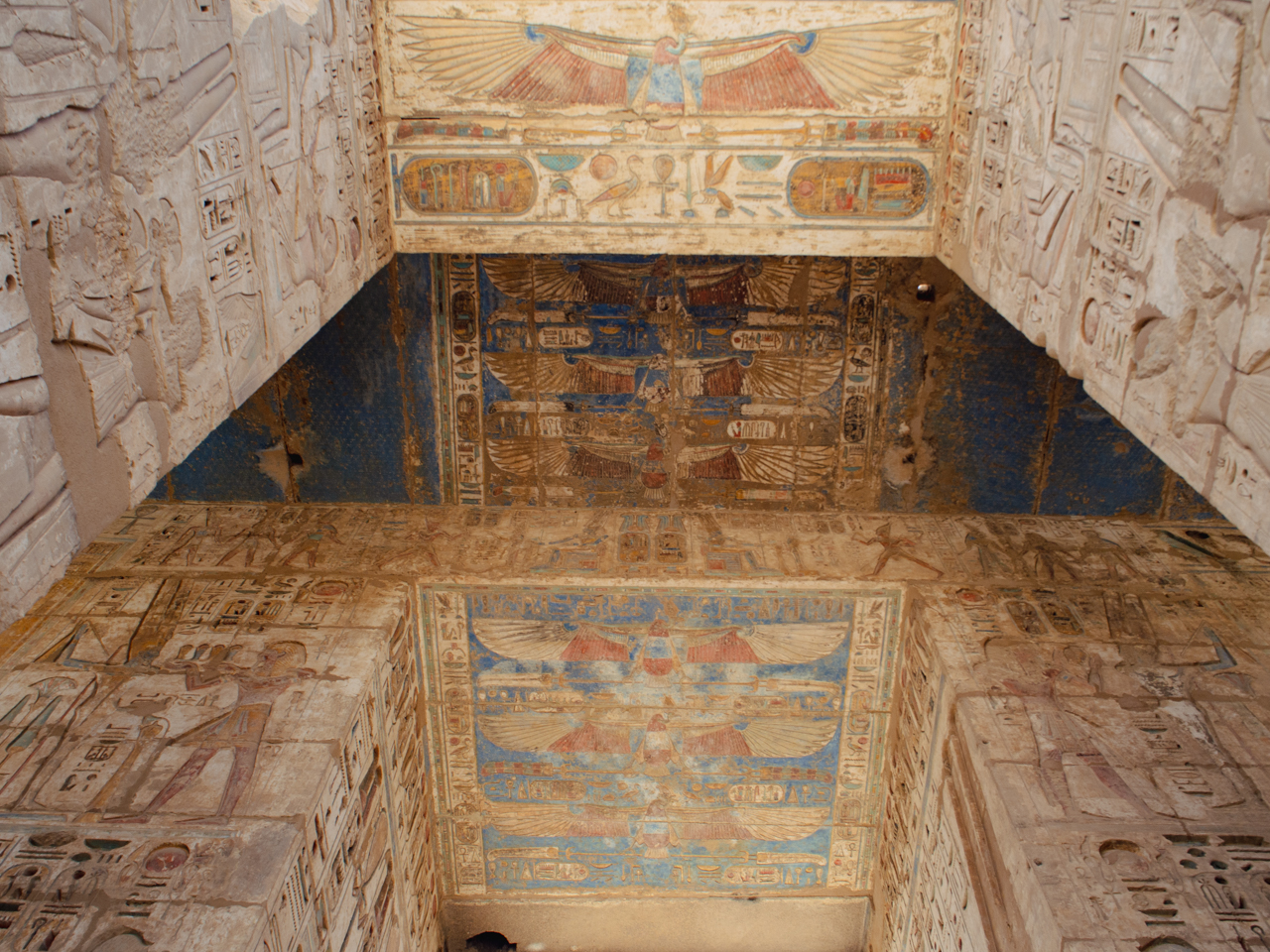 On peut voir de nombreux détails encore colorés dans les zones du temple abrités du contact direct avec le soleil, comme les plafonds ou sur les murs au Nord.