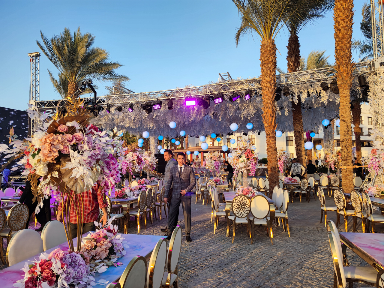 Nous rentrons un en find d‘après midi à l’hôtel car un mariage est prévu ce soir. Le réceptionniste nous avait prévenu le premier jour qu’il y aurait beaucoup de bruit et espérait que cela ne nous dérangerait pas. Il nous dit aussi que si l’on voulait, on pouvait participer à la fête, c’est la tradition en Egypte d’avoir des mariages ouverts. C’est donc pour cette raison que nous rentrons en avance à l’hôtel pour nous préparer car nous avons pris le réceptionniste au mot et on compte bien s’incruster. Le mariage est magnifique, dans l’espace extérieur de l’hôtel, face au Nil, avec une grande scène.