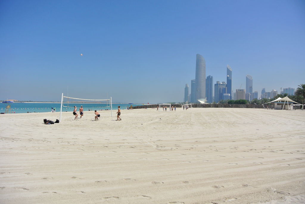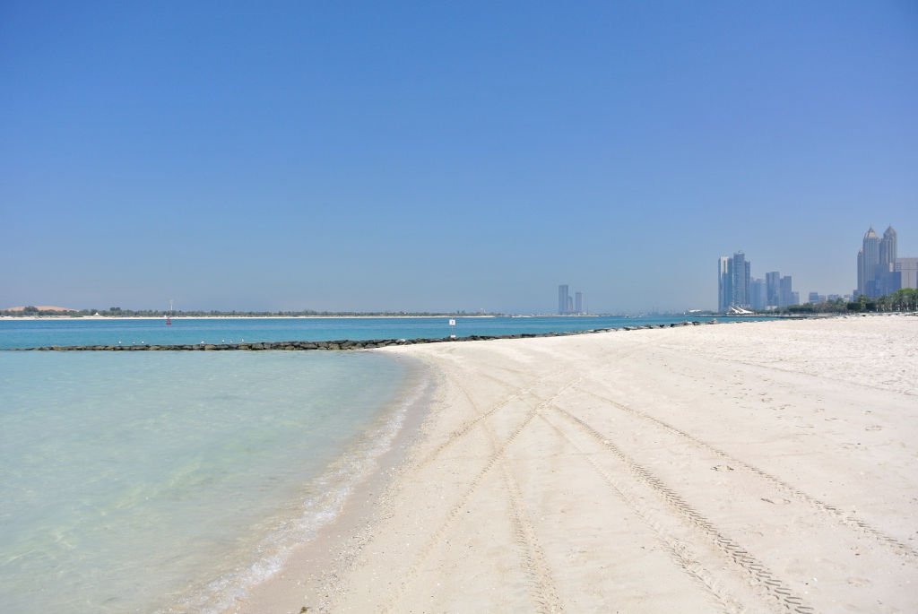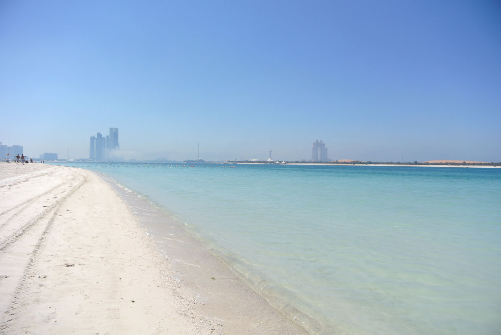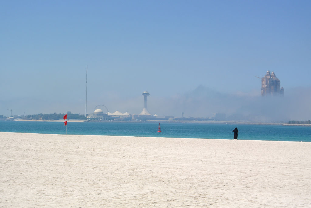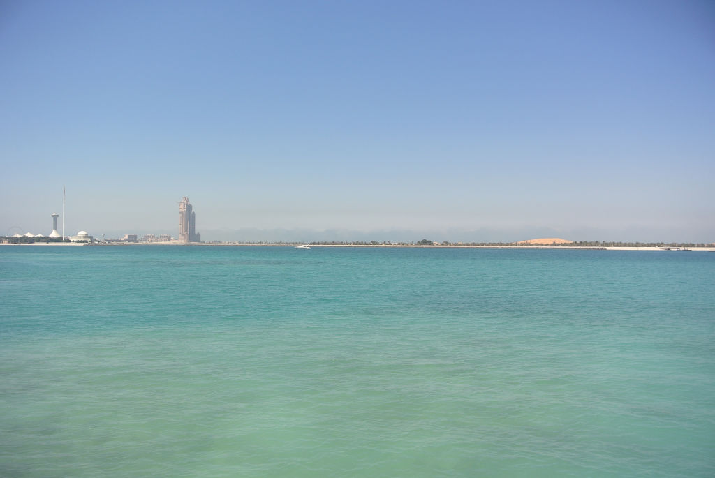 Je remarque que les routes d’Abu Dhabi sont toutes larges et la circulation est fluide, on voit que la ville a été configurée pour circuler en voiture. D’ailleurs les voitures sont pour la plupart rutilantes, énormes, et dans un état de propreté parfait. On est vraiment dans le cliché de ces monarchies du Golfe qui bénéficie de la manne pétrolière. Toutefois je suis quand même étonné des limitations de vitesse aussi basses, ça doit quand même être frustrant de rouler sur une autoroute à 2x6 voies limitée à 120km/h quand on roule en Lamborghini. Tout le long de la promenade, on accède à des plages au sable fin, elles sont soient publiques ou privées, très bien équipées, et permettent de se baigner dans l’eau chaude face aux tours.