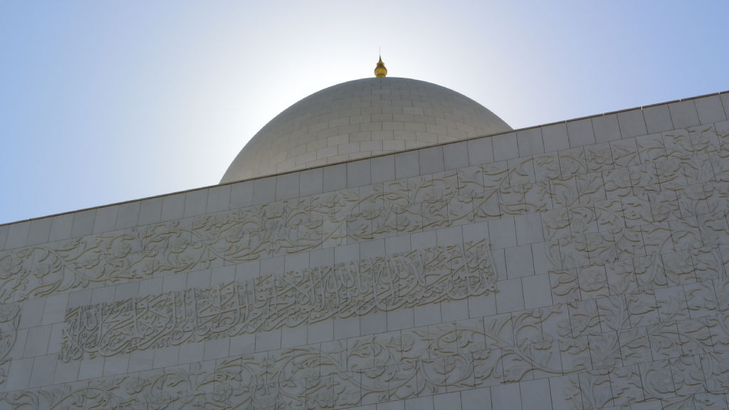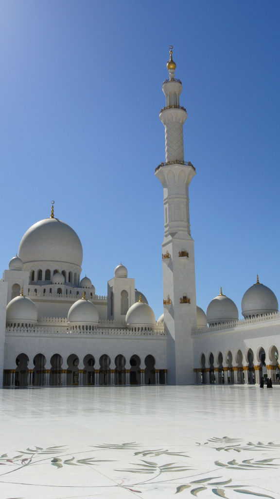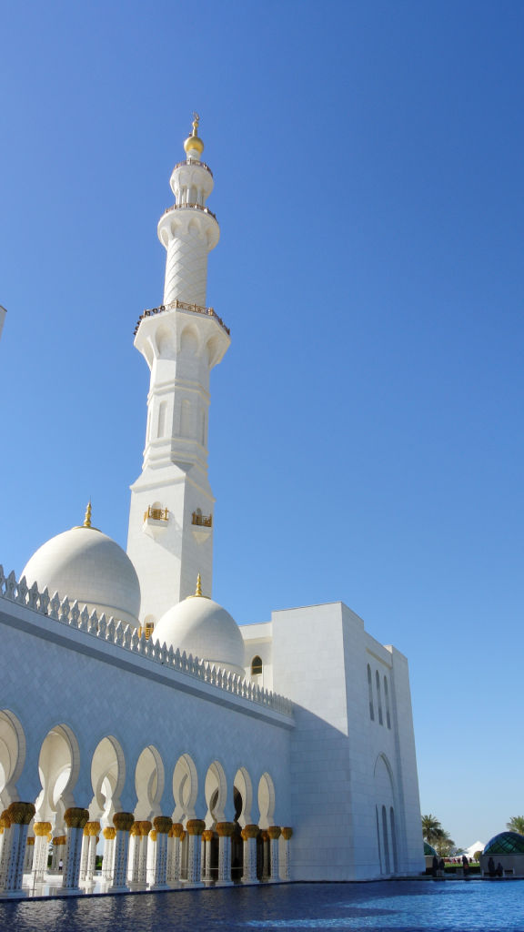 En fin d’après midi, il me reste un peu de temps et je ne ressens pas encore trop la fatigue du décalage horaire, alors je décide d’aller visiter le monument le plus emblématique d’Abu Dhabi, la Grande Mosquée Zayed, à l’entrée de la ville. Cet édifice religieux a des dimensions monumentales, sur l’autoroute déjà on aperçoit de loin ces hauts minarets et les bulbes de ses dômes.