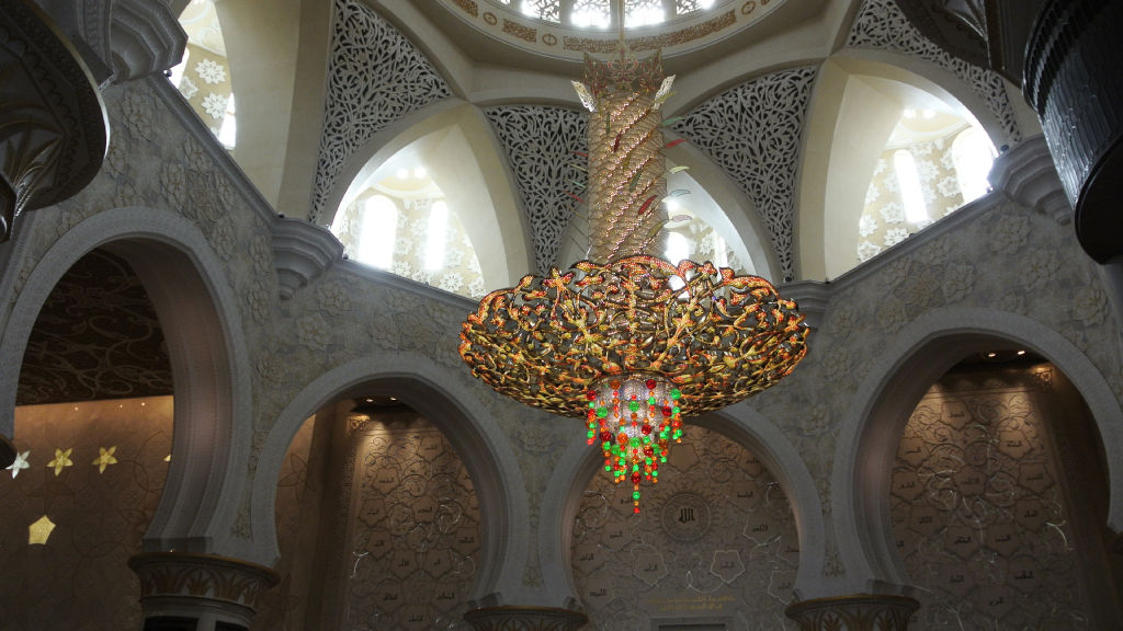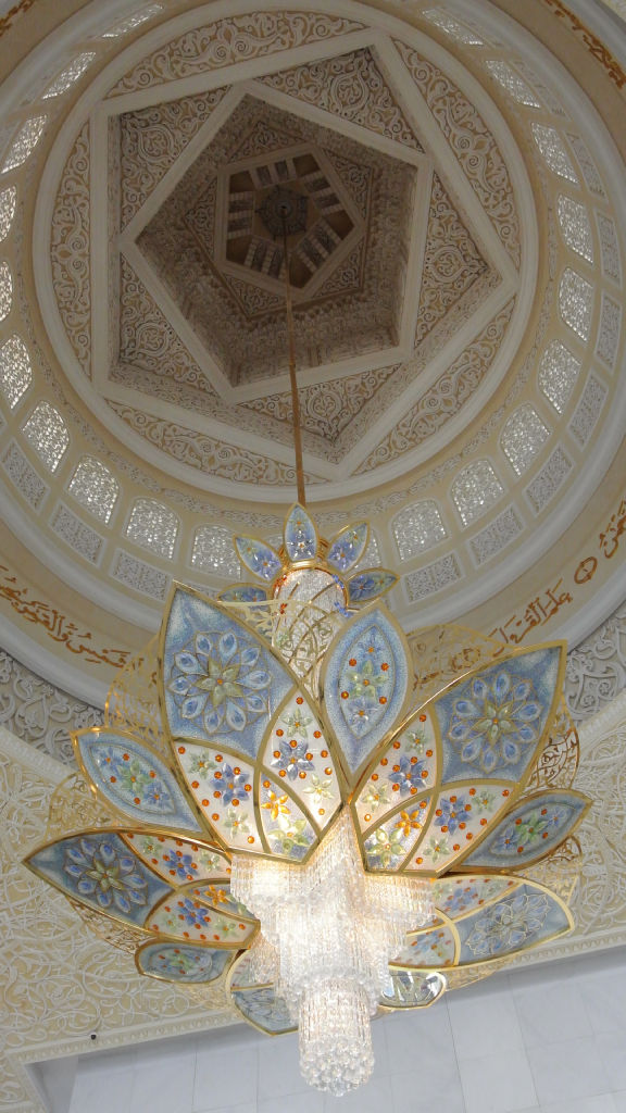 L’intérieur de la salle de prière est autant extraordinaire, sous les dômes sont suspendus des chandeliers immenses. Le tapis de prière a été fait d’un seul tenant à la main en Iran.