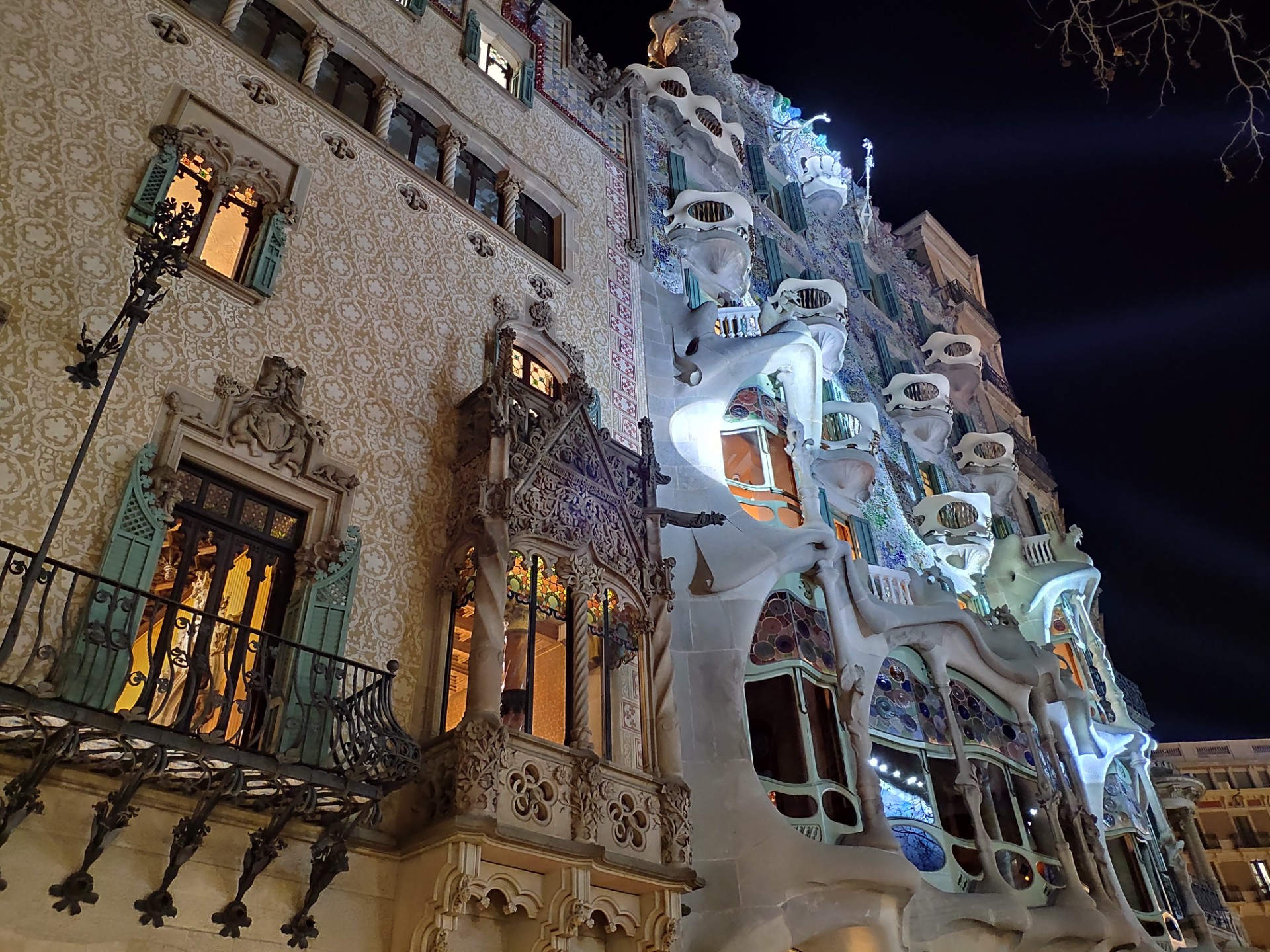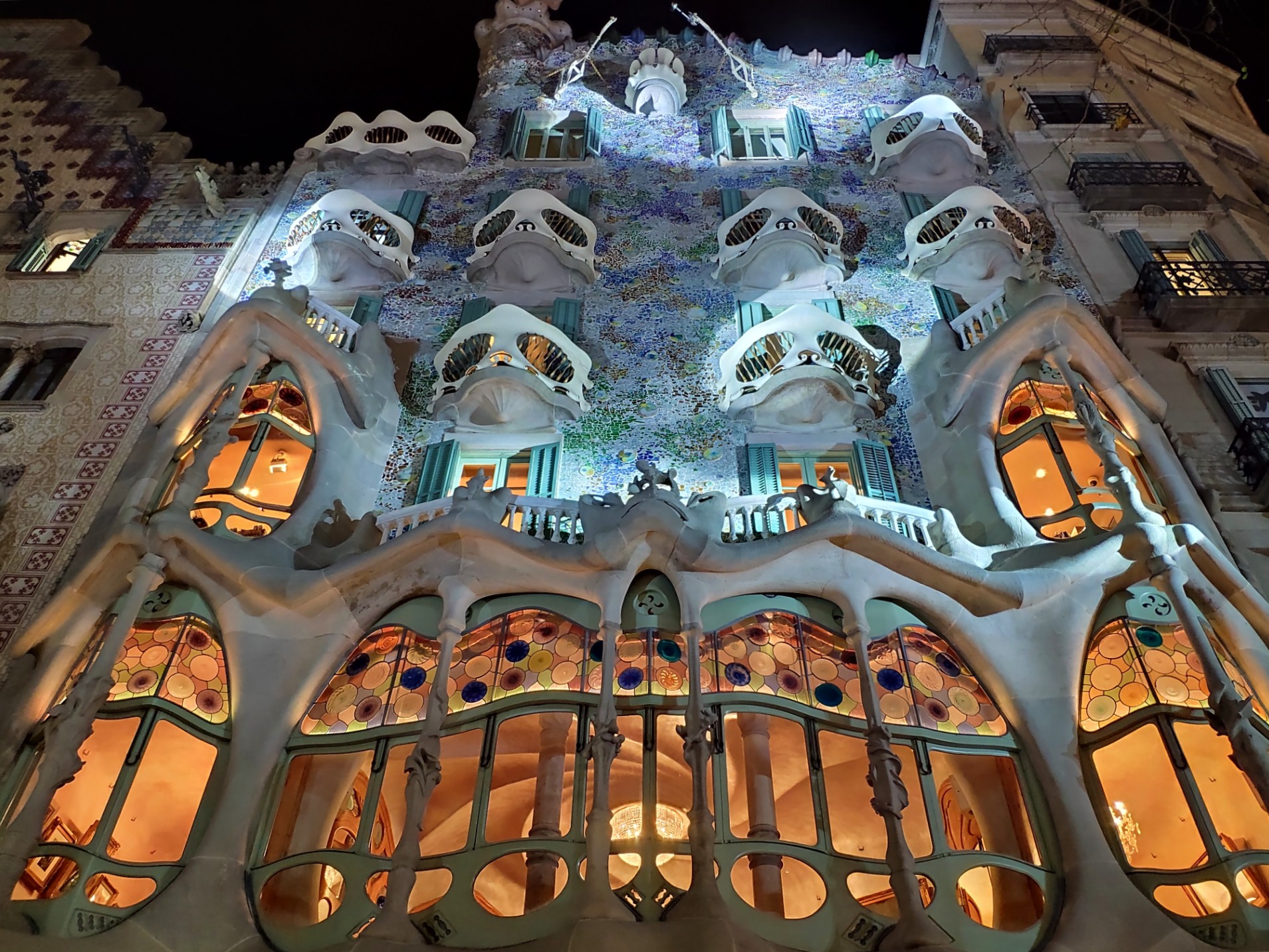 Le vol de Genève est vraiment court, un peu plus d’une heure de survol du Sud de la France en passant des cimes enneigées des Alpes au bleu de la Méditerranée. Nous avons réservé un billet d’aérobus qui nous dépose à la place d’Espagne puis nous prenons le métro pour notre hôtel. Alors que la nuit tombe, nous allons manger dans un restaurant à tapas réputé du centre-ville. Ce sera notre premier restaurant à tapas du séjour et pas le dernier. Ensuite, on profite d’être à proximité des maisons de Gaudi pour voir si de nuit elles sont illuminées, effectivement de nuit la façade est éclairée et c’est vraiment très beau. C’est la première fois que je viens à Barcelone et jusqu’à maintenant j’avais vu les créations de Gaudi seulement à la télévision, en vrai on peut distinguer tellement de détails et avoir une vue d’ensemble, c’est vraiment magnifique.