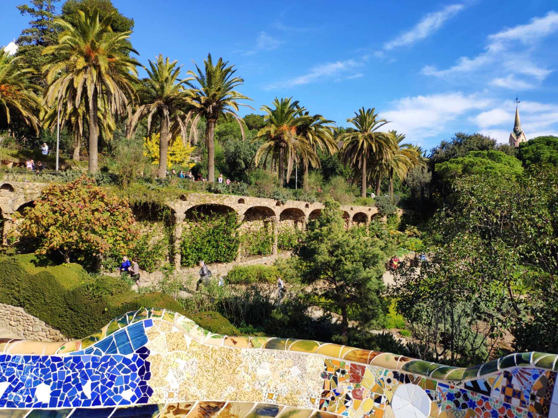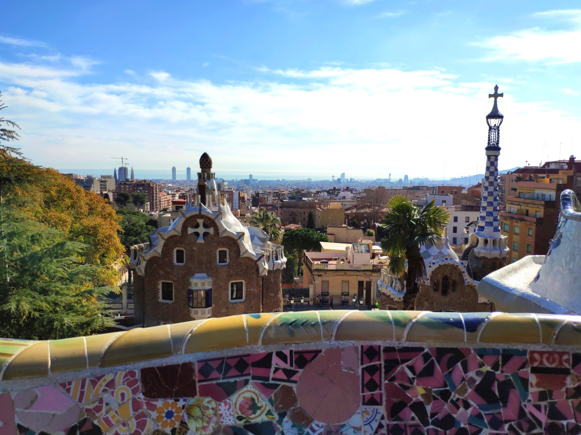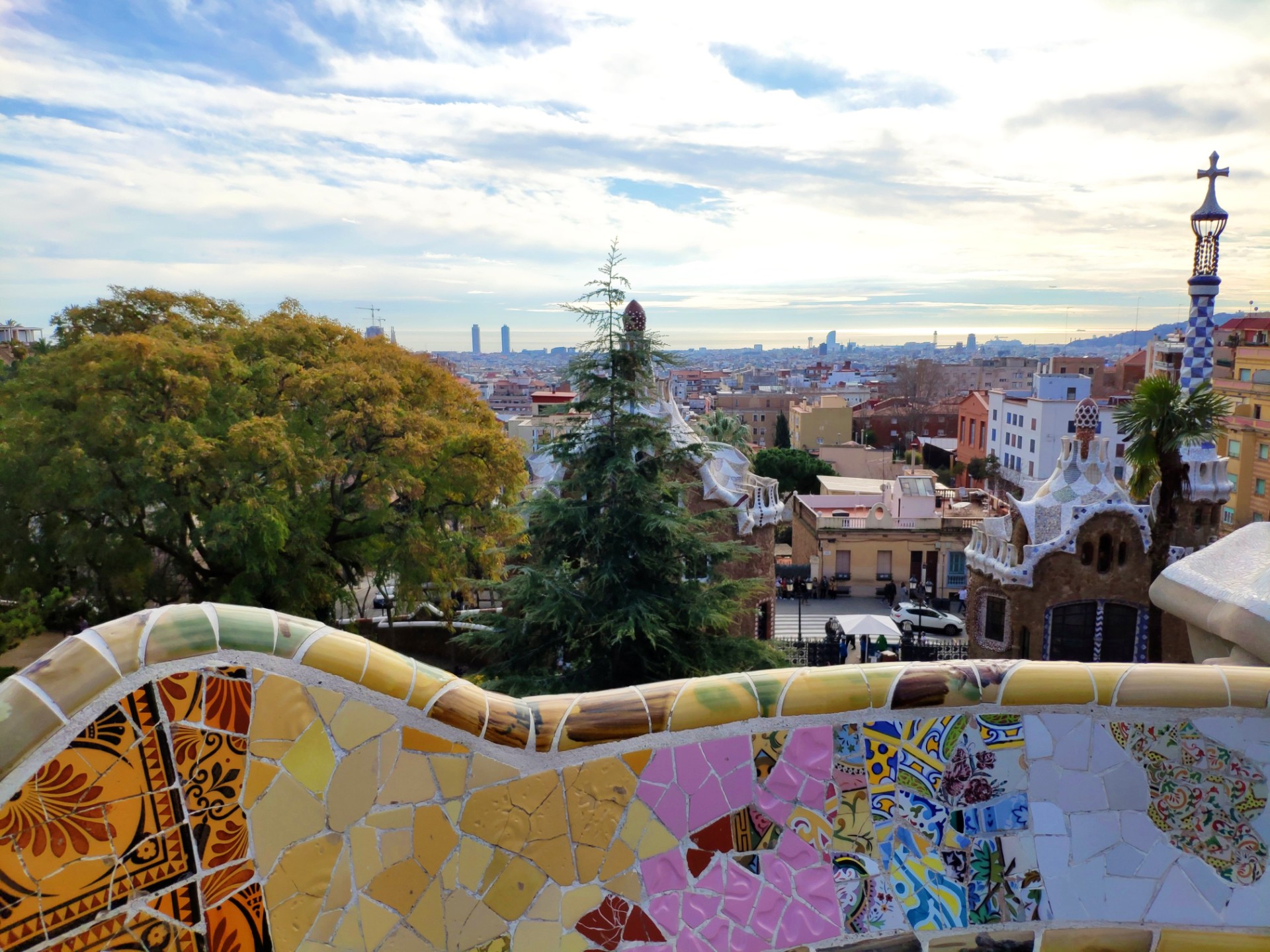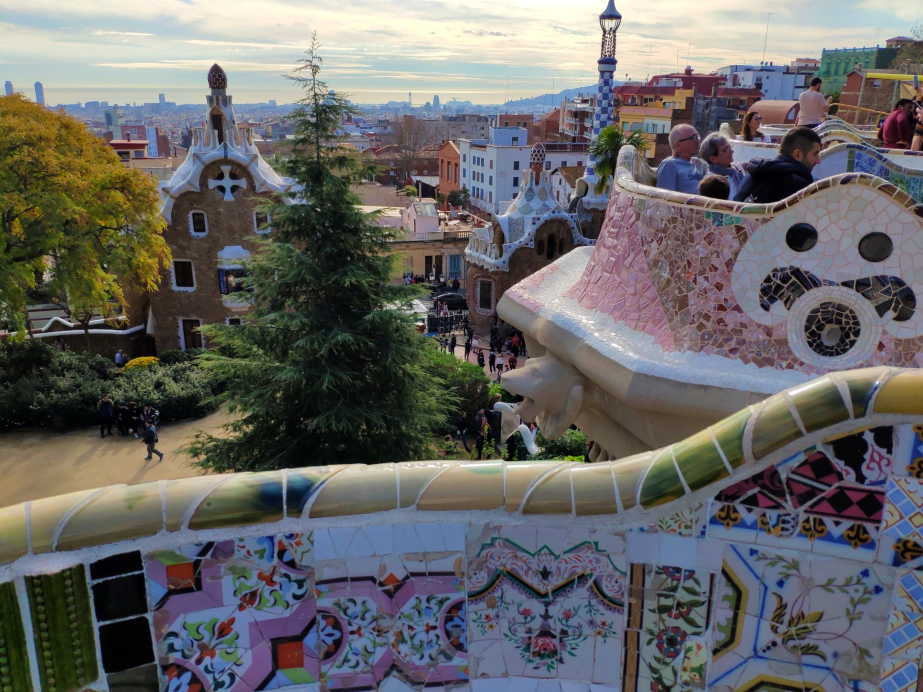 Pour cette journée, nous avons réservé en avance les tickets d’entrée pour les monuments de la ville, en effet nous avions lu un peu partout qu’il est conseillé de réserver son horaire de visite en avance pour être sûr d’avoir de la place et éviter de faire la queue. Comme nous ne sommes ici que pour deux jours, on s’est dit qu’il fallait que l’on optimise le temps, quelque chose que l’on a pas l’habitude de faire ne voyage, mais il faut bien s’adapter aux règles qui organise le tourisme de masse dont nous sommes des éléments nous aussi. Comme nous avons choisi dans les multiples packages disponibles celui qui inclus la Sagrada Familia, le parc Guel, il était possible d’avoir aussi l’accès au bus touristique qui fait le tour de la ville. Alors je n’avais pour ma part jamais été dans ce type de bus, mais bon on se dit que pourquoi pas jouer les touristes à fond et utiliser ce billet aujourd’hui. Ce matin, nous allons d’abord visiter le Parc Guel, ça tombe bien car le bus touristique a un arrêt juste devant notre hôtel et un autre arrêt au parc. Nous traversons la ville et avons un aperçu des différents monuments depuis les fenêtres du bus