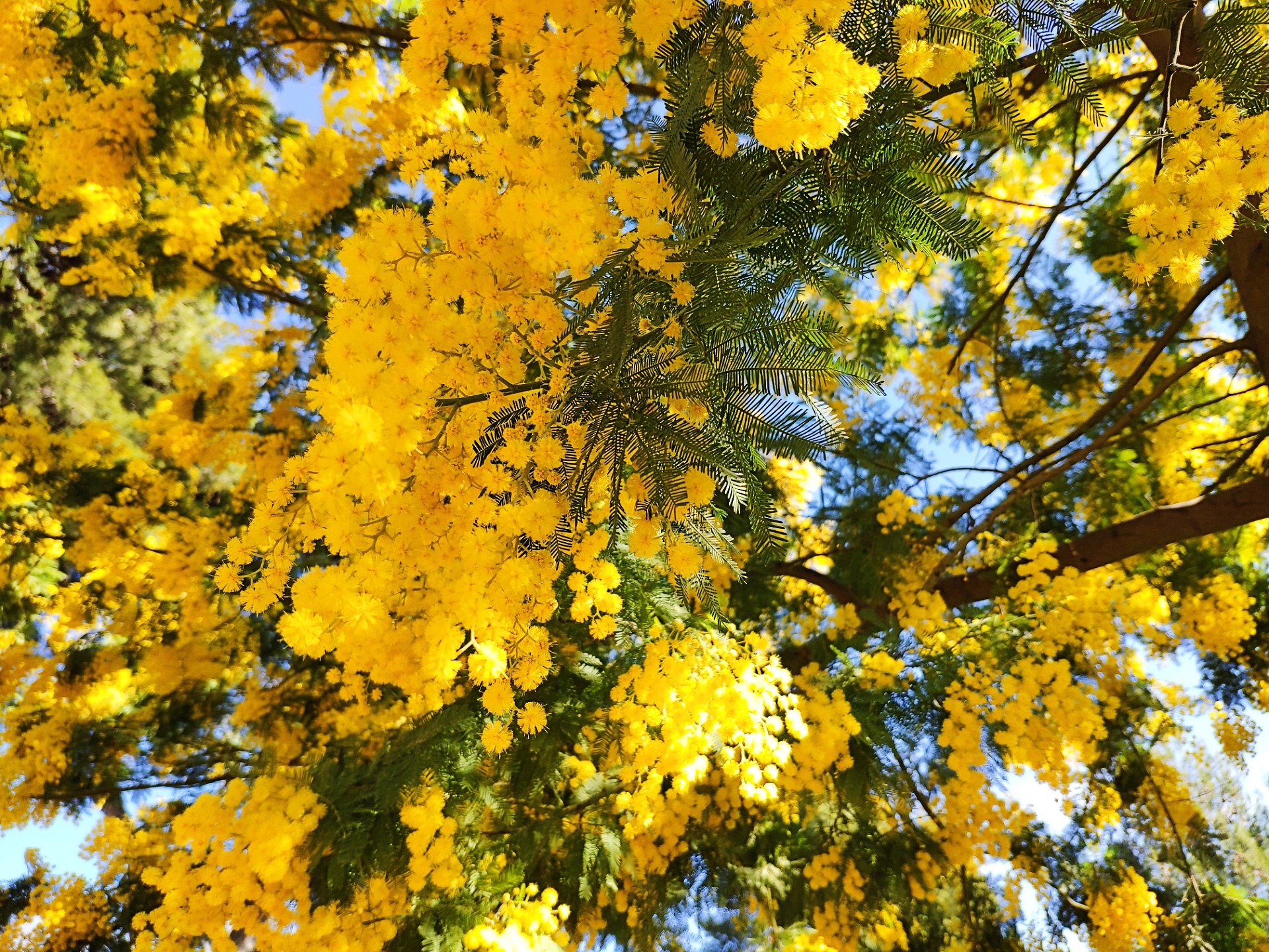 Le parc est très arboré avec des palmiers et des mimosas qui sont en pleine floraison.