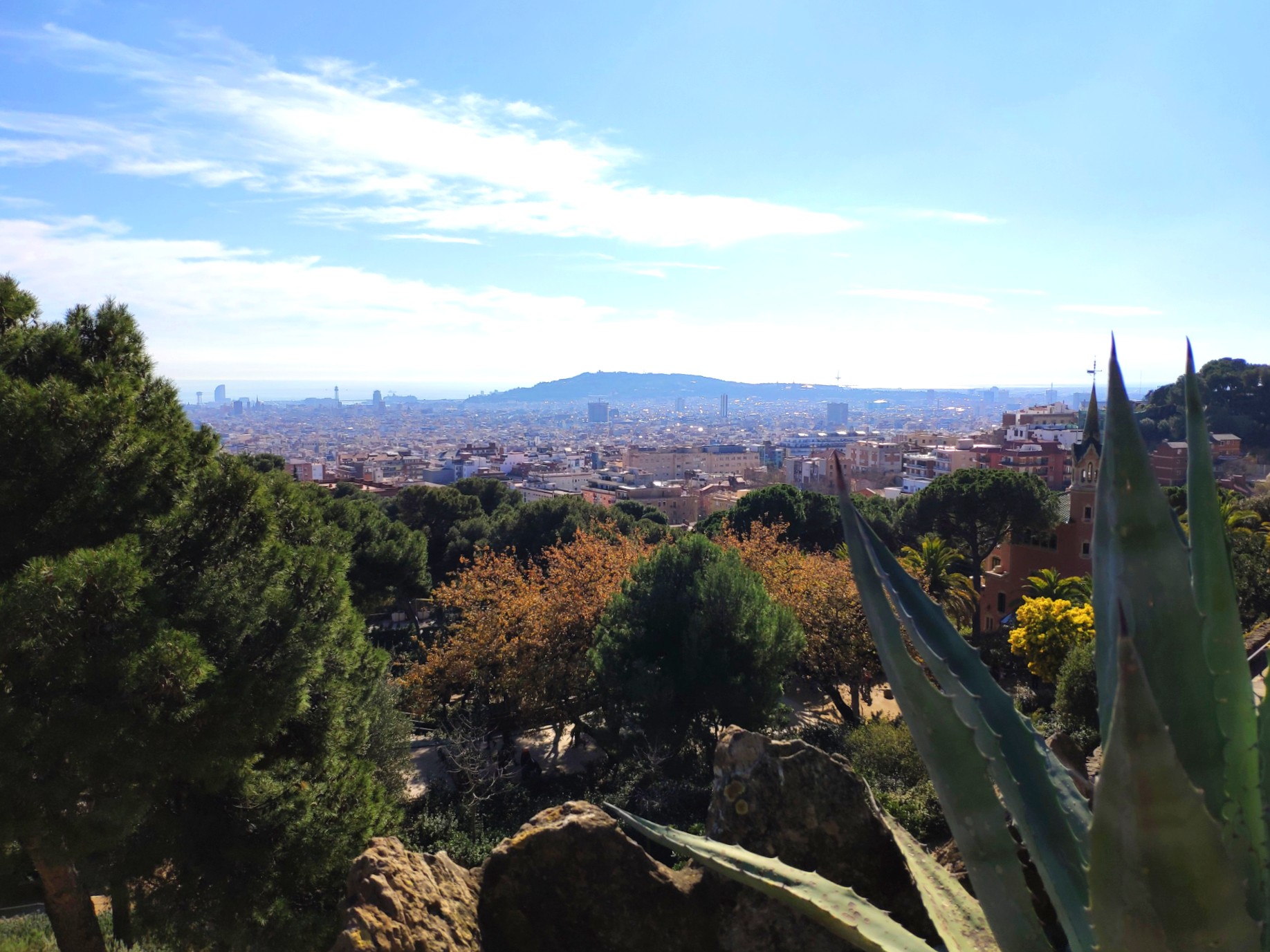 Bon, en conclusion sur cette balade en bus touristique je trouve que ce n’est pas vraiment utile ni intéressant car le réseau de transport en commun et les taxis sont très pratiques, le bus fait de multiples arrêts et il faut un temps fou pour relier le point A au point B. En fin de journée néanmoins, on pourra s’asseoir à la première rangée en haut du bus impérial et c’est vrai que dans ce cas-là ça reste un moyen fun de se déplacer, mais plutôt cher, je le recommanderai plutôt aux familles. On arrive au pied de la montée pour aller parc Guel. La partie payante du parc est vraiment magnifique, comme un balcon sur Barcelone, on domine la ville jusqu’à la mer avec les maisons de Gaudi au premier plan.