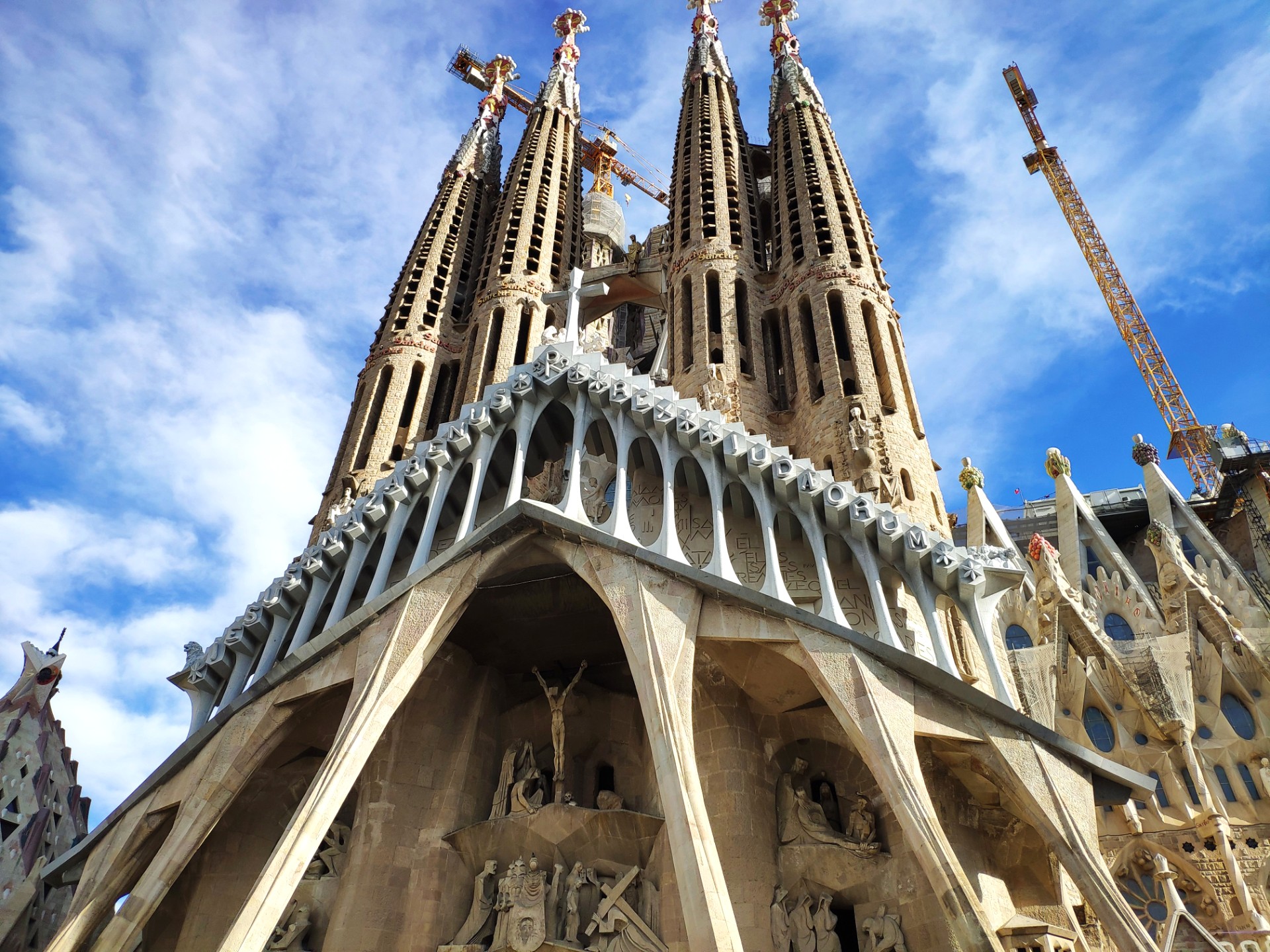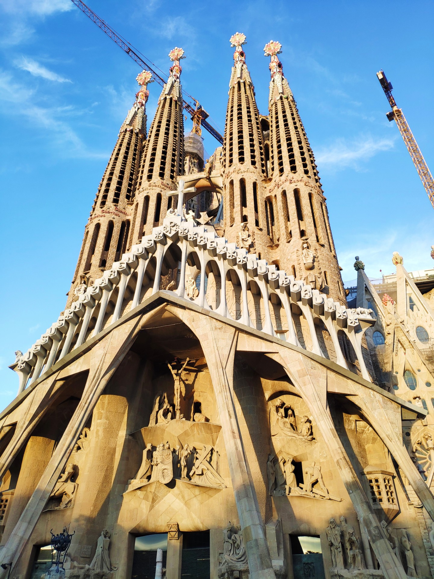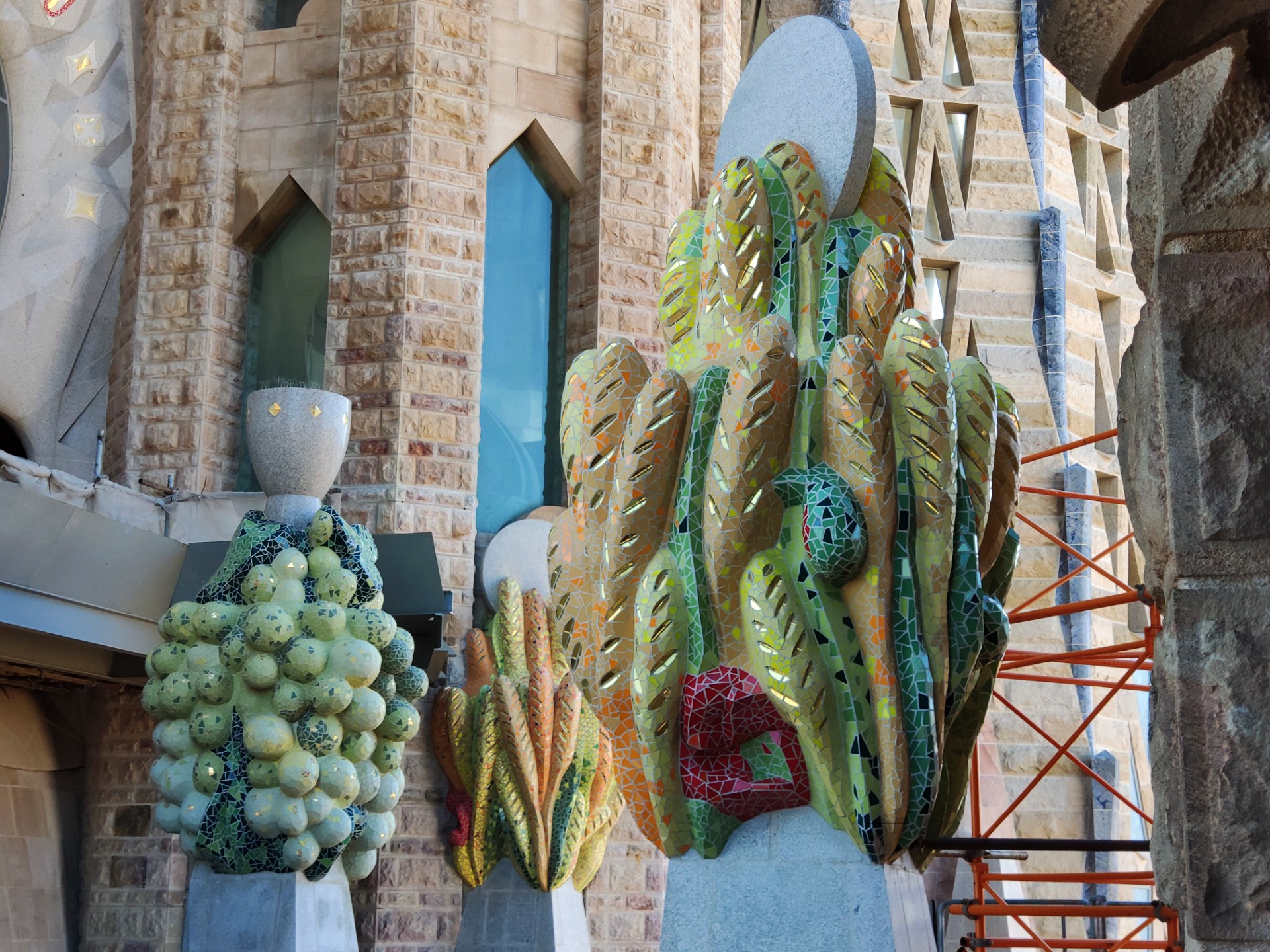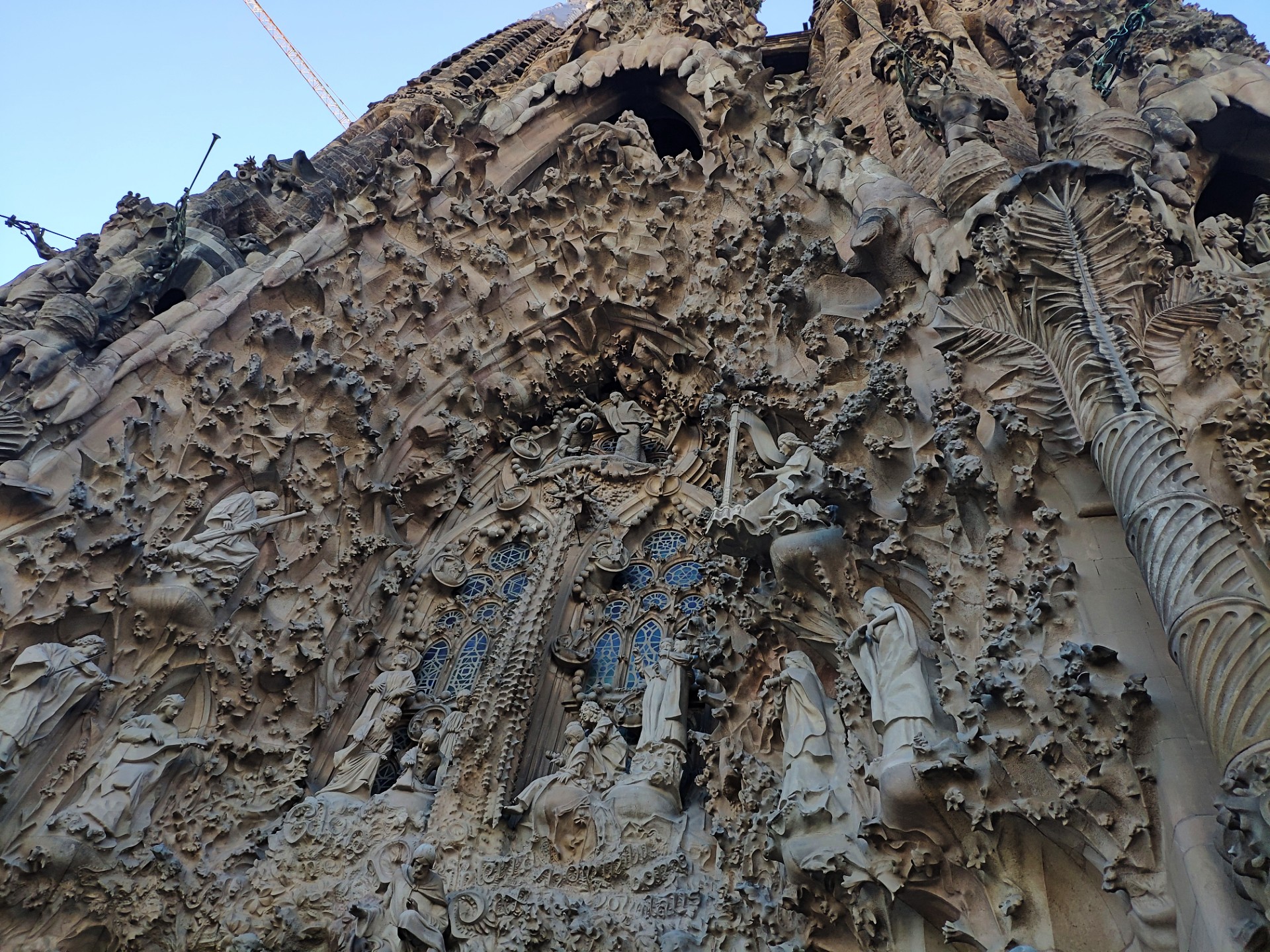 Mais le plus incroyable avec la Sagrada Familia, c’est que c’est une eglise encore en chantier, les grues dépassent des tours qui n’ont pas encore atteint leur hauteur maximum. Il y a déjà pleins de détails à découvrir si on regarde d’un peu plus près cette façade.