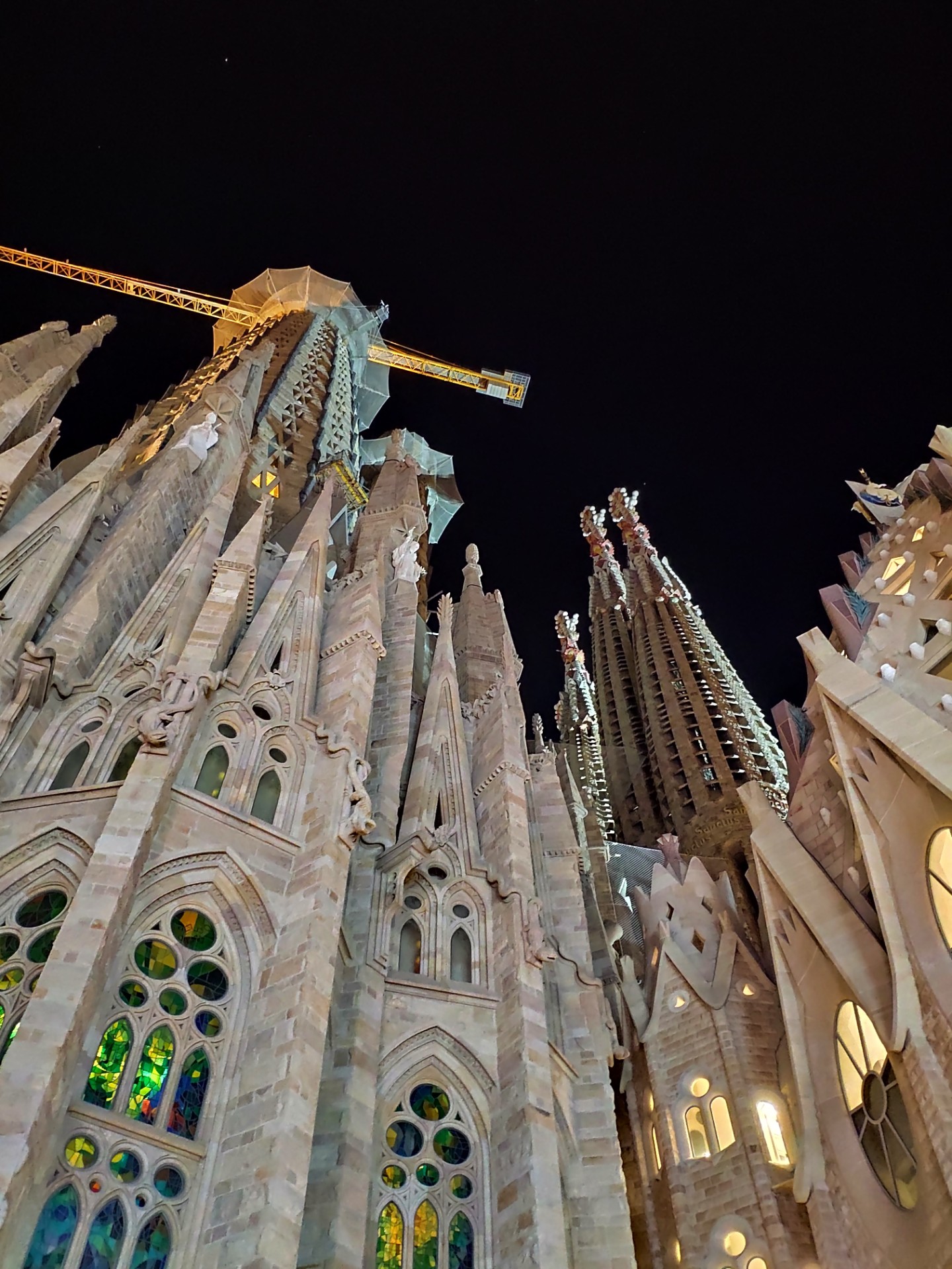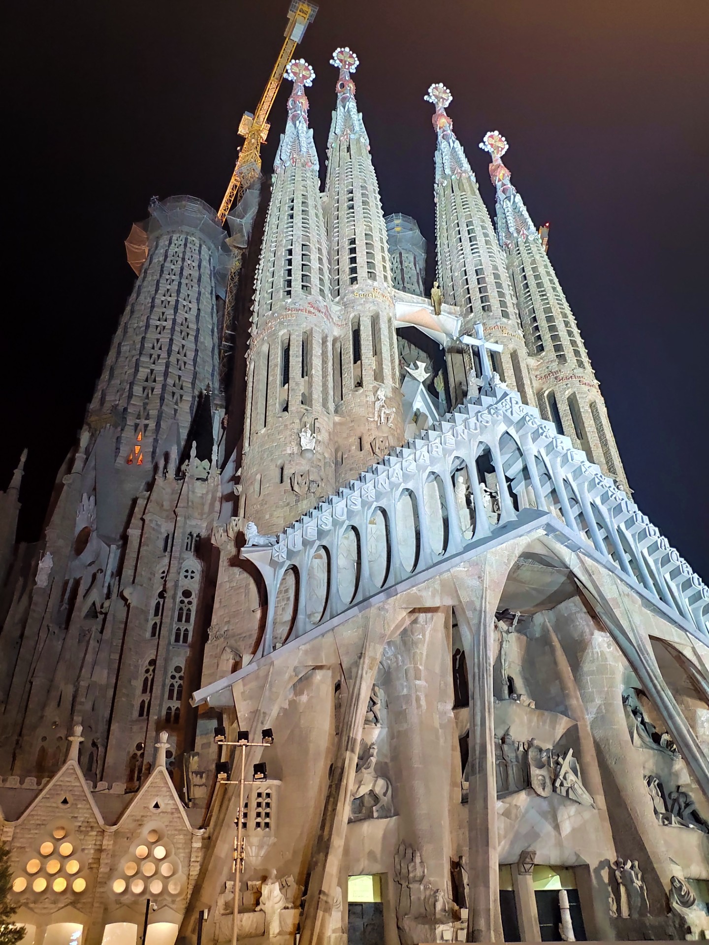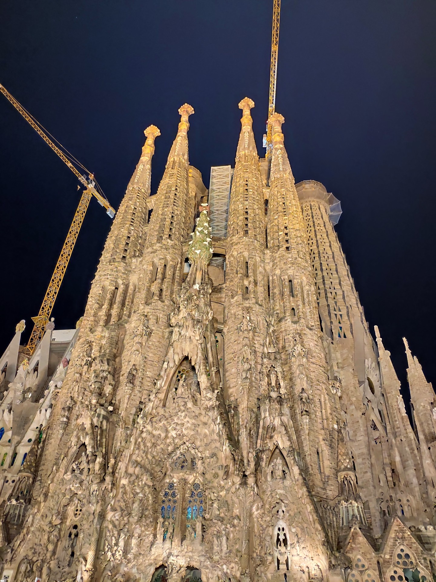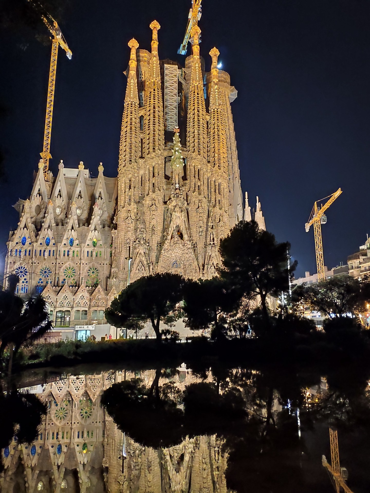 Puis nous continuons notre promenade nocturne jusqu’à la Sagrada Familia, elle aussi éclairée de nuit. Cette église que l’on prendra le temps de visiter en détail demain impressionne par ses dimensions et sa verticalité. Les tours semblent s’élancer vers le ciel.