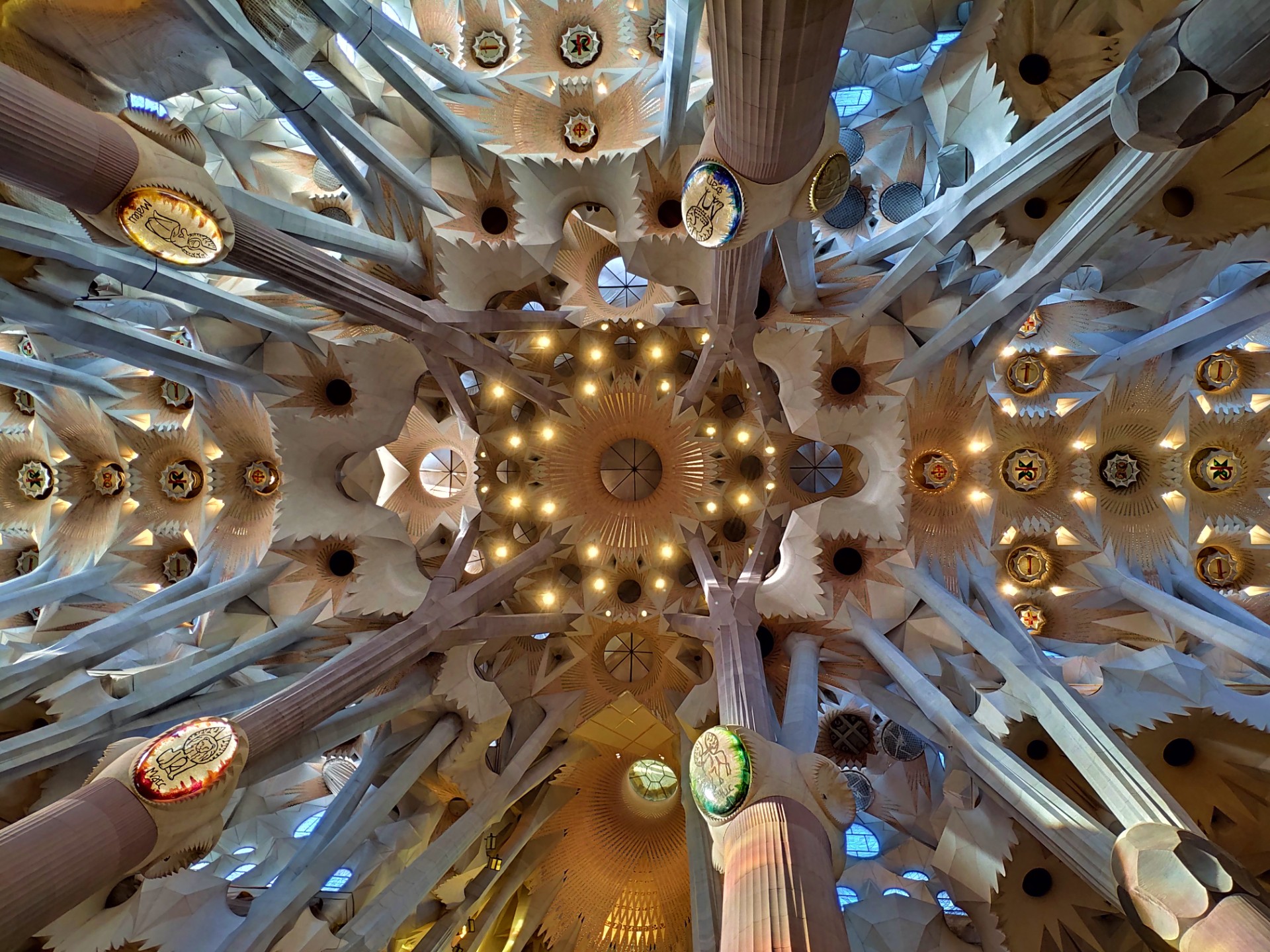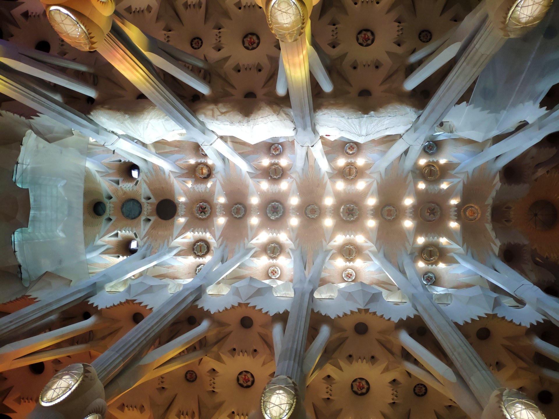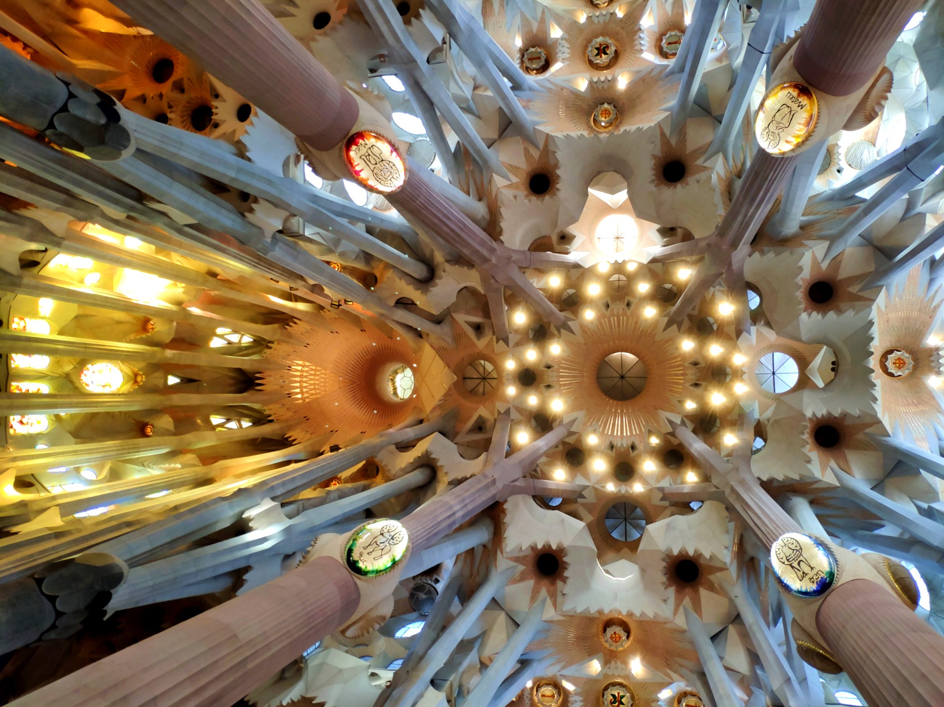 On s’asseoit sur un des bancs pour admirer l’architecture de l’intérieur de la Sagrada Familia.