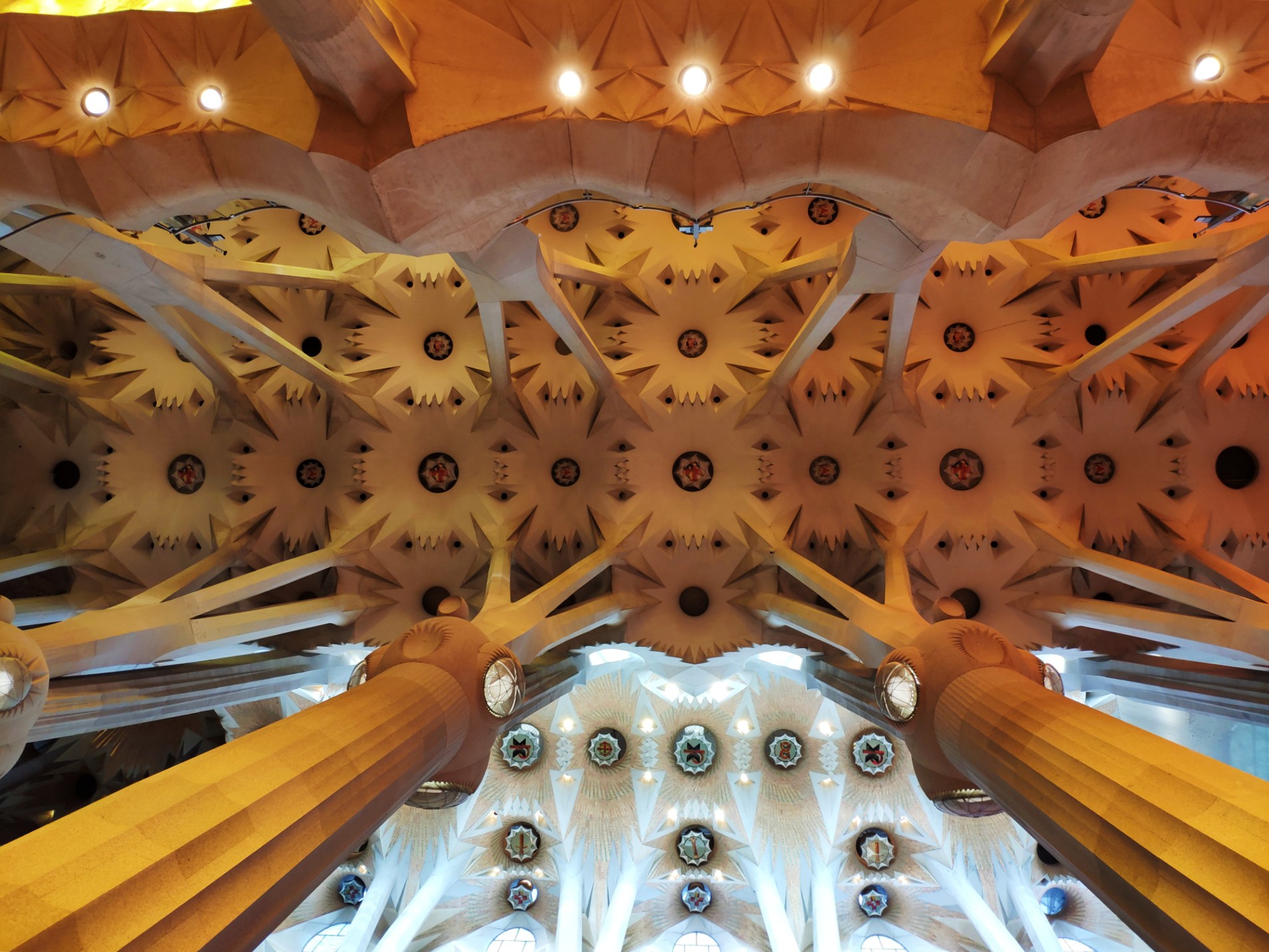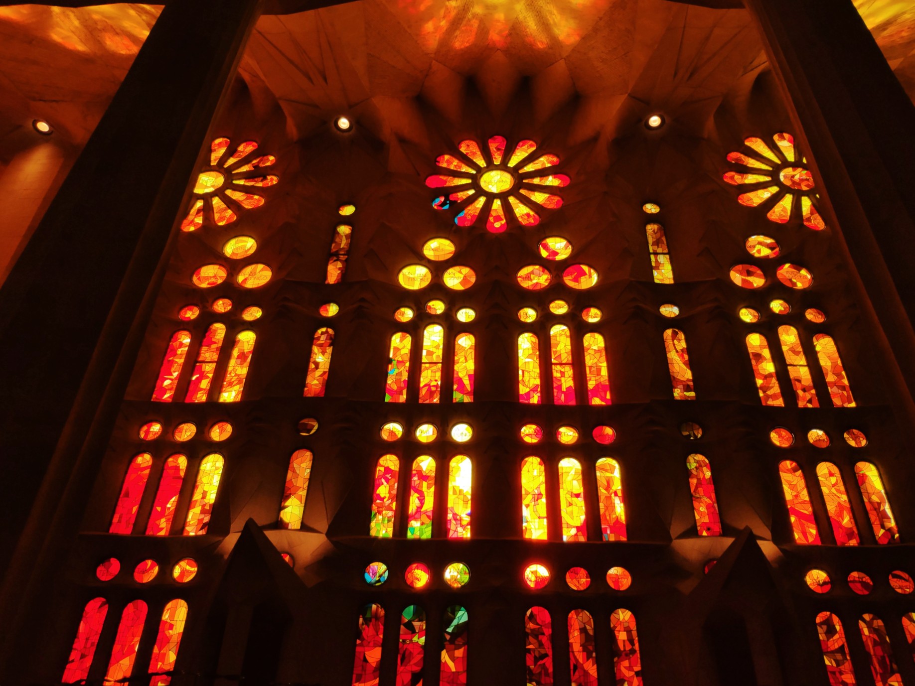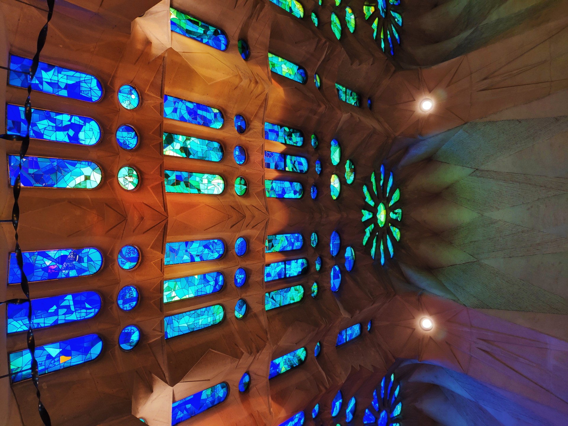 On s’asseoit sur un des bancs pour admirer l’architecture de l’intérieur de la Sagrada Familia.