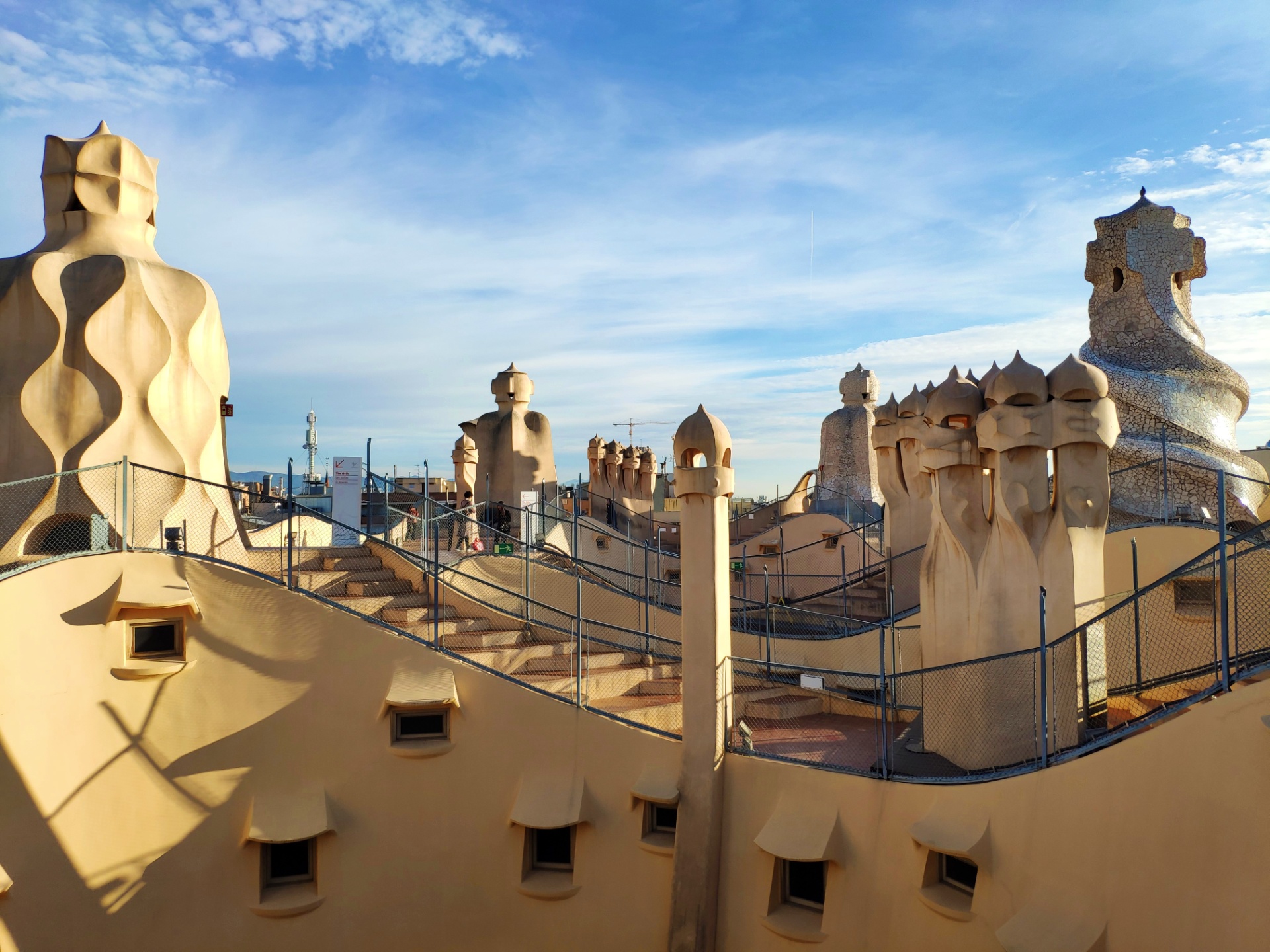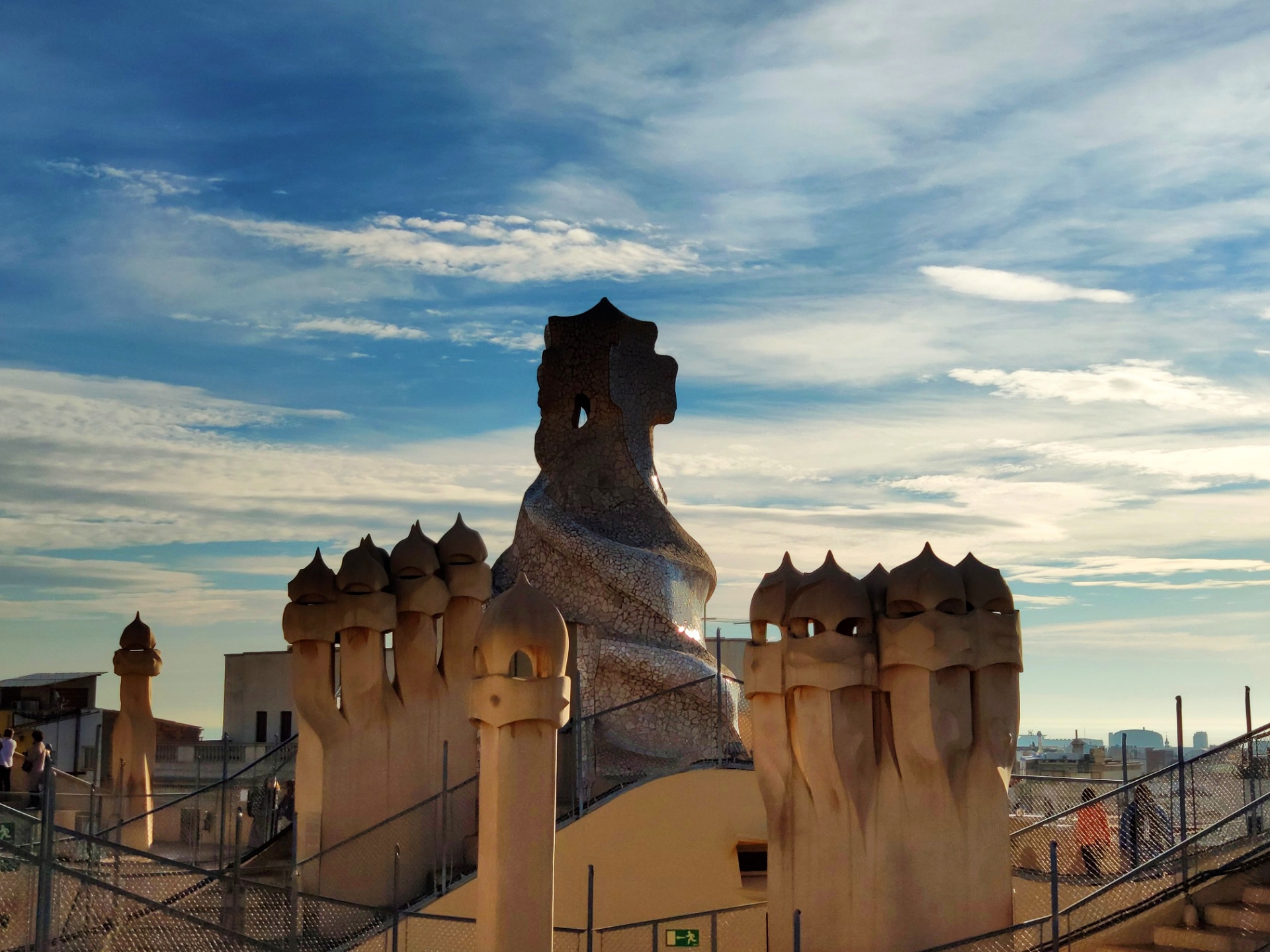 On grimpe sur le toit de la maison Mila où l’on trouve les fameuses cheminées (qui n’en sont en fait pas) en forme de spartiates.