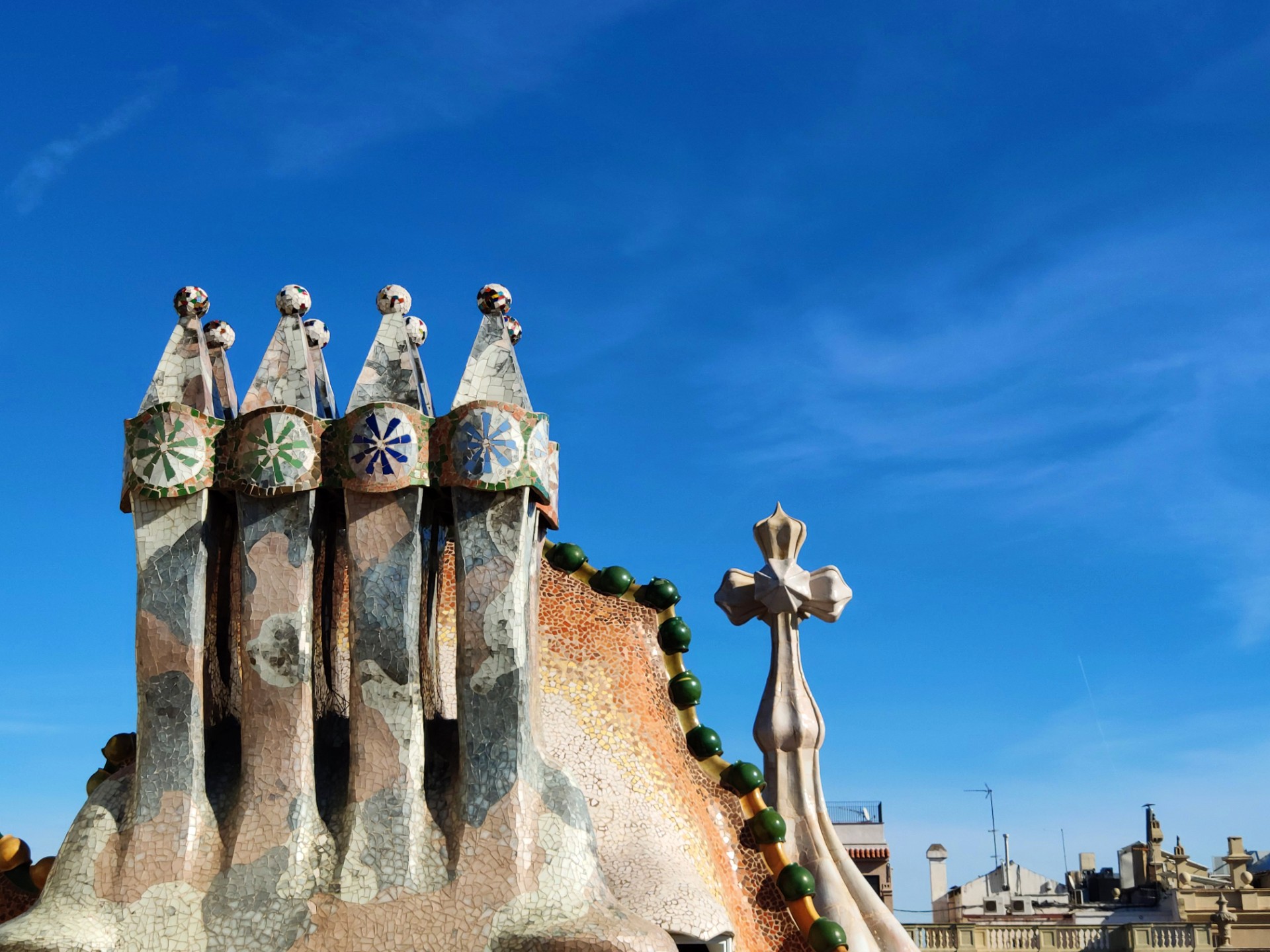 Le toit de la maison est très intéressant comme celui de la maison Mila avec des cheminées aux mosaïques multicolores et formes improbables.