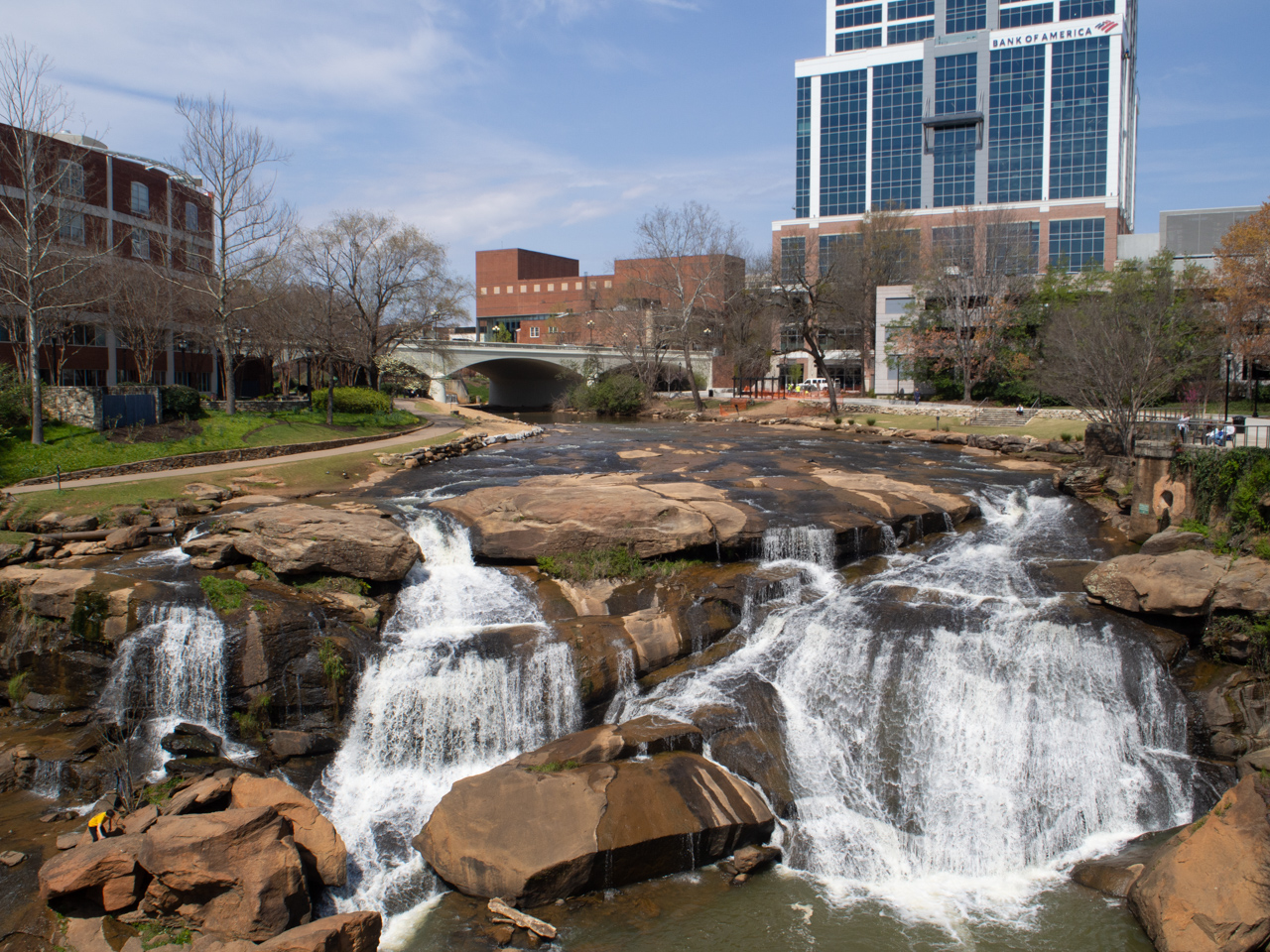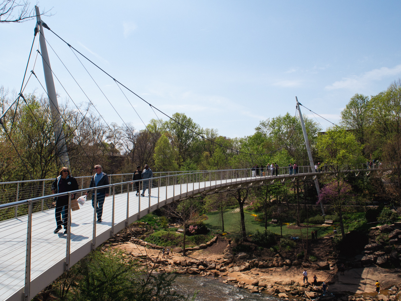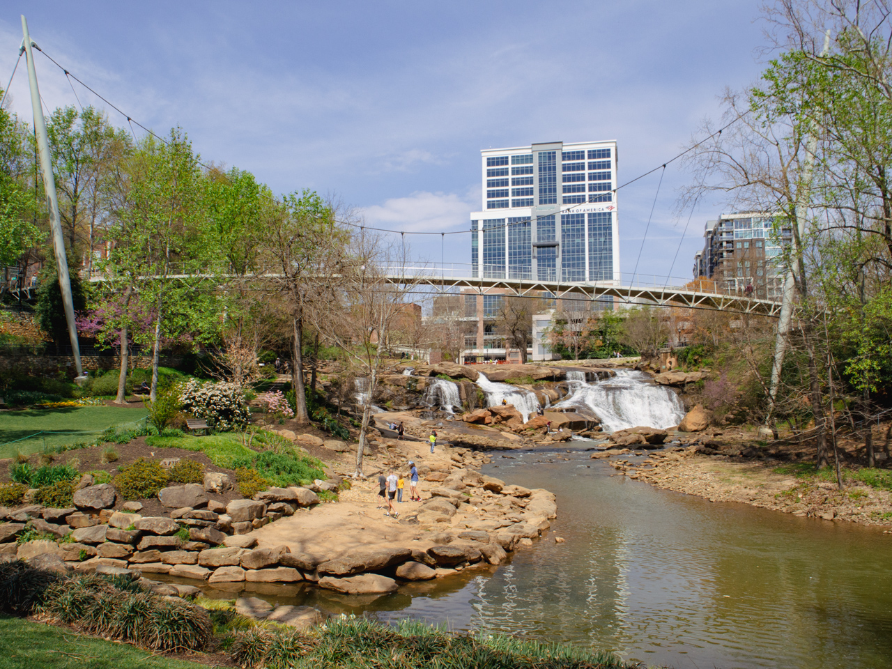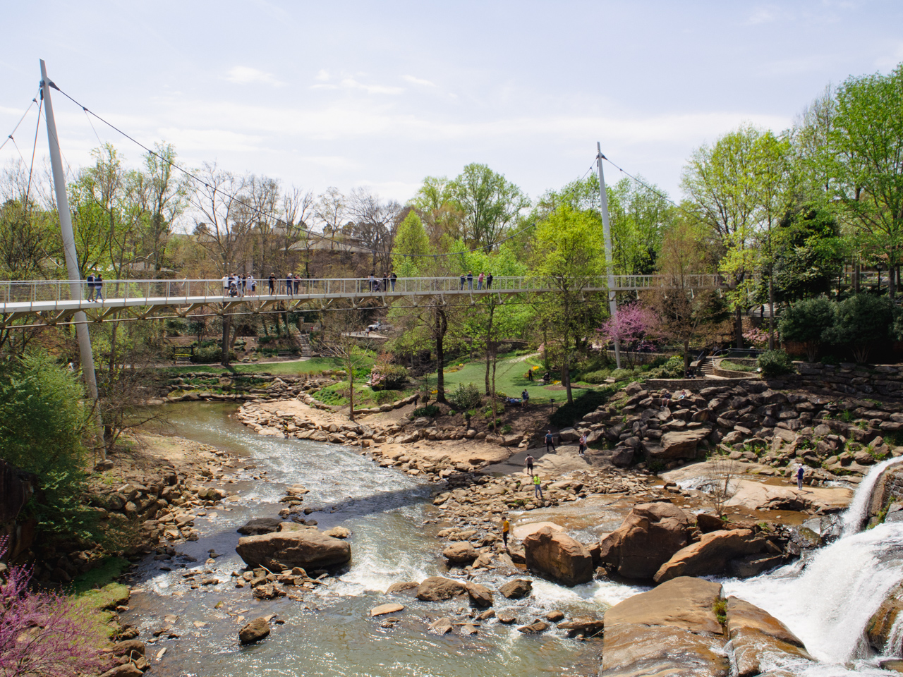 Depuis la vibrante Charlotte, on file sur l'interstate I-85 jusqu'à Greenville, ville industrielle de l'Upstate de la Caroline du Sud qui est la prochaine étape de notre voyage. Au pied des Appalaches, son centre ville est mignon avec ses maisons de brique. Sa principale attraction est le parc Falls avec le pont suspendu qui enjambe la rivière Reedy.