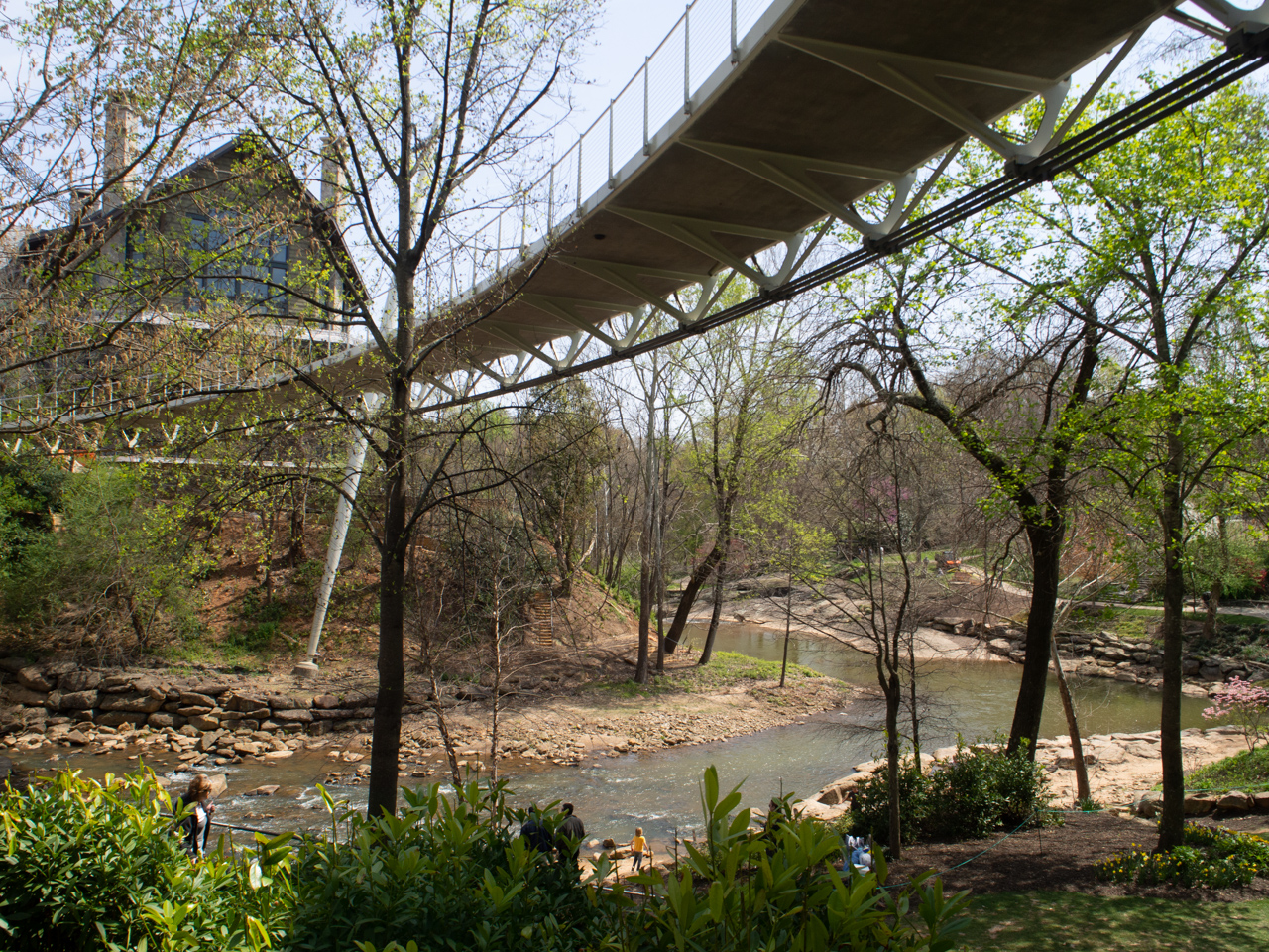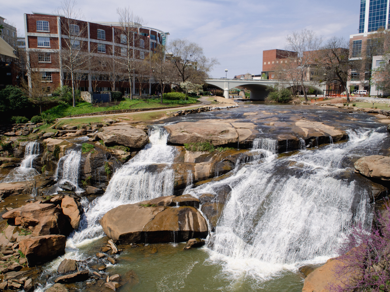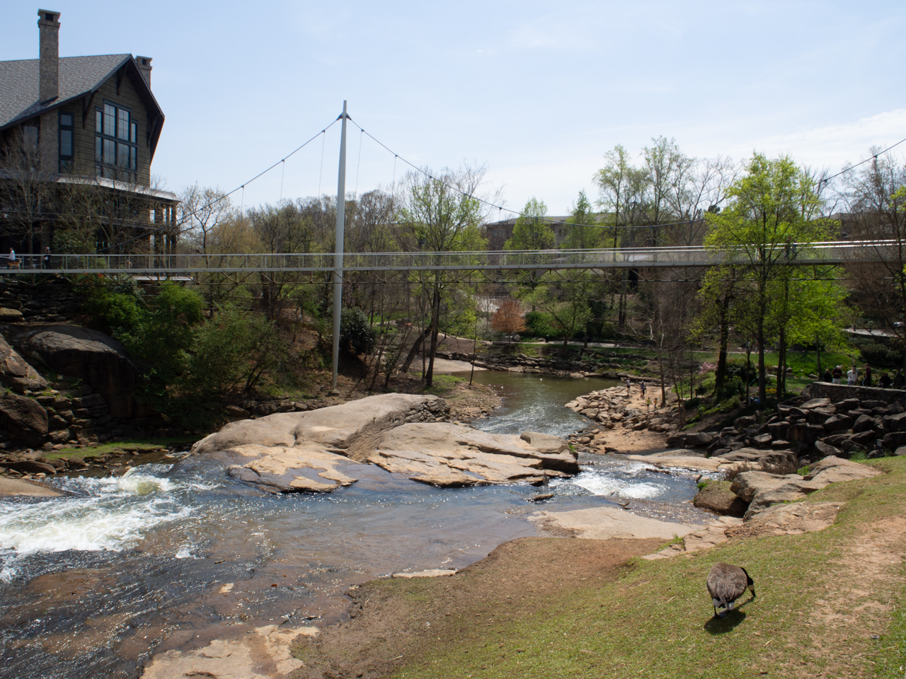 Depuis la vibrante Charlotte, on file sur l'interstate I-85 jusqu'à Greenville, ville industrielle de l'Upstate de la Caroline du Sud qui est la prochaine étape de notre voyage. Au pied des Appalaches, son centre ville est mignon avec ses maisons de brique. Sa principale attraction est le parc Falls avec le pont suspendu qui enjambe la rivière Reedy.