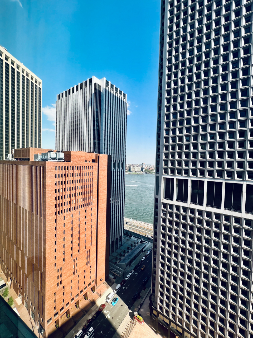 Nous arrivons en milieu d’après midi à notre hébergement en plein centre du quartier financier de Lower Manhattan. Les chambres d’hôtel sont plutôt chères à New York, mais on a pu trouver de bons prix au Hilton Garden Inn, environ 200$ par nuit, environ 50$ de moins que dans la quartier de Midtown où se trouve la plus grande concentration de touristes et le coeur des attractions de Manhattan, à quelques exceptions près. Ce sera un choix intéressant, on ne regrette pas d’être un peu excentré, le métro est très pratique à New York, et la Metrocard pour la semaine qui donne accès à tous les transports en commun pour une semaine coute 30$, un investissement que l’on va vite récupérer tant il y a des lignes partout et des trains fréquemment à toute heure du jour et de la nuit. Nous posons les valises dans notre chambres du 28e étage qui a une vue partielle sur la baie de New York.
