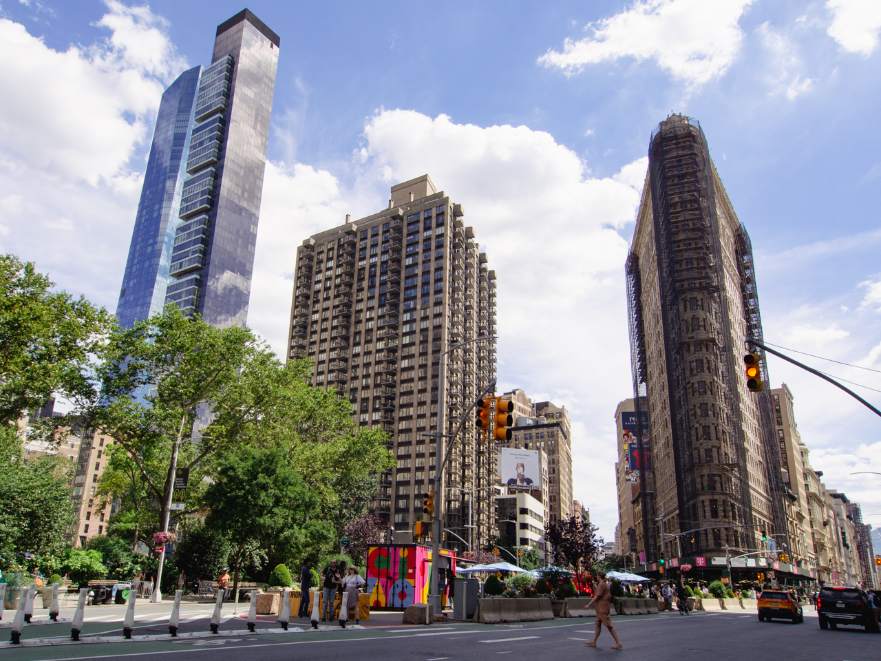On arrive au Flat iron, un des bâtiments les plus mythiques de New York, un autre édifice que j’avais mis tout en haut de ma liste pour ce voyage à New York. Malheureusement, lorsqu’on arrive sur la place du Madison Square, je suis tellement déçu, ce monument si caractéristique de la ville est couvert sur ses angles par une bâche hideuse.
