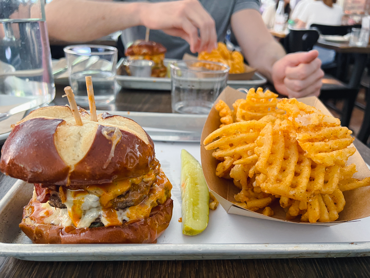 On mange un burger dégoulinant de gras avec une énorme portion de frites qui nous suffira pour nous restaurer jusqu’au lendemain matin.