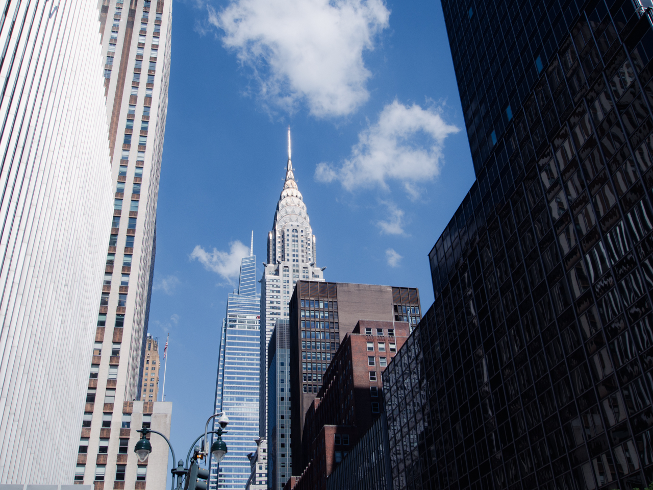 On rejoint maintenant la 5e avenue pour notre pause café glacé du jour, petit rituel que l’on s’est instauré. Quel plaisir de se promener le nez en l’air dans ses rues que l’on avait déjà visité sous la pluie Lundi, avec le soleil, on a de bien belles couleurs pour apprécier la flèche du Chrysler Building.