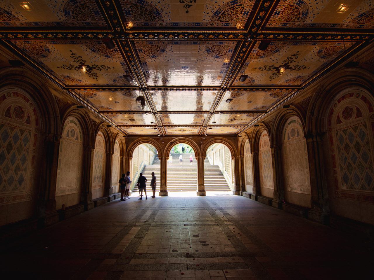 On y aperçoit un grand nombre d’écureuils pas du tout farouches qui viennent jusqu’à manger au bout de nos doigts. On traverse le Mall, la grande allée droite au milieu de Central Park qui finit à la fontaine de Bethesda et les arcades de Bethesda très bien décorées.