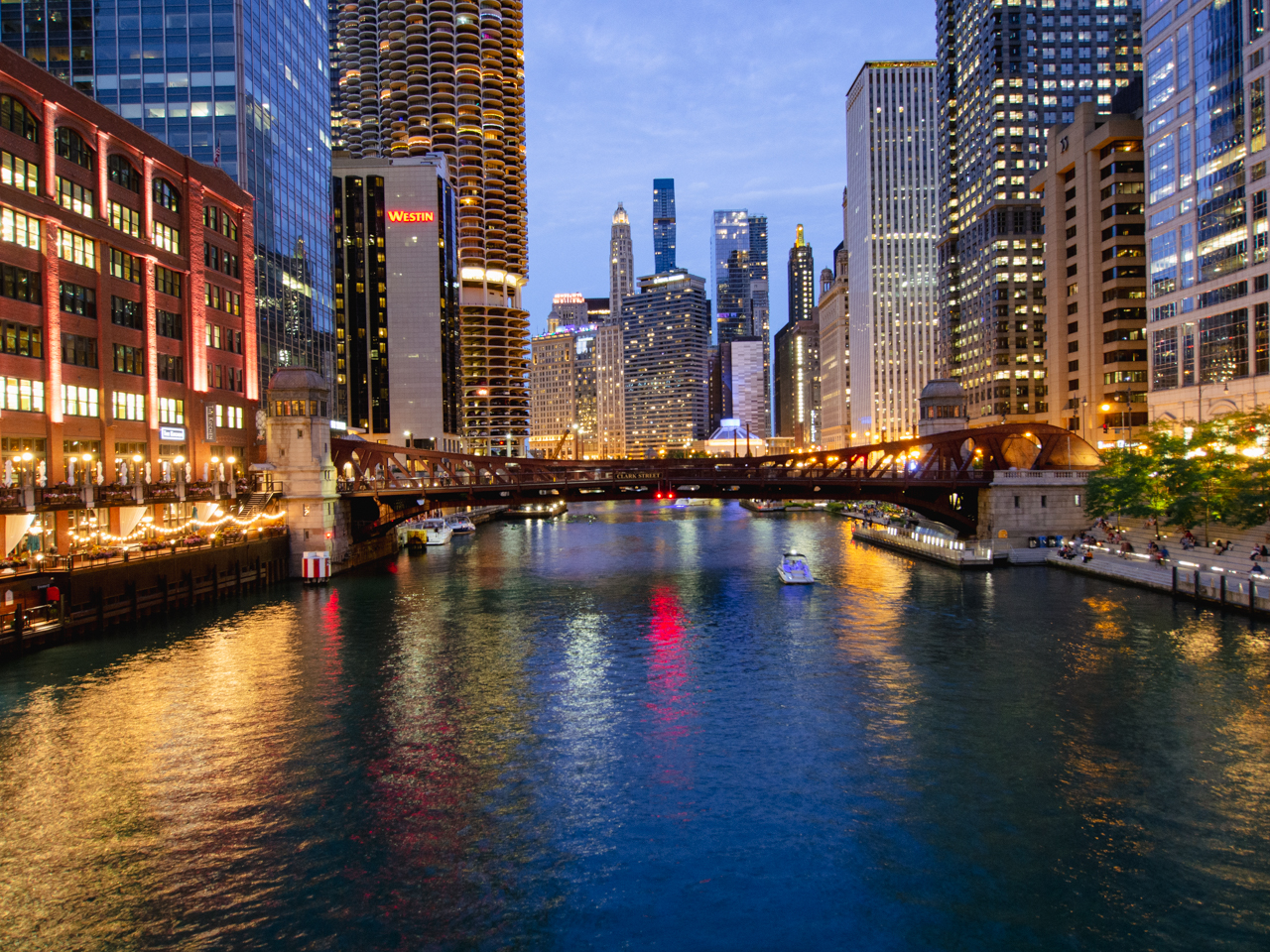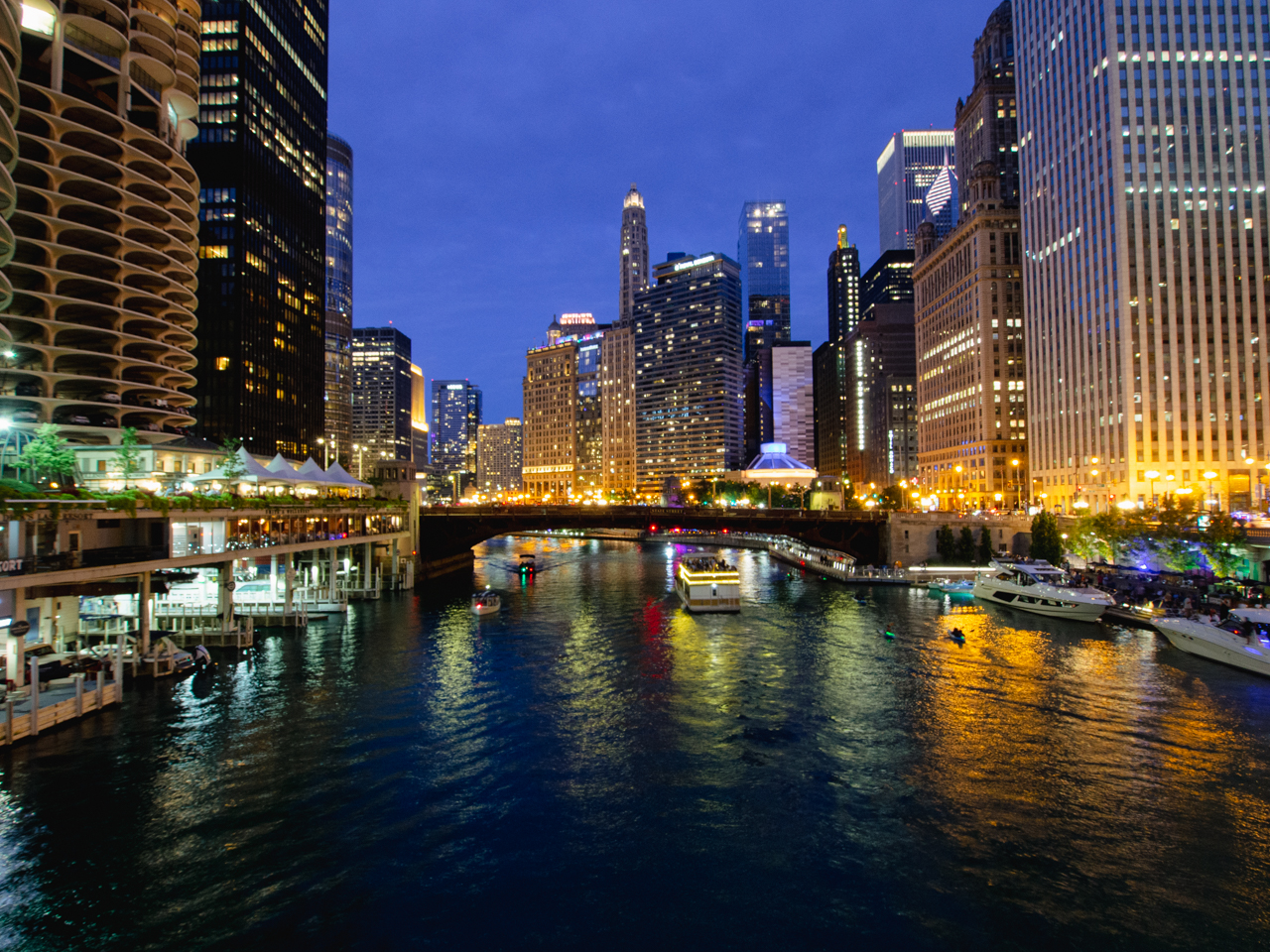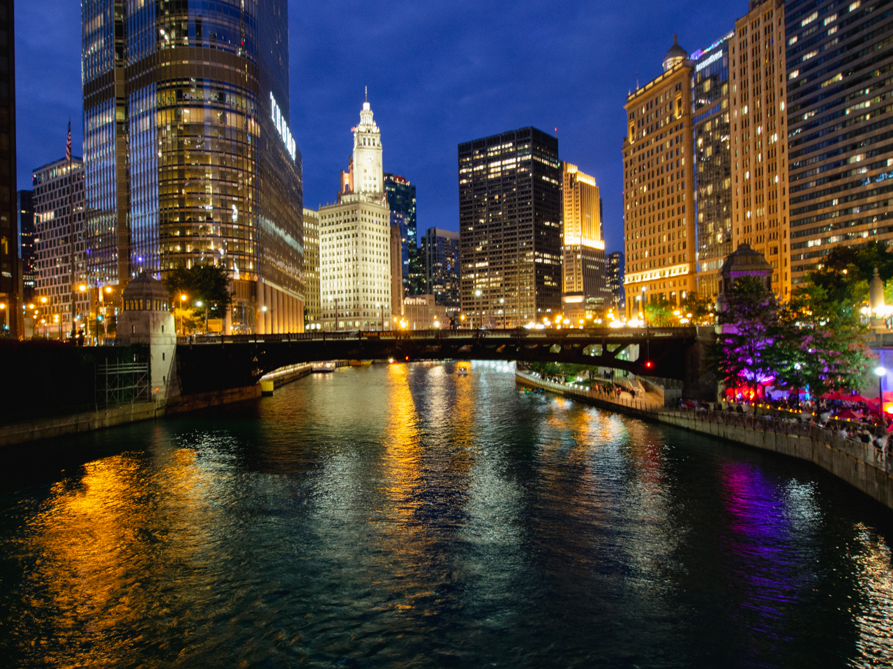 L’aéroport de Chicago est un des aéroports les plus connectés des Etats Unis, il est facile de rejoindre la ville du Midwest depuis un peu partout dans le monde. Les infrastructures sont modernes et efficaces, un peu à l’écart du centre ville. On a la chance d’avoir un aperçu de la célèbre skyline de Chicago depuis le hublot avant l’atterrissage, comme une superbe entrée en matière. A l’aéroport de Chicago O Hare, le train L permet de rejoindre le centre ville, le Loop, directement en un peu moins d’une heure. On achète une carte de transport illimitée qui comprend la ligne de l’aéroport pour 5$ par jour. On traverse les suburbs pas très attrayants, au bord d’une très large voie rapide, image classique des Etats Unis qui n’est pas sa face la plus charmante. A l’opposé de ce qui nous attend alors que l’on sort de la bouche de métro à l’intérieur du Loop. Quelle claque lorsque l’on arrive sur les berges de la Chicago River au coucher du soleil, avec tous ces ponts métalliques illuminés entourés par des buildings à l’architecture variée.