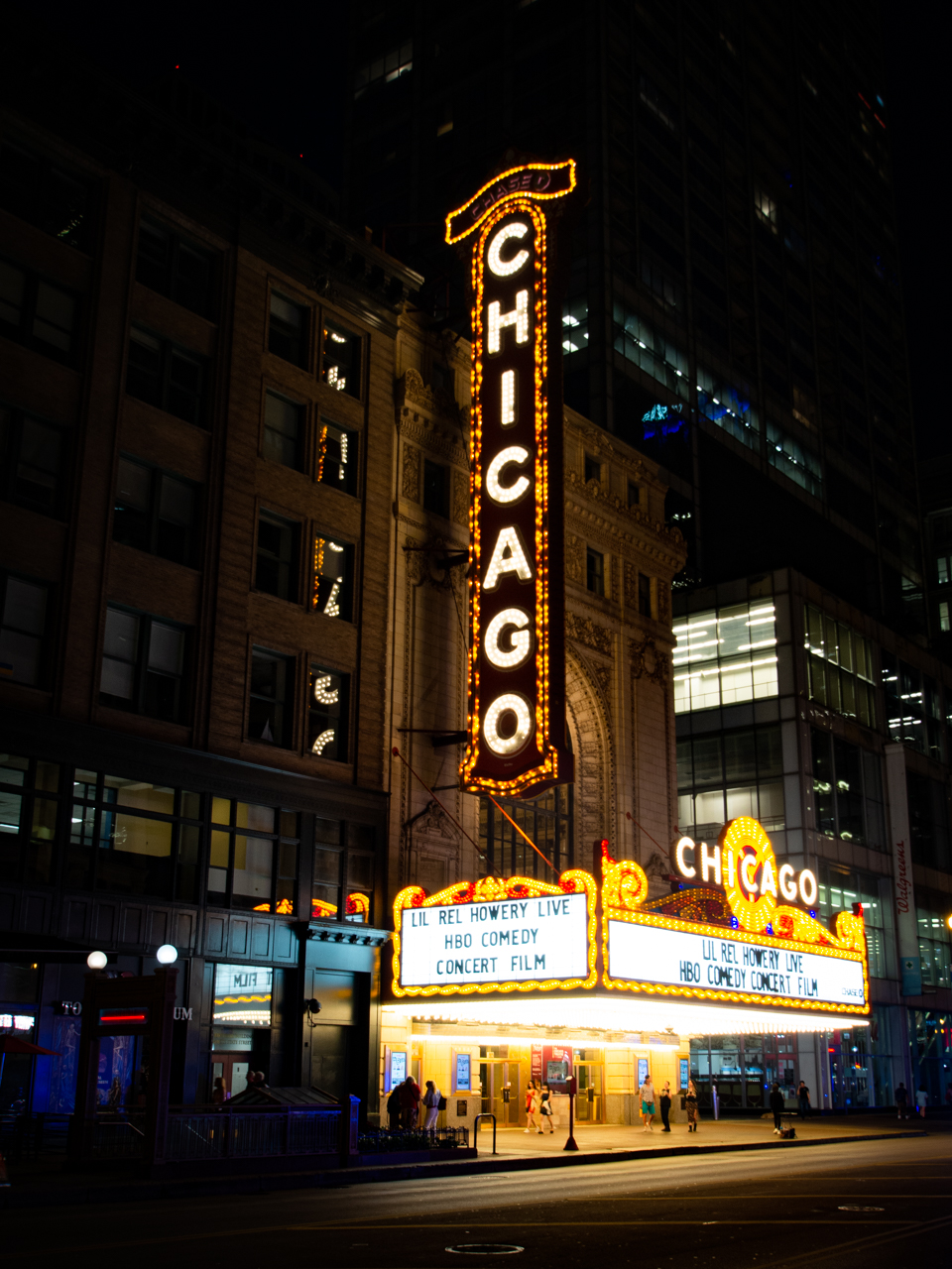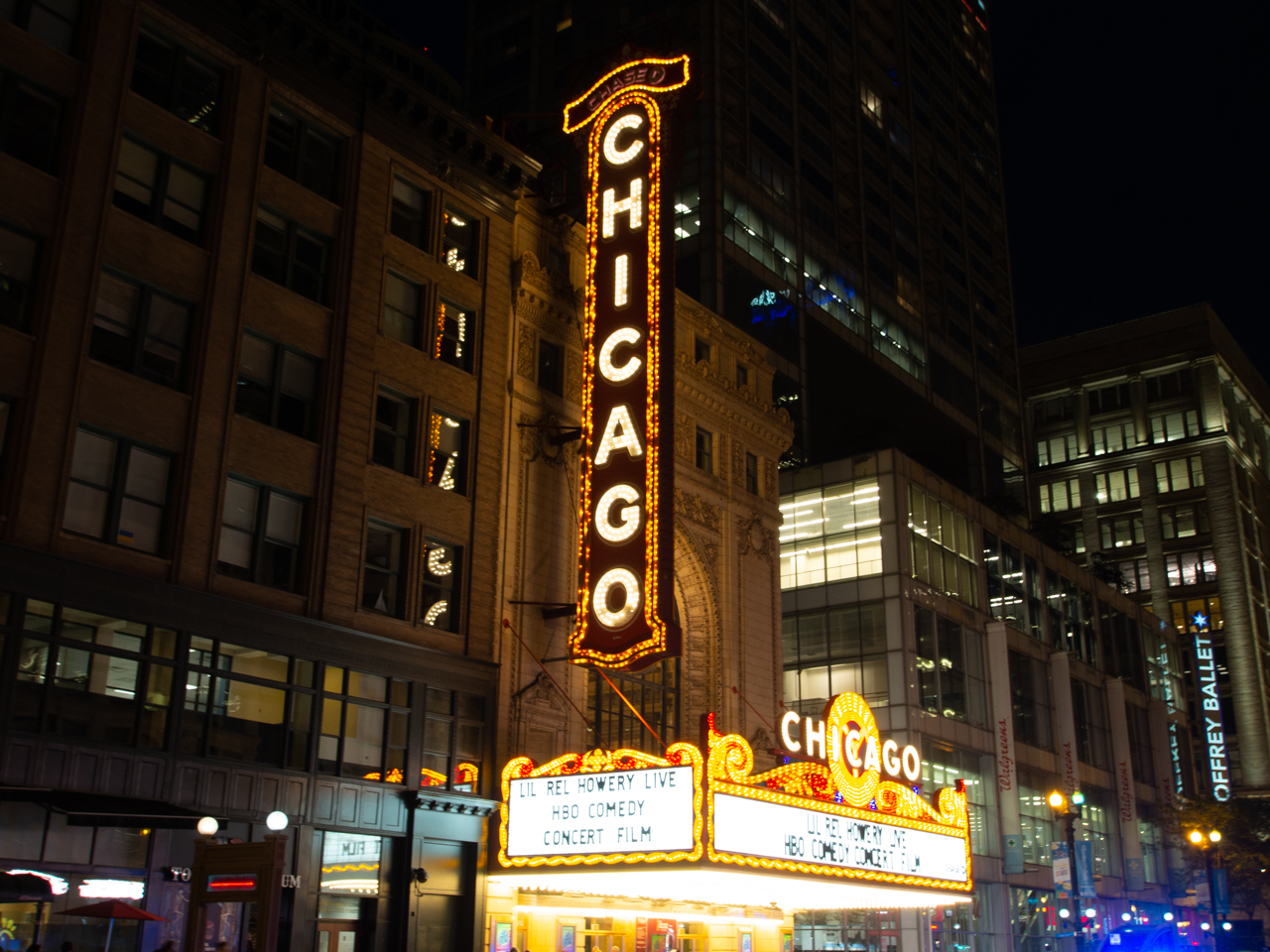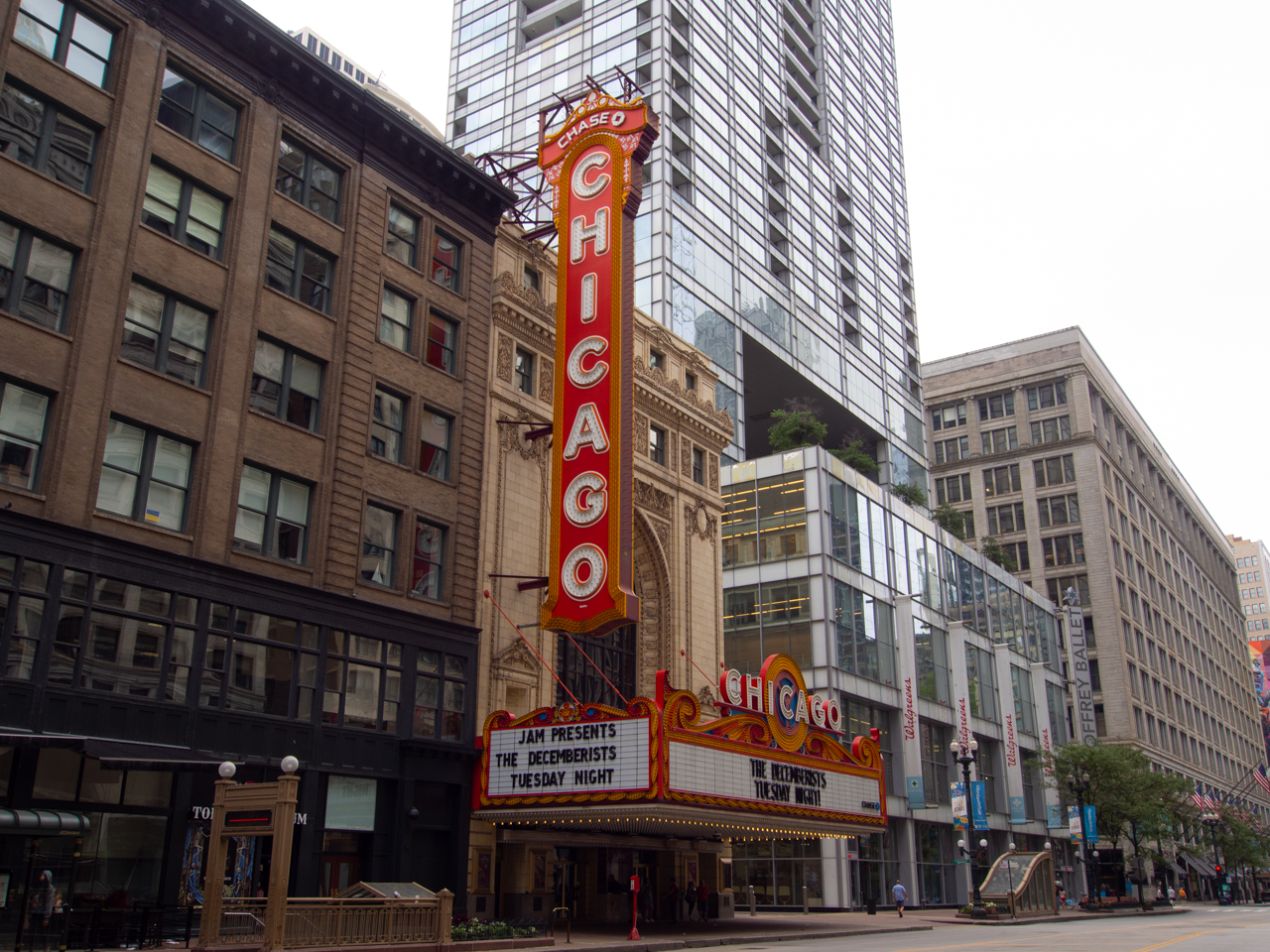 L’hôtel, le Hampton Inns Downtown North, est superbement restauré dans un style art déco qui rappelle sa précédente vie de centre pour l’automobile. Un bon choix, bien placé mais comme tous les autres hotels de Chicago, la chambre est hors de prix le week-end et plutôt bruyante, mais on n’a pas le choix si on veut dormir dans le centre ville. Chicago est une immense métrople, et pourtant la plupart des attractions et monuments sont toutes rassemblées autour du Loop qui est tout petit, ça vaut vraiment le coup de choisir un hôtel dans le Loop, c’est un confort supplémentaire de ne pas dépendre des transports et d’être là où se déroule l’action. Le panneau scintillant du théâtre de Chicago brille au-dessus de la rue, un des symboles de la ville.
