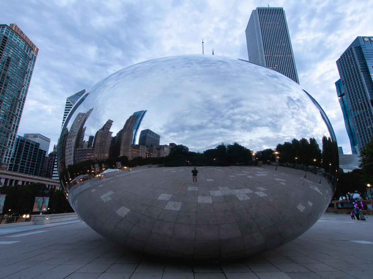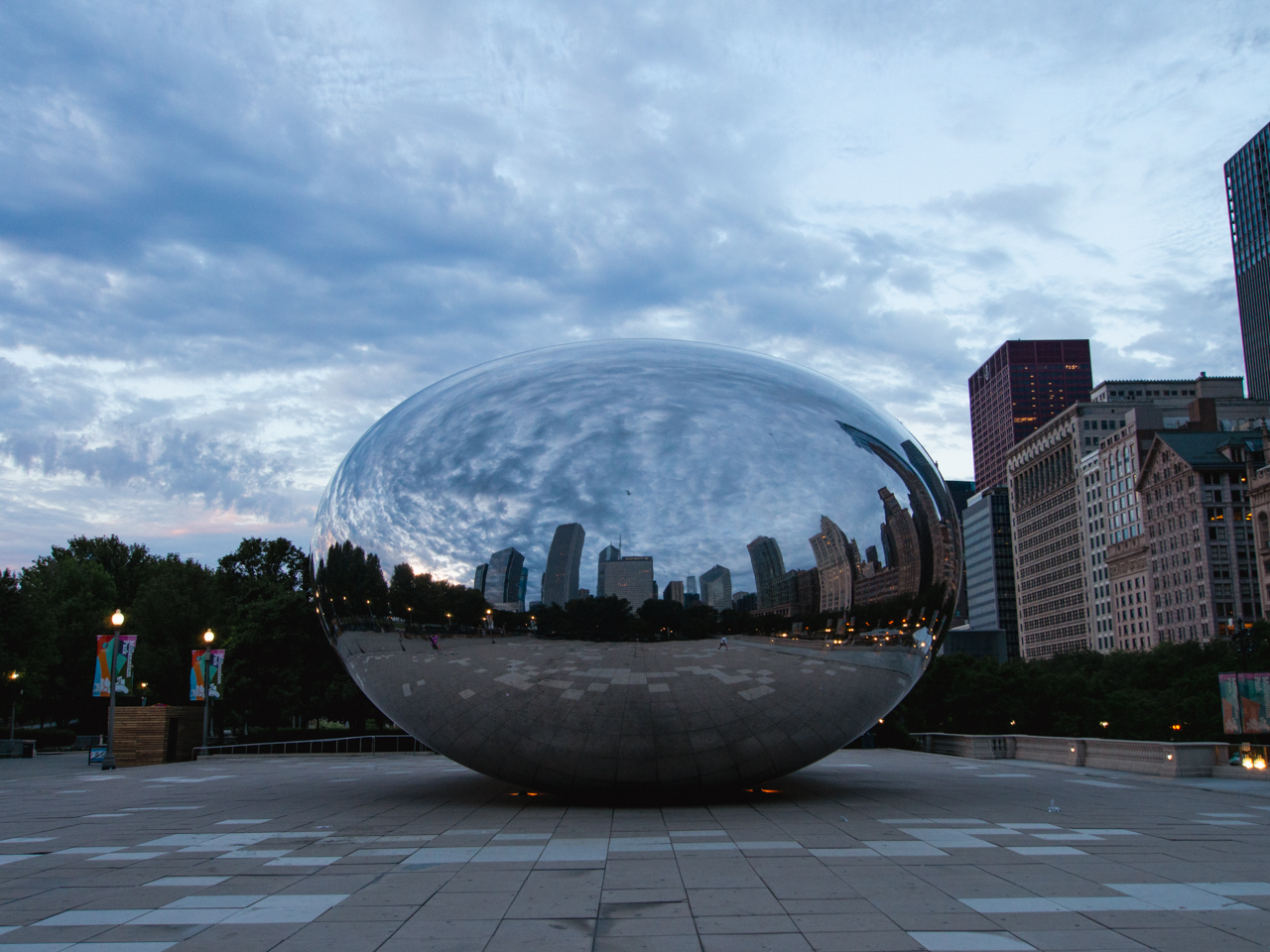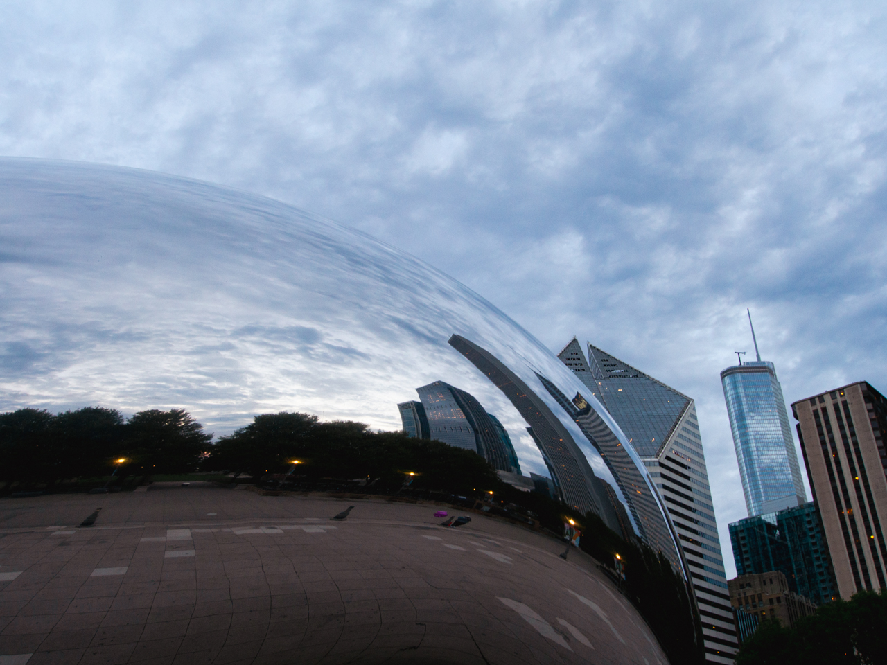 J’ai la chance de me réveiller très tôt ce matin, il y a une heure de décalage horaire et je compte bien en profiter pour faire une promenade matinale pendant que les autres touristes dorment encore. L’attraction la plus connue de Chicago est certainement le Cloud Gate, dans le parc du Millenium, et j’avais lu que seulement au petit matin, on pouvait en profiter avec un peu d’intimité. Je rejoins donc le parc directement alors que le soleil n’est pas encore levé. J’aurai voulu assister à un lever de soleil face au Cloud Gate mais le climat imprévisible de Chicago en décidera autrement. En tout cas, nous sommes trois lorsque j’arrive au Bean, l’autre nom de cette oeuvre d’art moderne qui est devenu le symbole de la ville.
