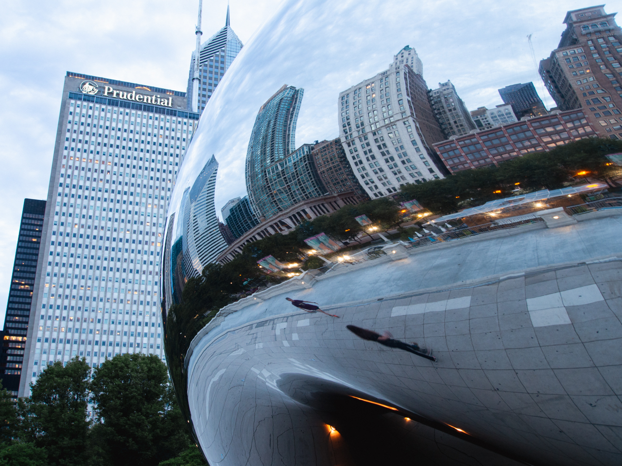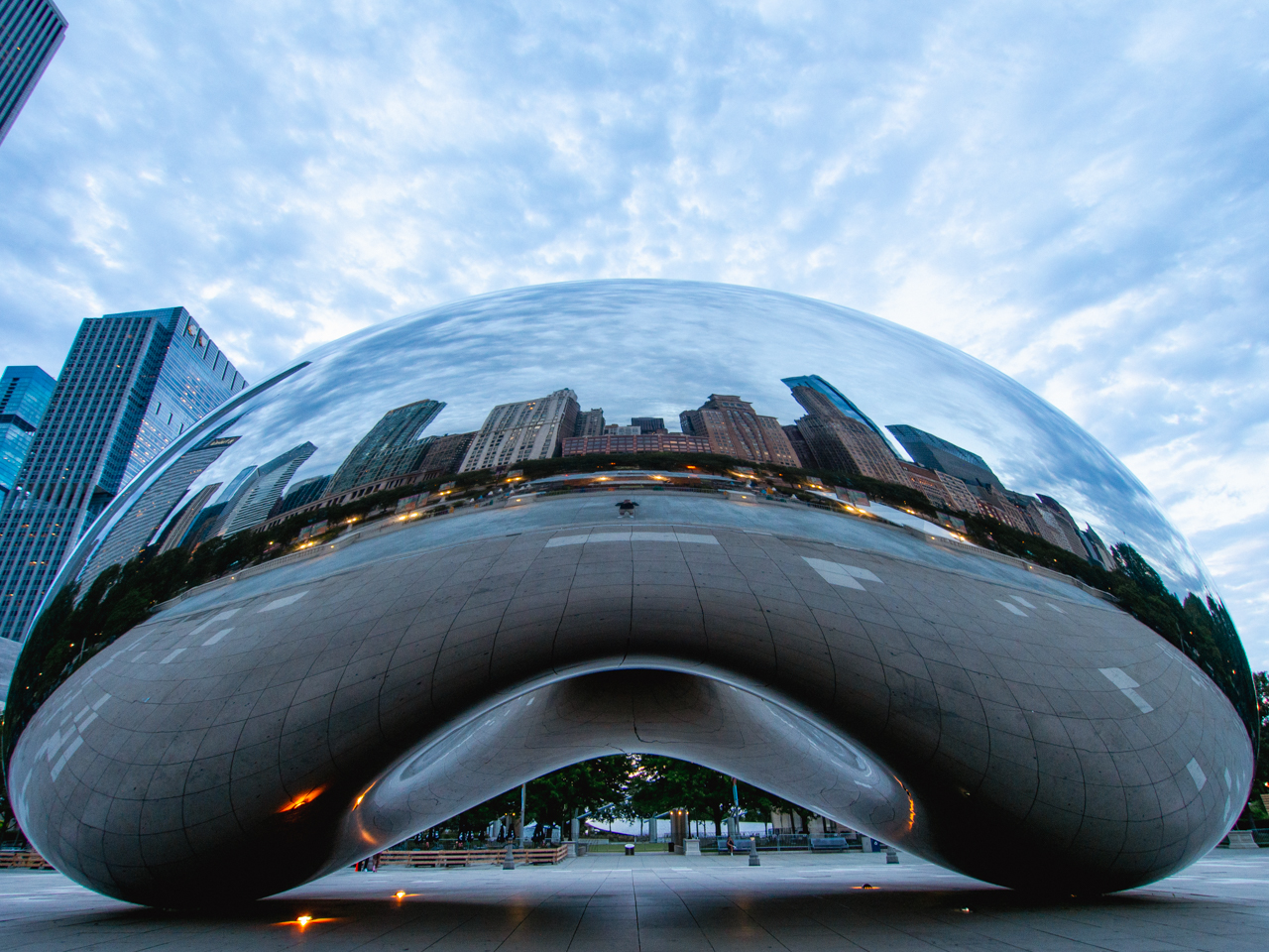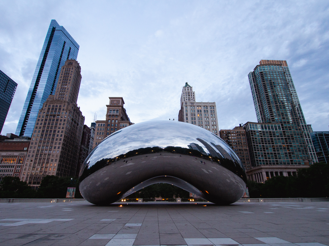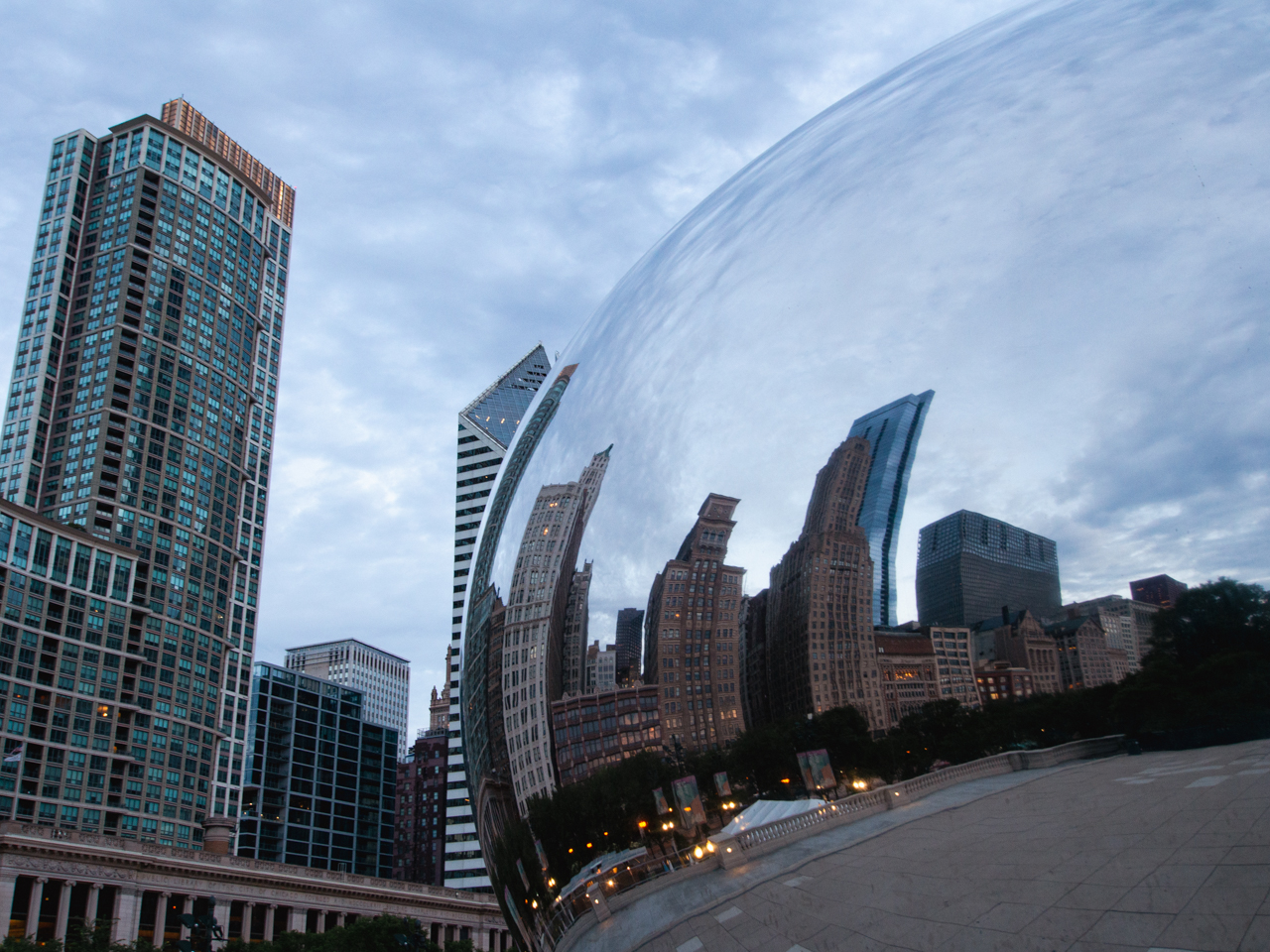 J’ai la chance de me réveiller très tôt ce matin, il y a une heure de décalage horaire et je compte bien en profiter pour faire une promenade matinale pendant que les autres touristes dorment encore. L’attraction la plus connue de Chicago est certainement le Cloud Gate, dans le parc du Millenium, et j’avais lu que seulement au petit matin, on pouvait en profiter avec un peu d’intimité. Je rejoins donc le parc directement alors que le soleil n’est pas encore levé. J’aurai voulu assister à un lever de soleil face au Cloud Gate mais le climat imprévisible de Chicago en décidera autrement. En tout cas, nous sommes trois lorsque j’arrive au Bean, l’autre nom de cette oeuvre d’art moderne qui est devenu le symbole de la ville.