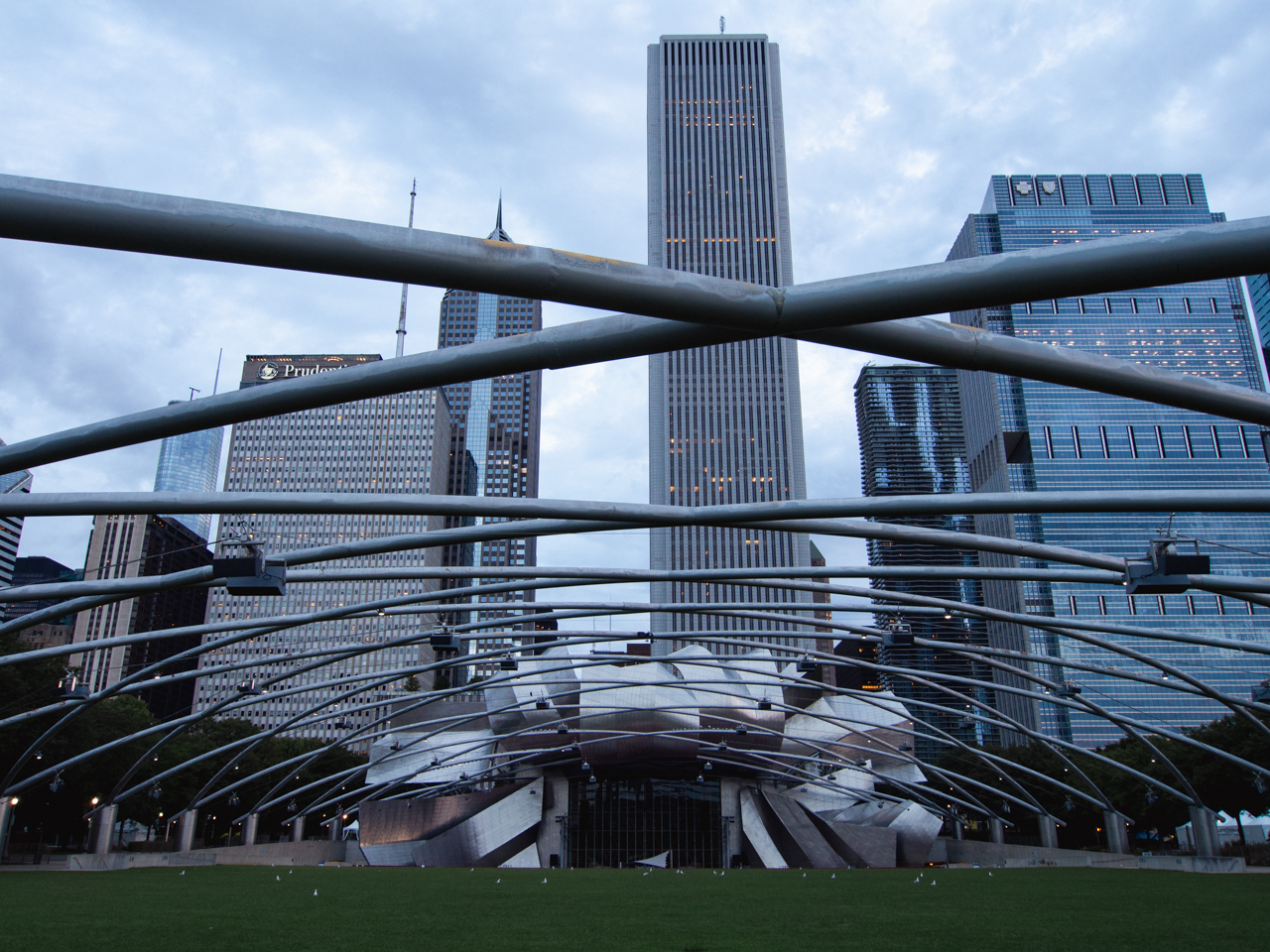 Je continue la visite du Millenium Park avec la grande scène utilisée pour les concerts, avec sa façade en métal, on a l’impression d’un bâtiment qui aurait été dynamité et ouvert vers l’extérieur.