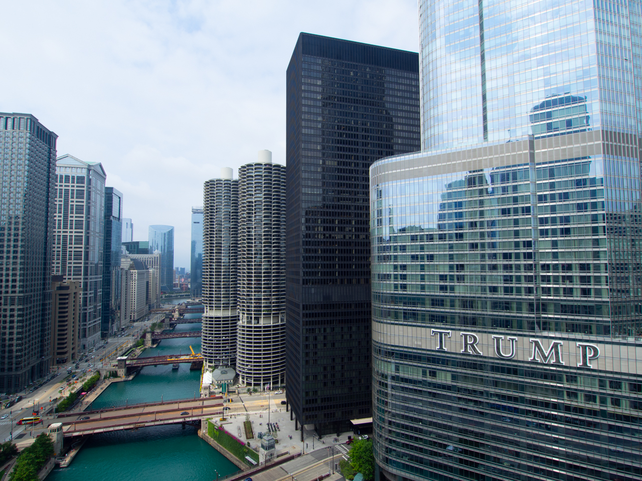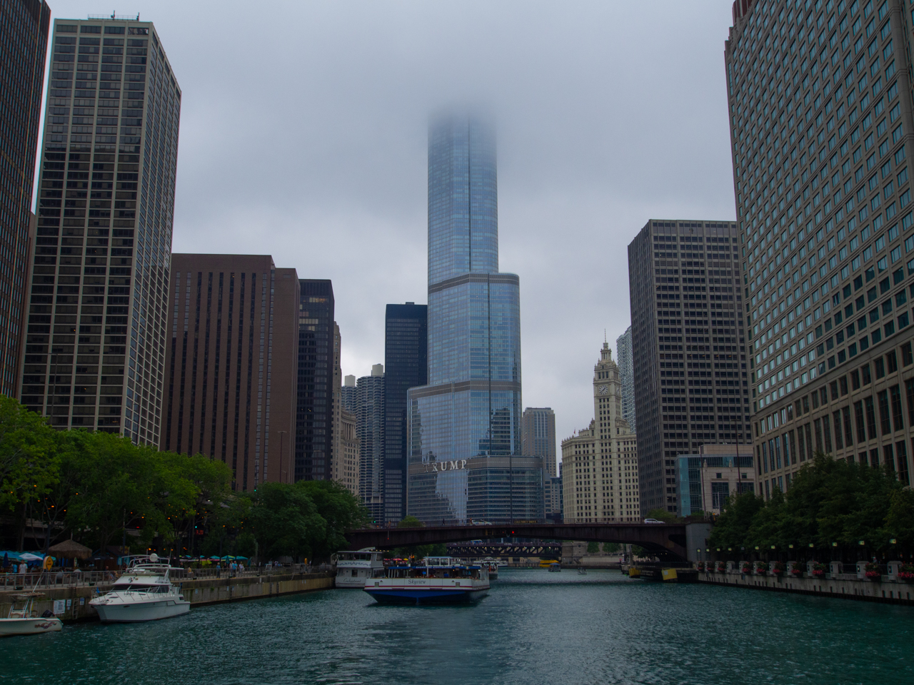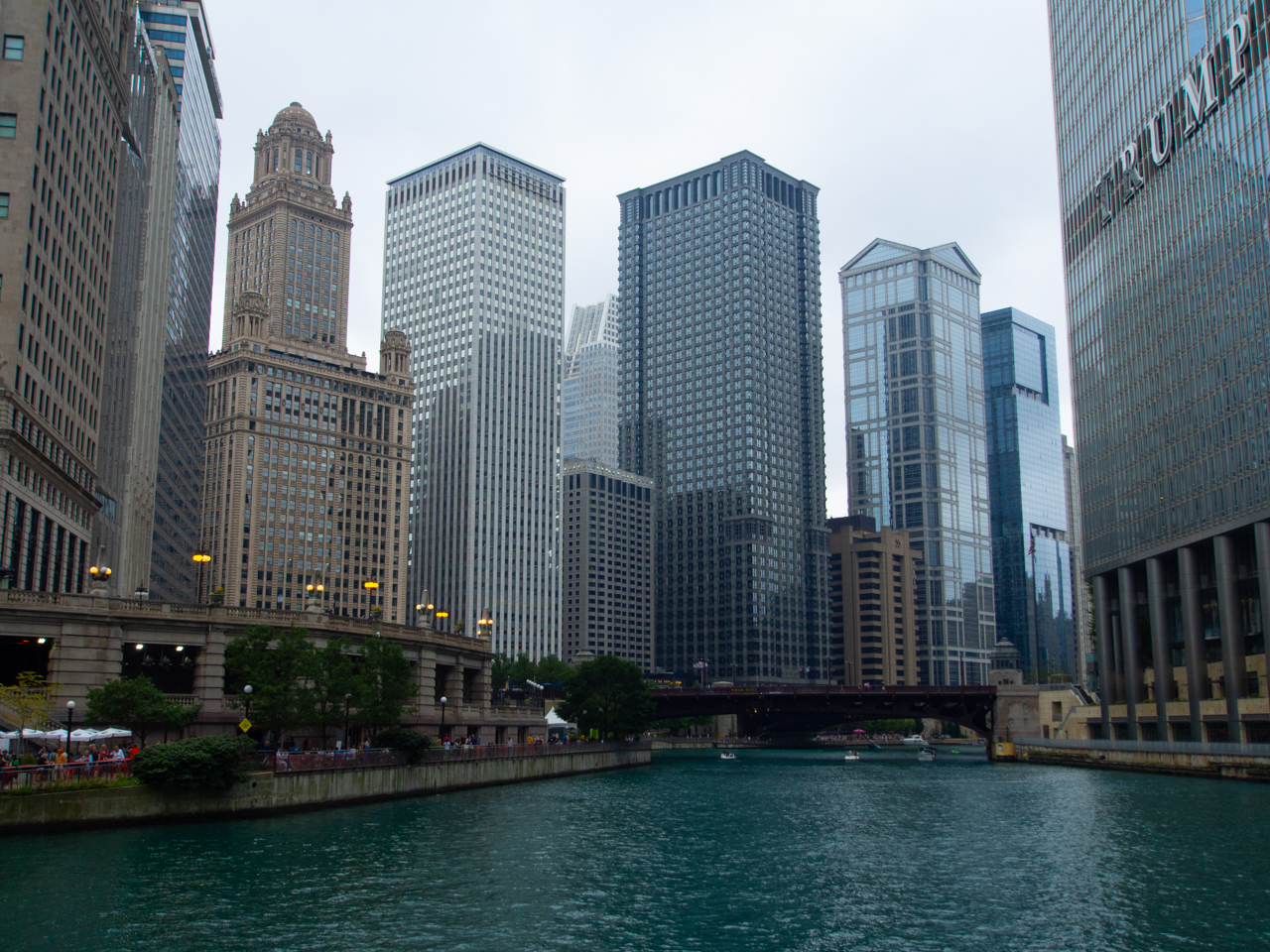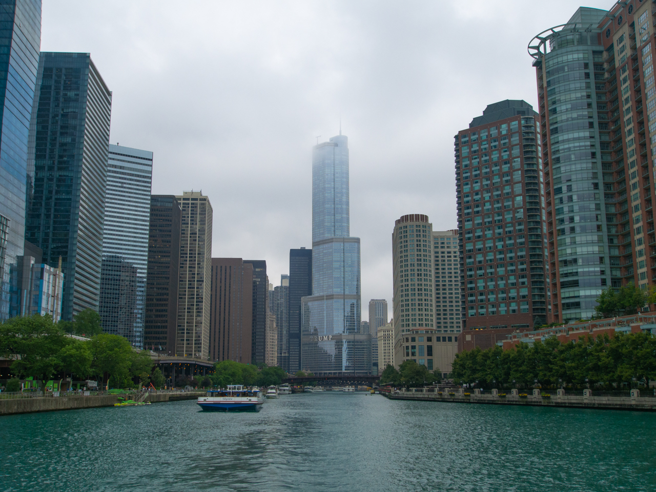 J’arrive jusqu’à l’embouchure de la Chicago River. Depuis le pont à deux niveaux, on a une vue sur les immeubles parmi les plus modernes de la ville, on est au coeur de la skyline, avec tout au milieu, la Trump Tower, deuxième plus haute tour de la ville, avec son nom écrit en gros, immanquables depuis n’importe quel angle.