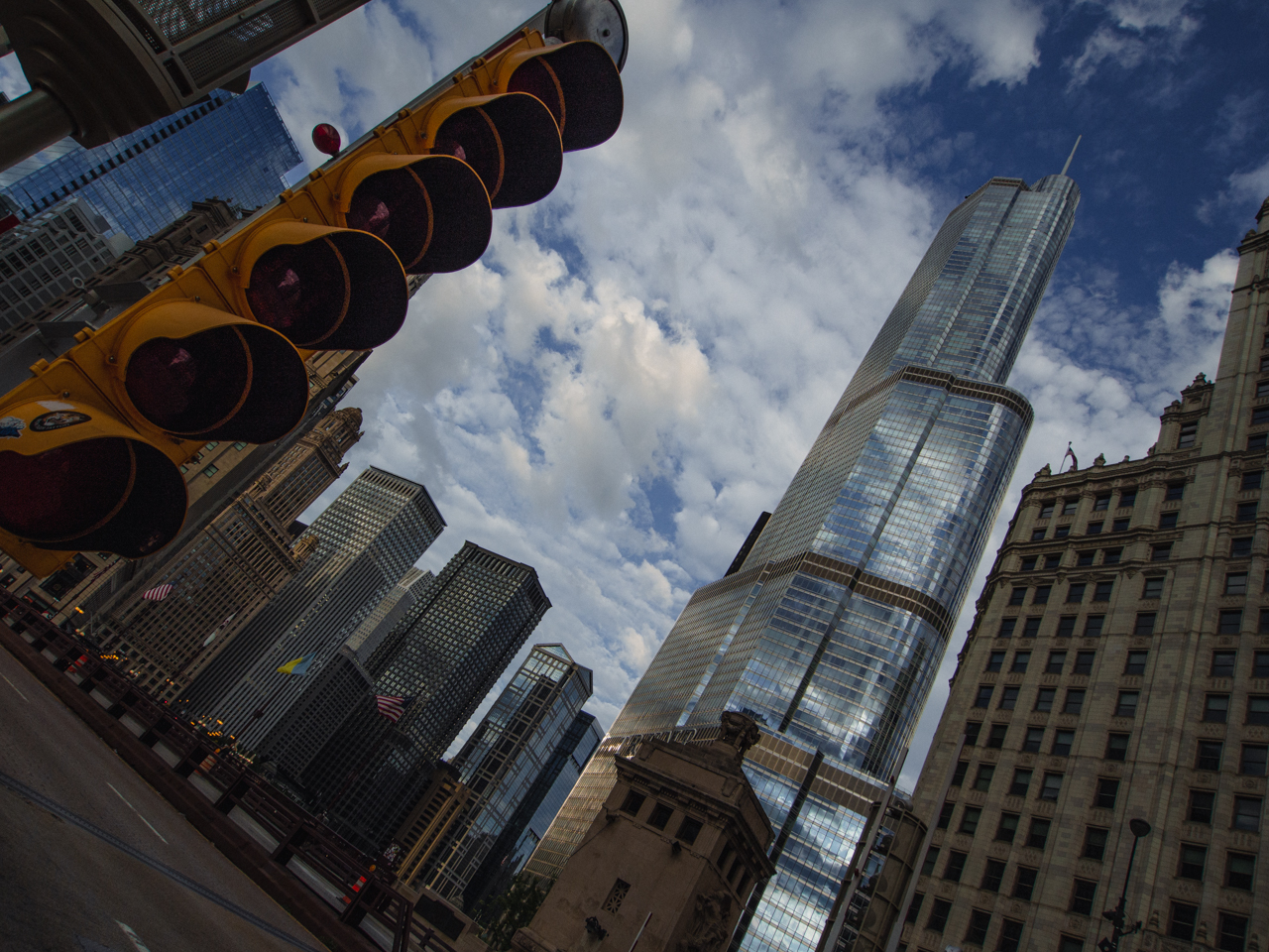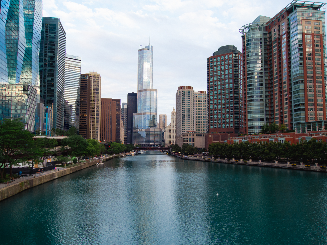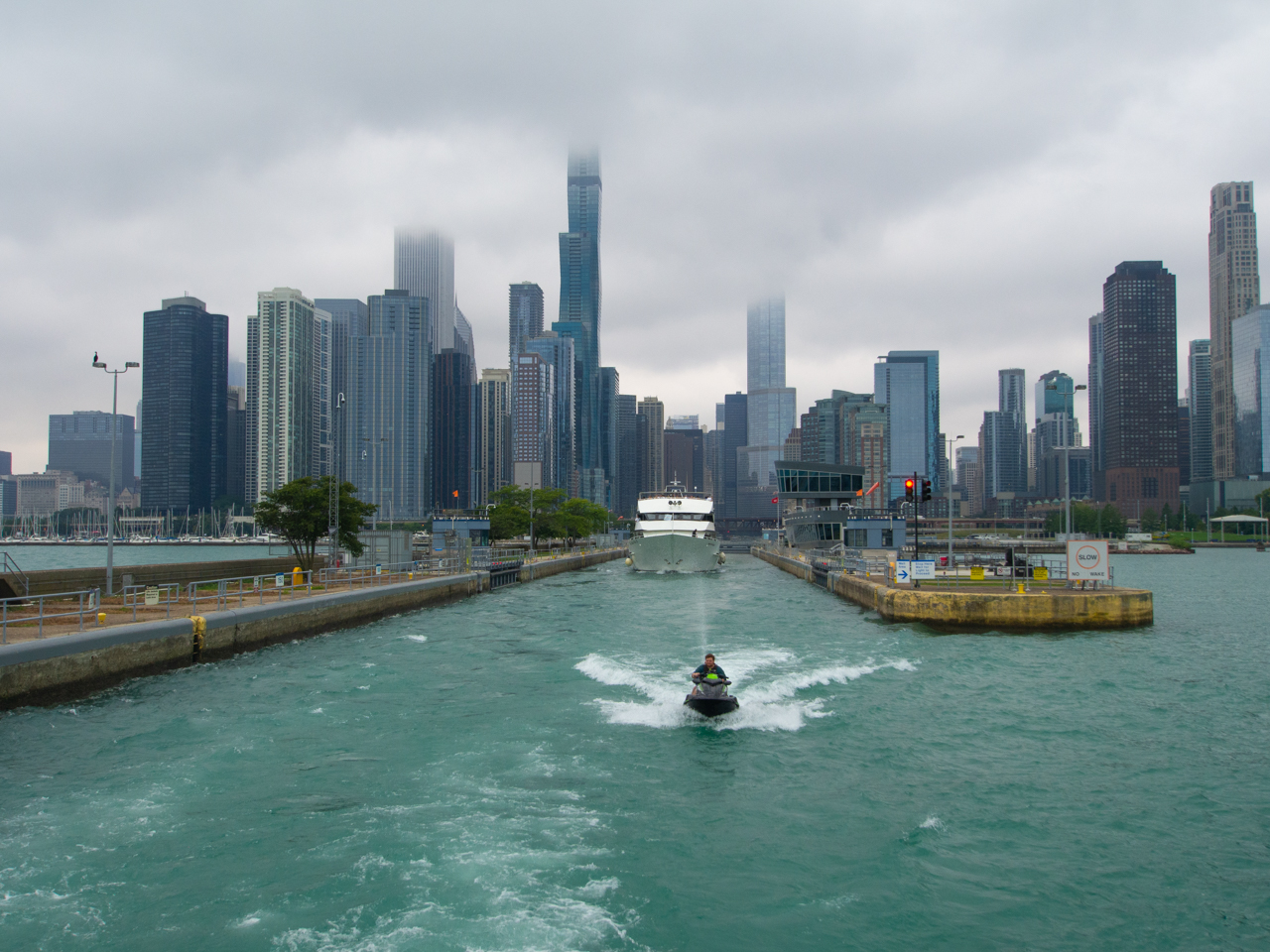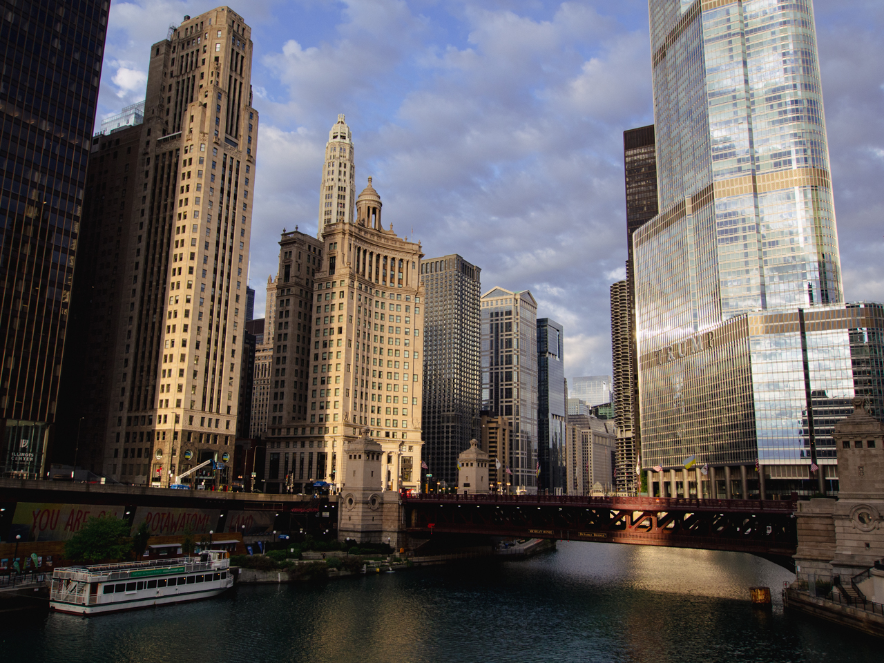 J’arrive jusqu’à l’embouchure de la Chicago River. Depuis le pont à deux niveaux, on a une vue sur les immeubles parmi les plus modernes de la ville, on est au coeur de la skyline, avec tout au milieu, la Trump Tower, deuxième plus haute tour de la ville, avec son nom écrit en gros, immanquables depuis n’importe quel angle.