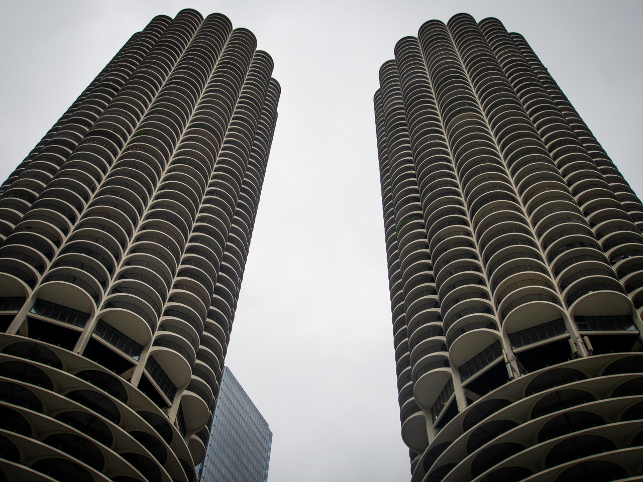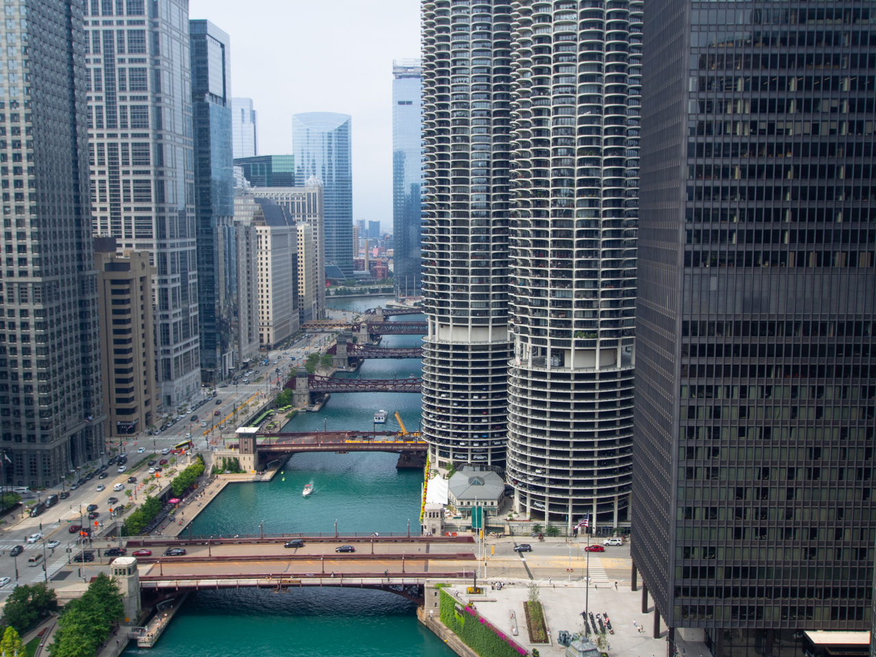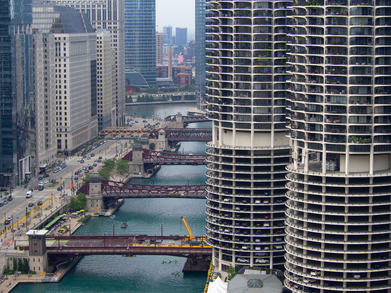Les ponts de la Chicago River sont tous à levis, plusieurs fois par semaine à l’automne, ils se lèvent pour laisser passer le trafic fluvial le long de la ville. Depuis le lac Michigan, on peut directement rejoindre le Mississippi par un réseau de canaux, puis descendre jusqu’au Golfe du Mexique. C’est d’ailleurs cette position stratégique en terme de logistique qui explique l’économie florissante de Chicago au XIXe et au XXe siècle. Les tours jumelles qui ressemblent à un nid d’abeille sont en fait un complexe immobilier de standing, pensé comme une ville verticale. Avec des parkings aux premiers niveaux et des appartements au-dessus.