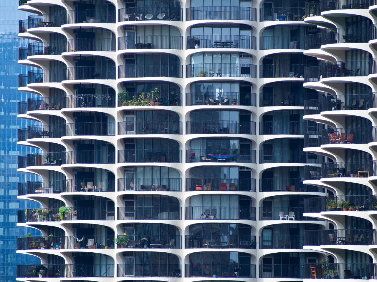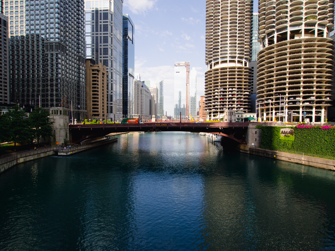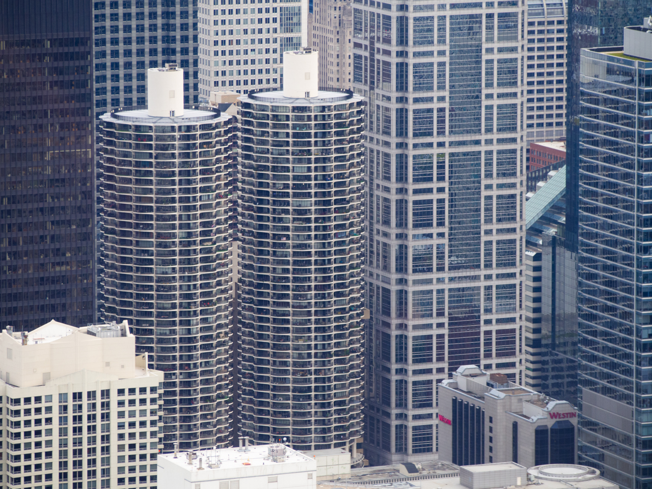Les ponts de la Chicago River sont tous à levis, plusieurs fois par semaine à l’automne, ils se lèvent pour laisser passer le trafic fluvial le long de la ville. Depuis le lac Michigan, on peut directement rejoindre le Mississippi par un réseau de canaux, puis descendre jusqu’au Golfe du Mexique. C’est d’ailleurs cette position stratégique en terme de logistique qui explique l’économie florissante de Chicago au XIXe et au XXe siècle. Les tours jumelles qui ressemblent à un nid d’abeille sont en fait un complexe immobilier de standing, pensé comme une ville verticale. Avec des parkings aux premiers niveaux et des appartements au-dessus.