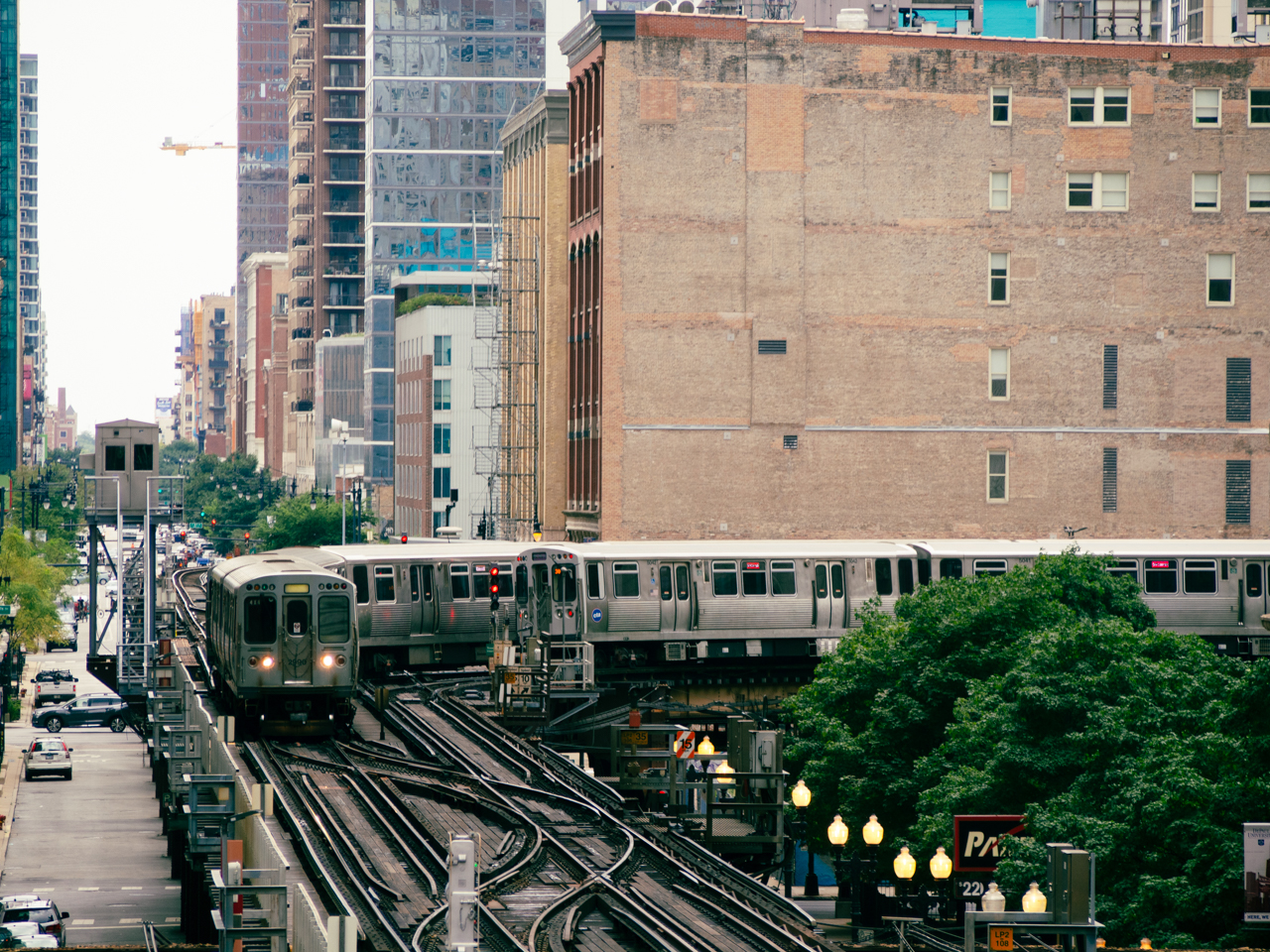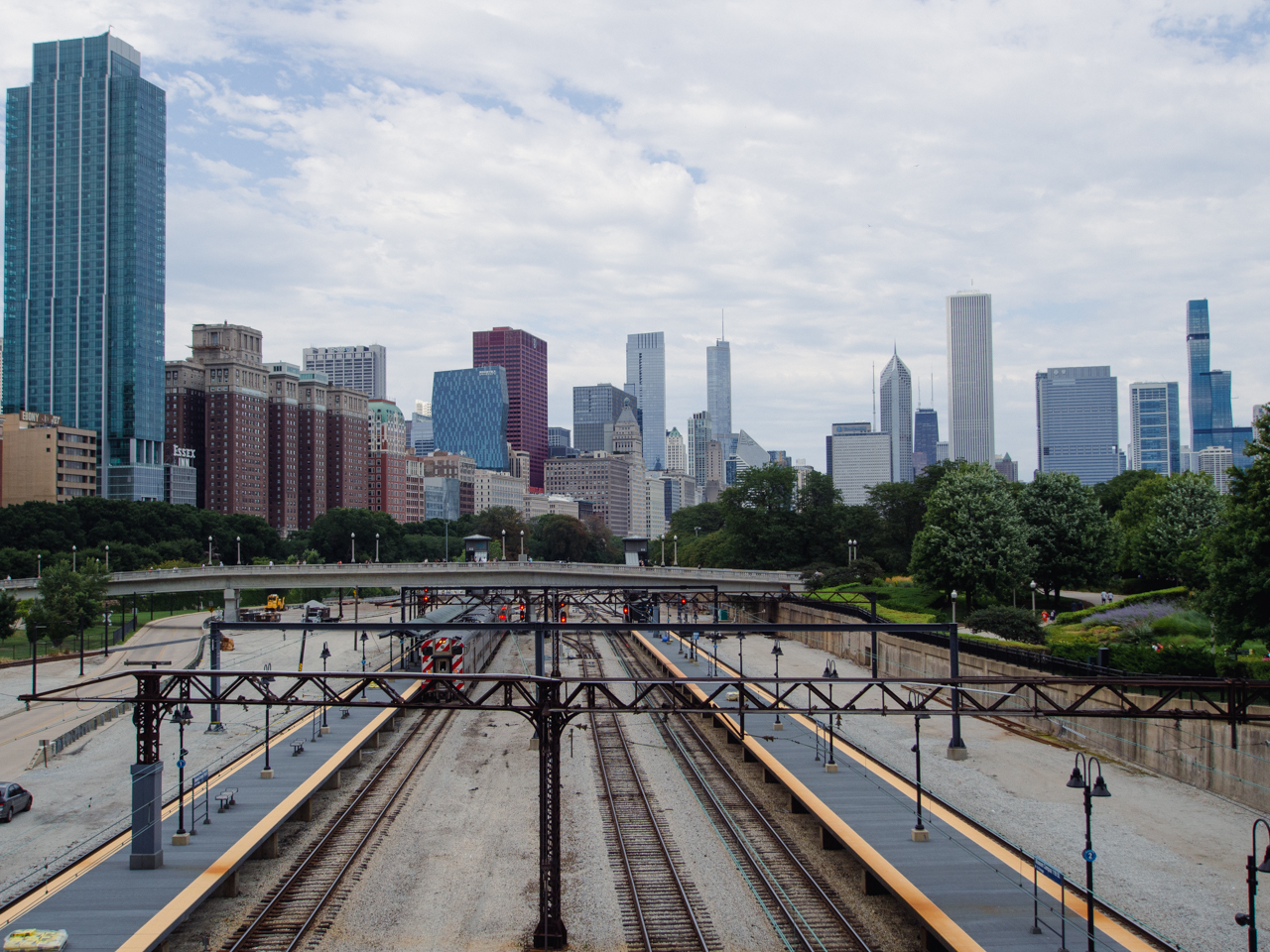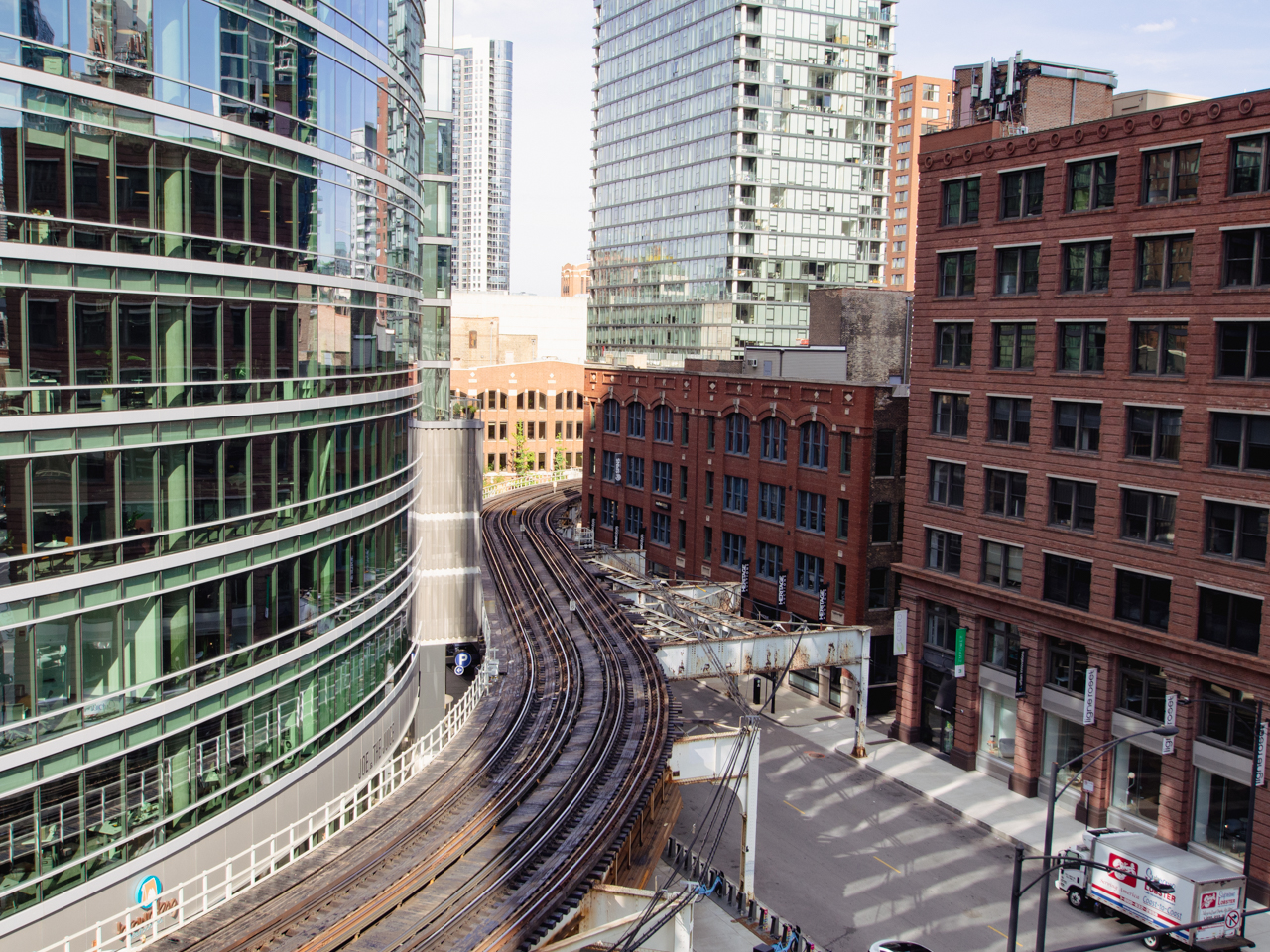 Une des spécificités urbaines qui font le charme de Chicago, c’est sans aucun doute son réseau de métro construits au-dessus des voies. Le métro encadre le Loop avec plusieurs lignes qui ensuite rejoignent chacune des quartiers périphériques différents. C’est une attraction en soi, le métro permet de faire le tour de la ville avec un angle différent, bien que pour circuler à l’intérieur du Loop, je ne suis pas sur que ce soit toujours plus rapide que la marche. Depuis un des parkings, on a en tout cas une très belle vue sur les rails qui serpentent entre les immeubles.