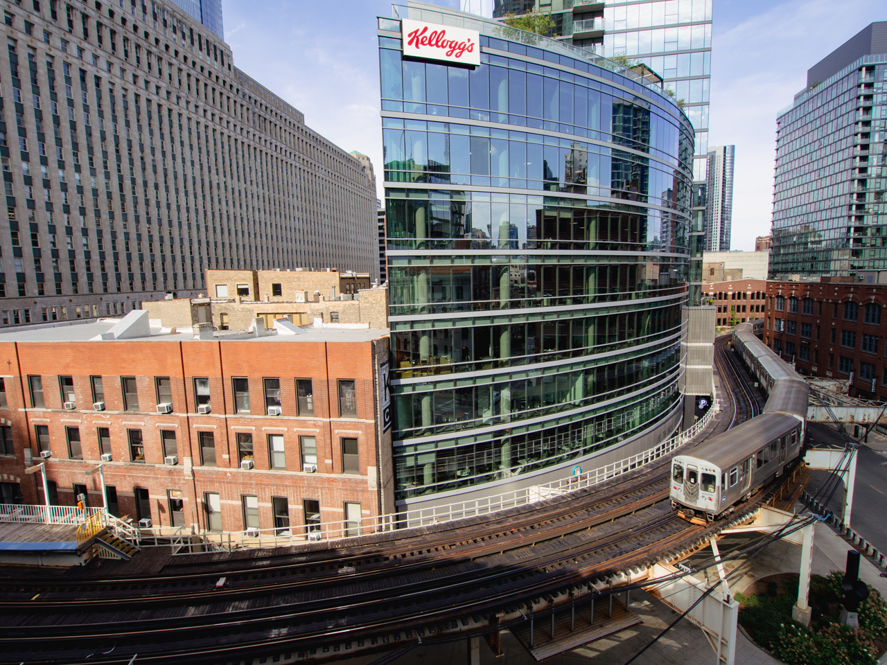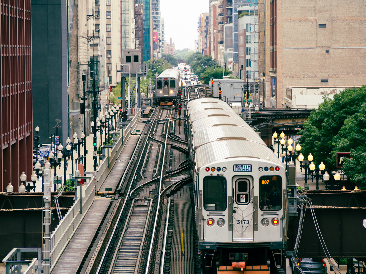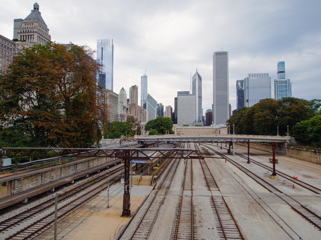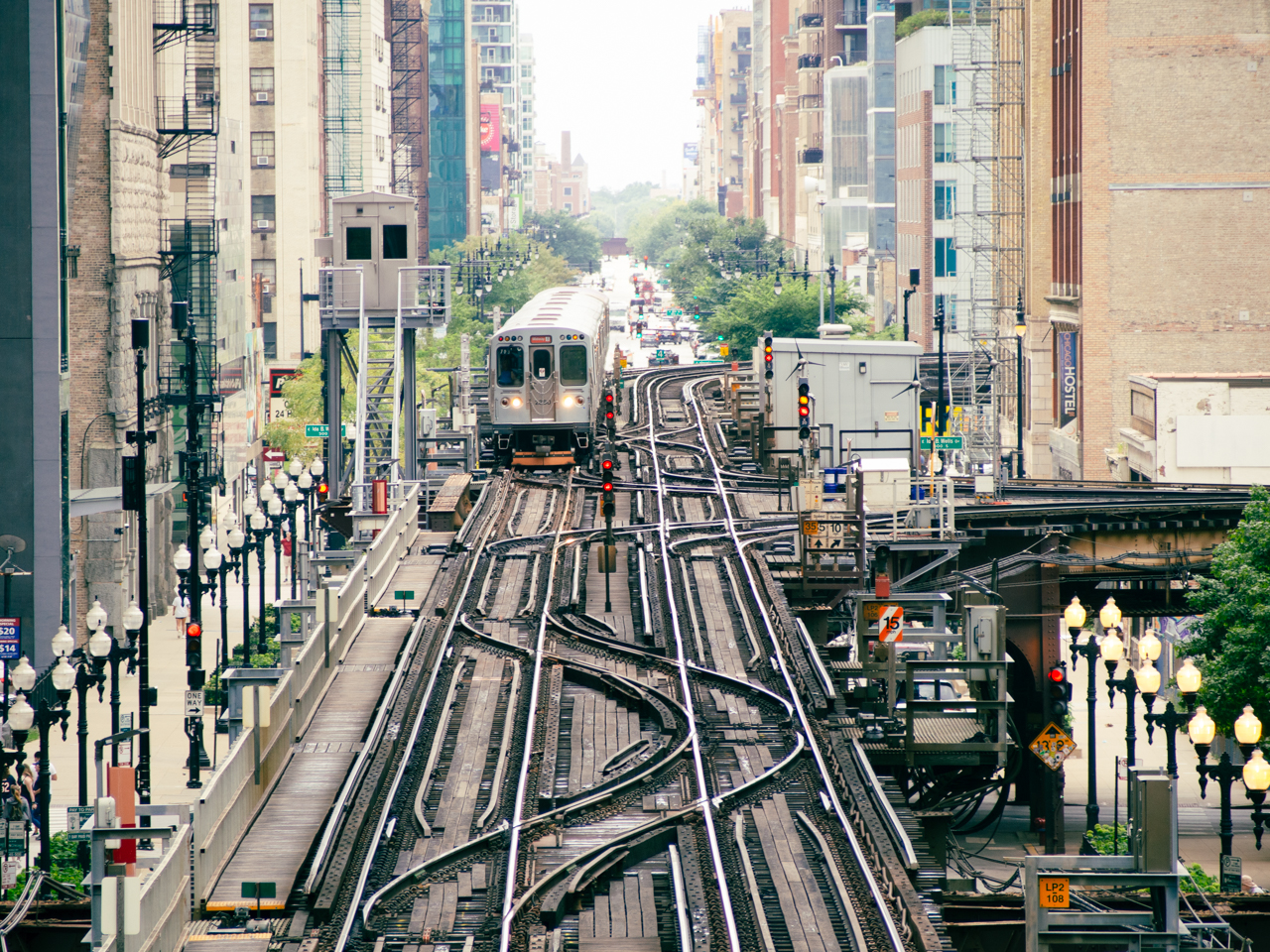 Depuis la station de Adams/Wabash, on peut changer de quai en prenant une passerelle au-dessus des rails, ce qui donne un point de vue idéal pour faire des photos de ce réseau complexe avec les trains et les rails.