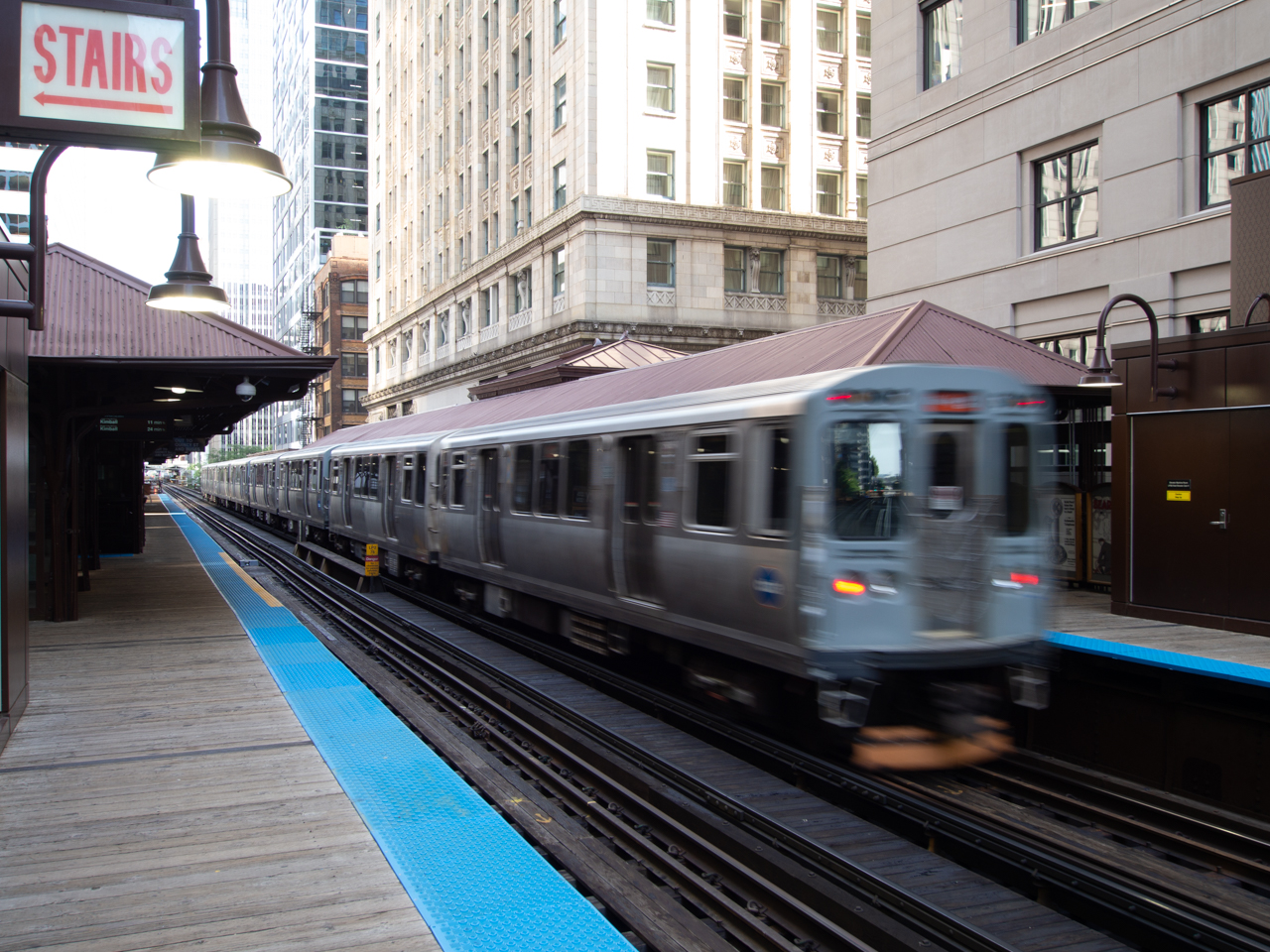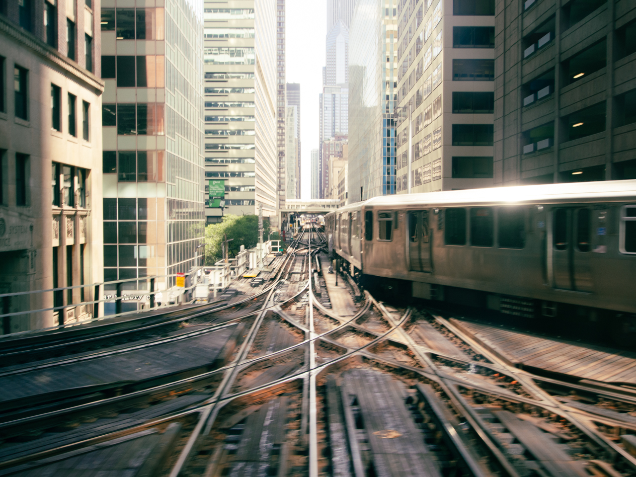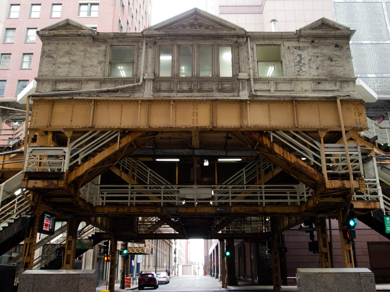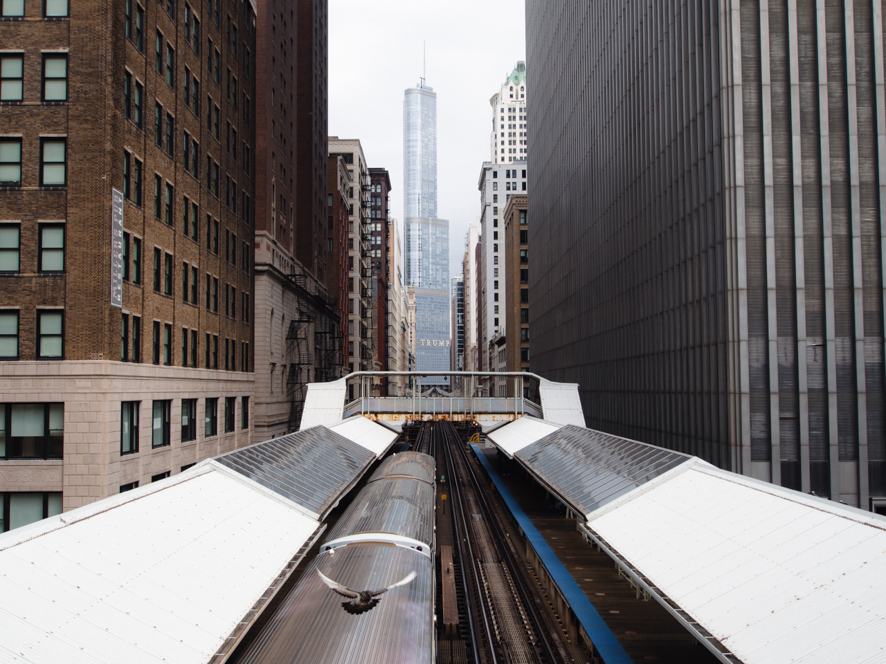 Les stations de métro sont d’époque faites de bois et de poutres d’acier riveté. Quelle chance d’avoir maintenu un tel réseau de transport en commun là où beaucoup de villes américaines ont tout démantelé après la 2ème guerre mondiale quand tout le monde voulait rouler en automobile et vivre dans les suburbs. Chicago a eu la présence d’esprit de conserver son système de transit et aujourd’hui c’est un des nombreux symboles de la ville. Depuis les fenêtres on peut contempler Chicago sous un angle différent, en contre plongée.