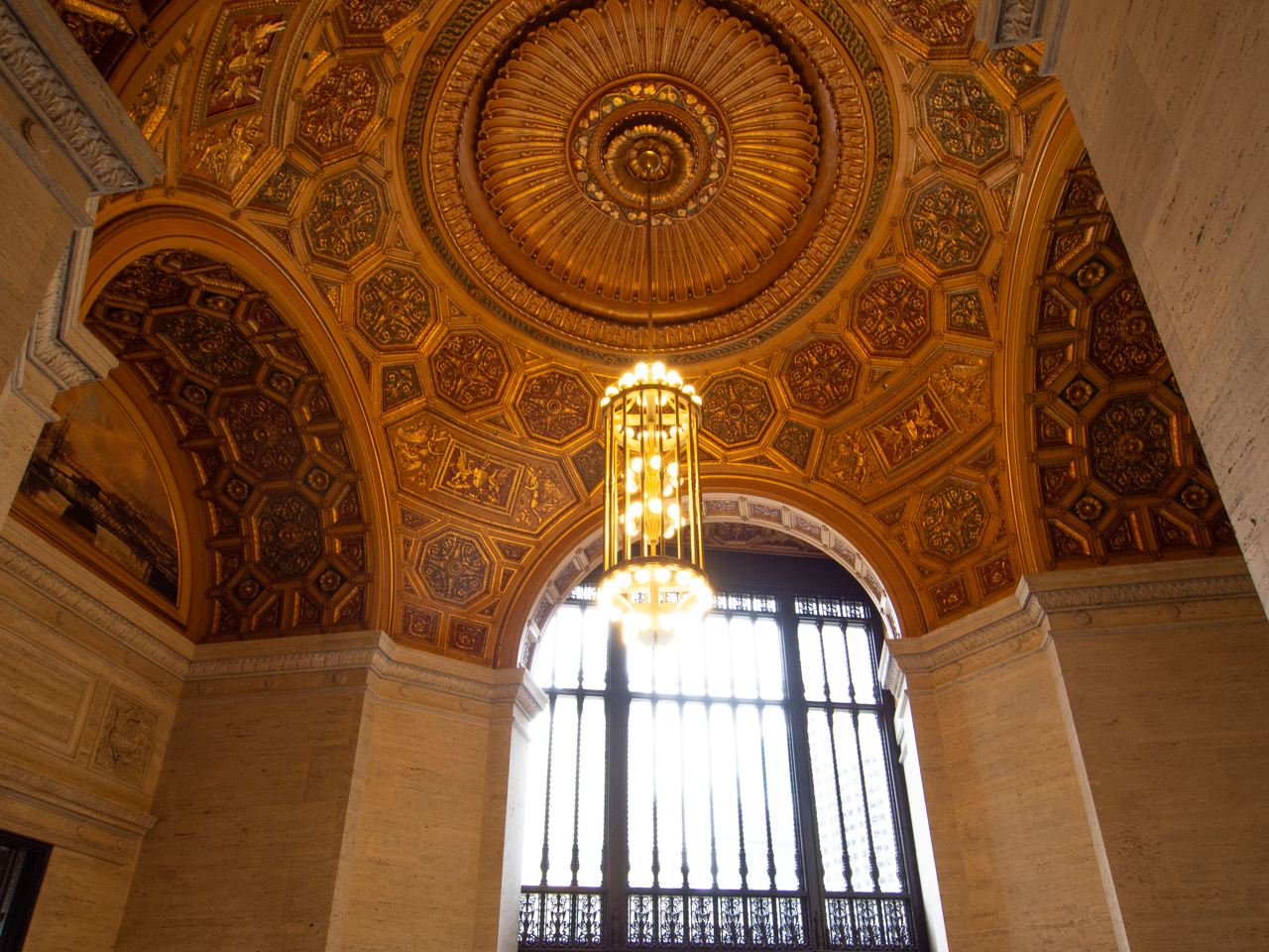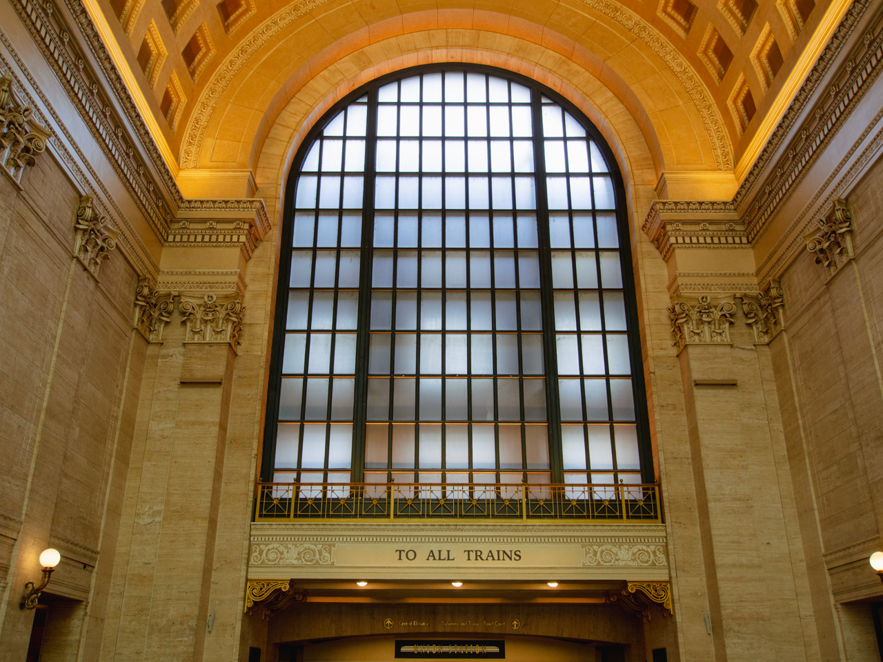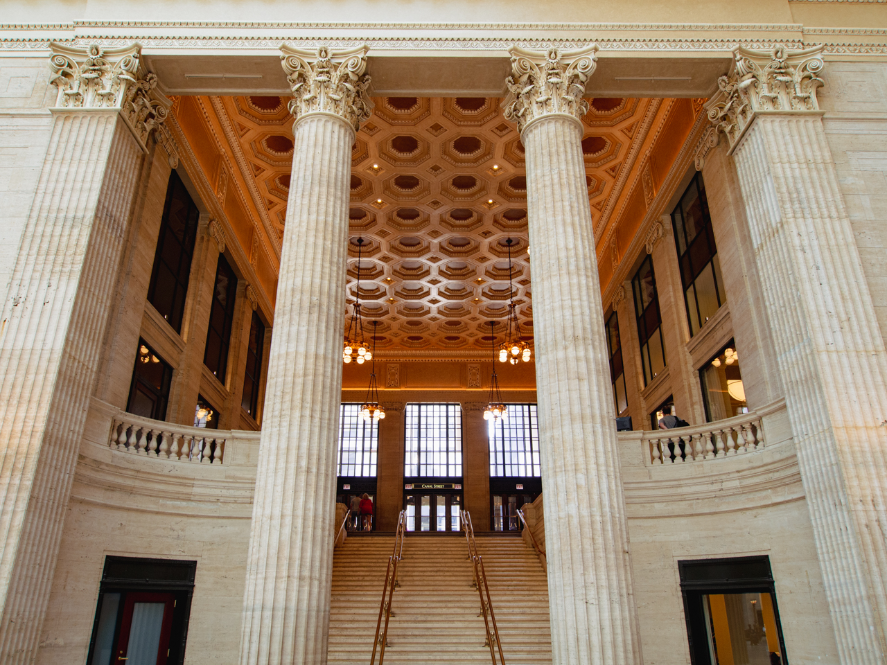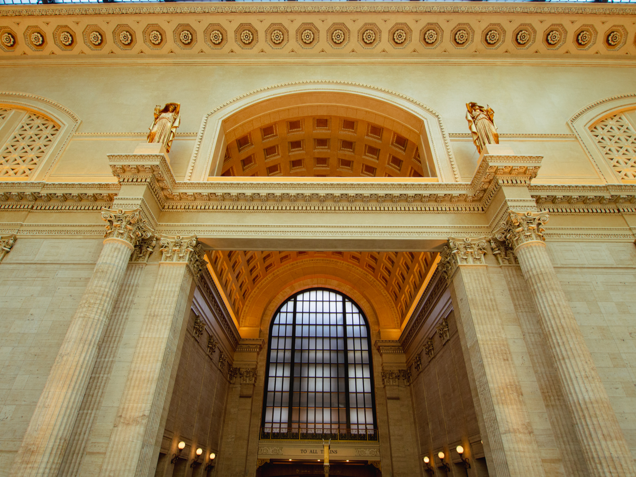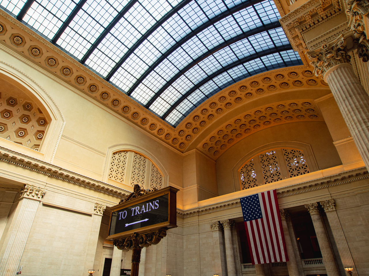 C’est d’ailleurs à Chicago qu’a été fixé le système d’heure continental pour le pays. Afin de faire fonctionner correctement les trains, il était obligatoire de créer un standard national de l’Atlantique au Pacifique. Jusqu’alors, chacun se fiait au soleil pour régler l’heure locale, mais avec un réseau aussi grand cela pouvait créer de gros dégâts. Il a donc été décidé en 1871 que le pays serait découpé en 4 zones avec chacune une heure de décalage d’Est en Ouest et que toutes gares devraient se régler en même temps. Pour un réseau aussi important, la gare de la ville se devait d’être grandiose, et c’est réussi avec Union Station qui accueille toujours aujourd’hui les visiteurs dans un bâtiment élégant d’inspiration néo classique avec des colonnades, des statues couvertes d’or et des plafonds très détaillés. On se croirait dans un palais.