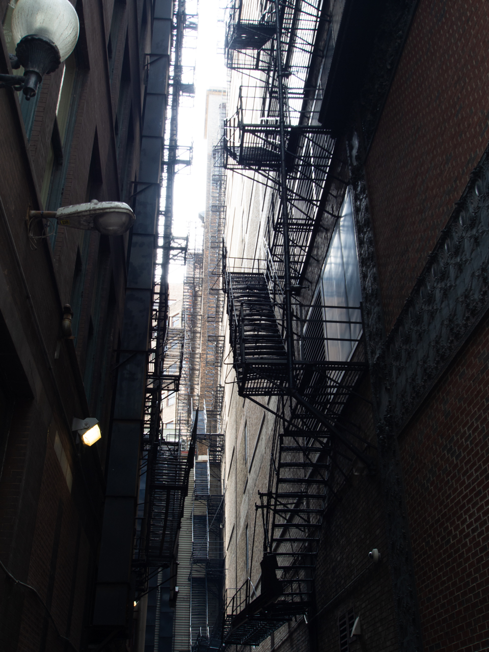 Je découvre aussi l’arrière de ces rues. Comme dans les films américains, c’est toujours dans ce genre de rues annexes, sombres avec ces escaliers de secours en fer qu’il se passe toujours quelque chose de dramatique, ou alors qu’un super héros de Marvel va sortir, avec tous les films que j’ai vu, j’ai un peu d’appréhension à entrer dans ces coins.