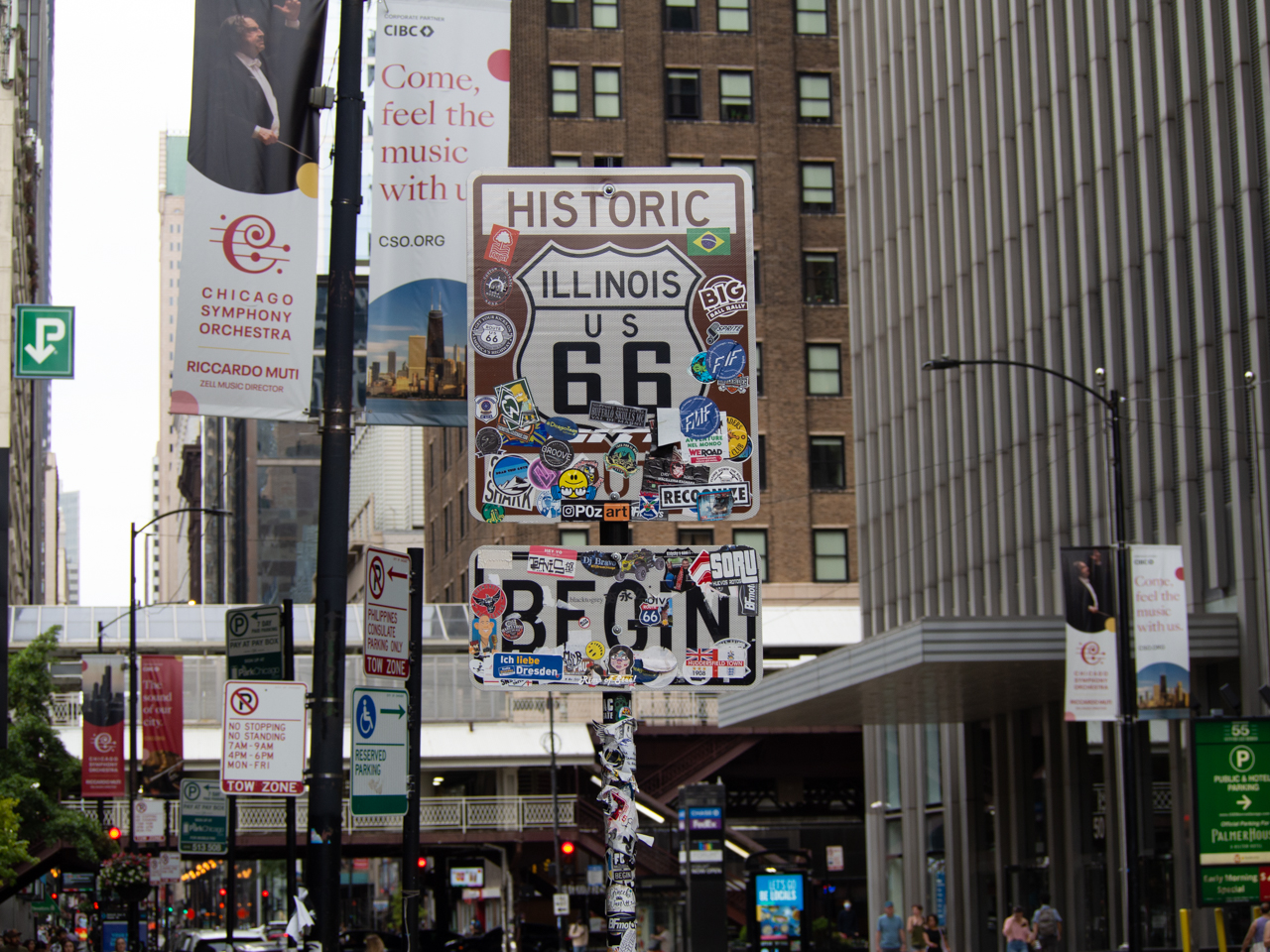 On a vu que Chicago est le principal noeud ferroviaire du pays, c’est aussi de Chicago que débute la mythique Route 66. Cette route qui est entré dans l’imaginaire collectif partait donc de la froide capitale de l’Illinois pour rejoindre en voiture les plages de Los Angeles, au bout d’un périple de 2448 miles qui traverse tellement de paysages typiques de l’Amérique. Un panneau indique le départ de cette route, une aventure pour beaucoup, comme cette famille français rencontrée à cet endroit qui se photographiait un cigare à la bouche sous le panneau après avoir accompli le périple depuis Los Angeles en 3 semaines. Pour eux le voyage se terminait à Chicago, une dernière étape d’un voyage surement extraordinaire.