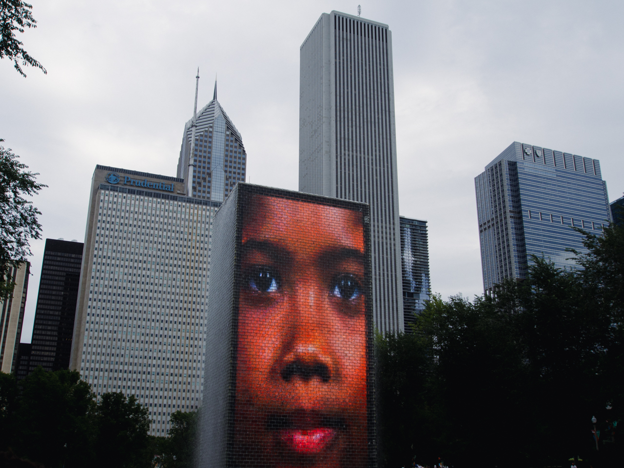 Je suis donc maintenant de retour à Millenium Park. Il est midi, et je suis curieux de retourner au Cloud Gate pour voir la différence avec l’aurore en terme de fréquentation. Mais avant, je passe devant la fontaine de Crown Fountain. Un immense fontaine créée avec deux écrans LCD qui projètent des photos de visages.