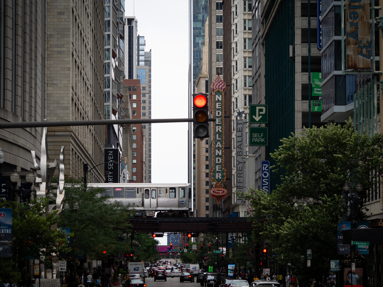 Les rues du centre ville sont bien alignées, comme à New York on a l’impression de rentrer dans un canyon urbain étroit, puis le métro passe sur le pont à cet instant où je prends la photo, un instant très Chicago saisi au bon moment.