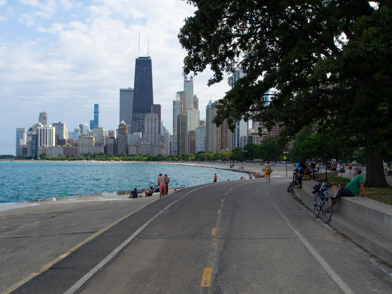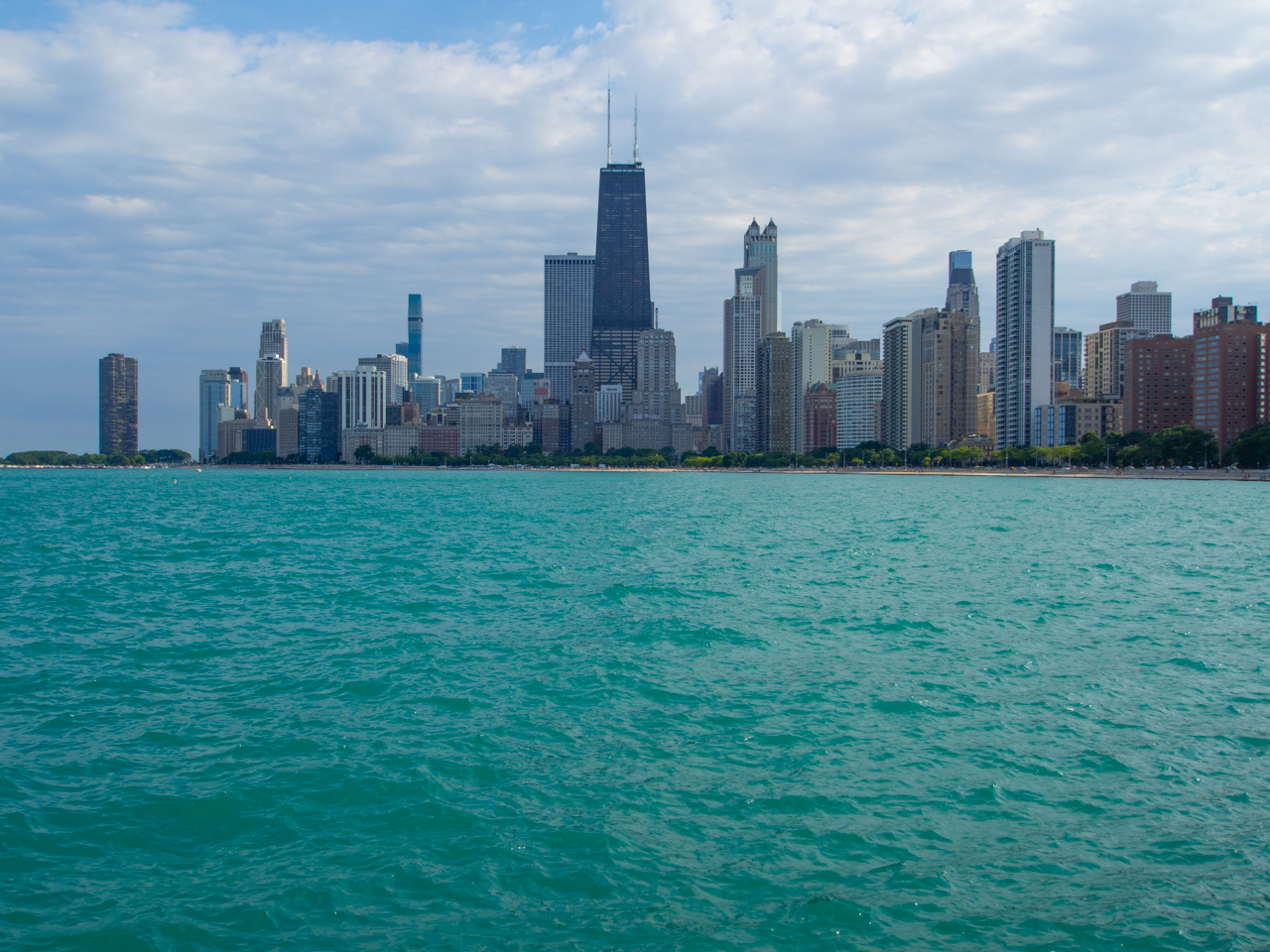 Je rejoins le parc autour du Adler Planetarium pour avoir une vue panoramique sur toute la skyline de Chicago. Le parc est bien aménagé avec des marches et de la pelouse, il y a plusieurs couples qui viennent ici prendre leurs photos de mariage. On est un peu plus loin du centre ville et on embrasse toute la ville depuis les berges du lac.