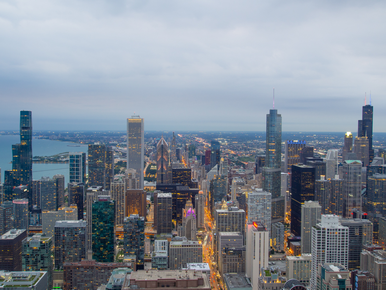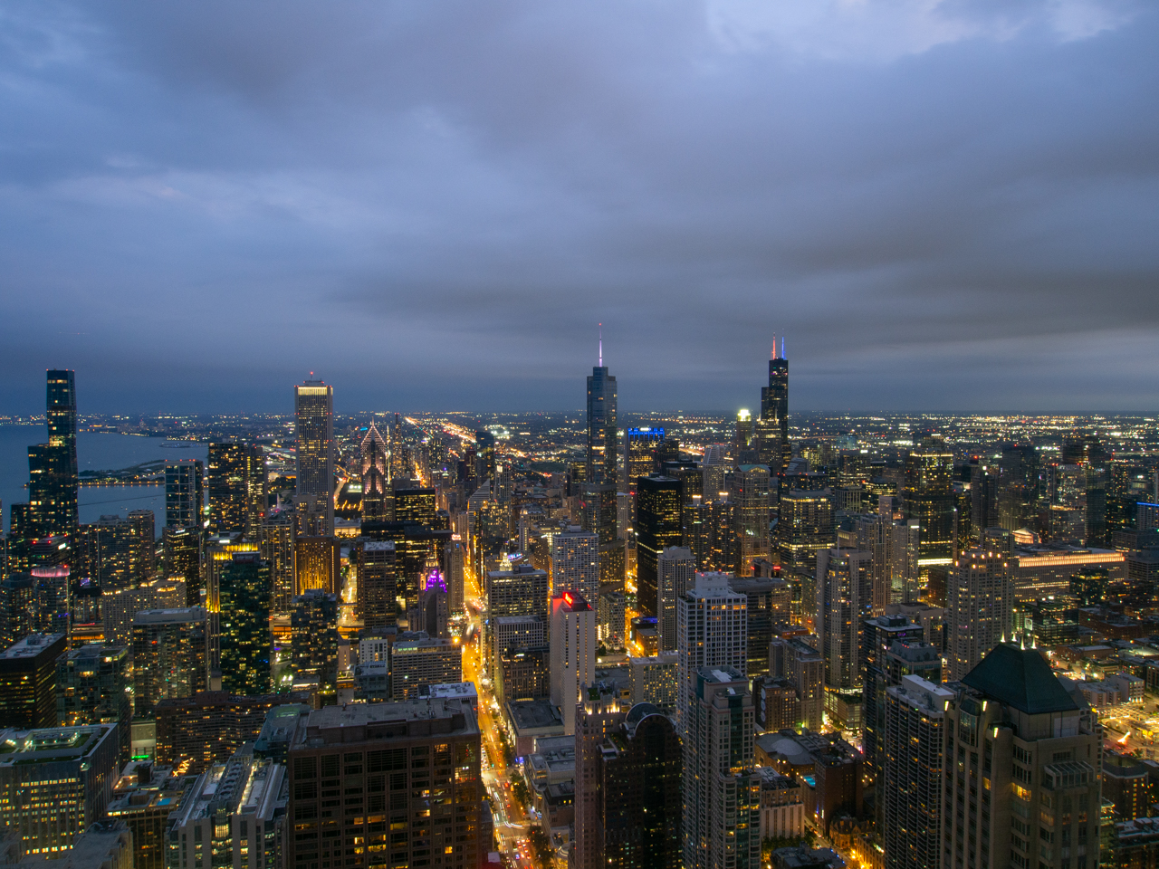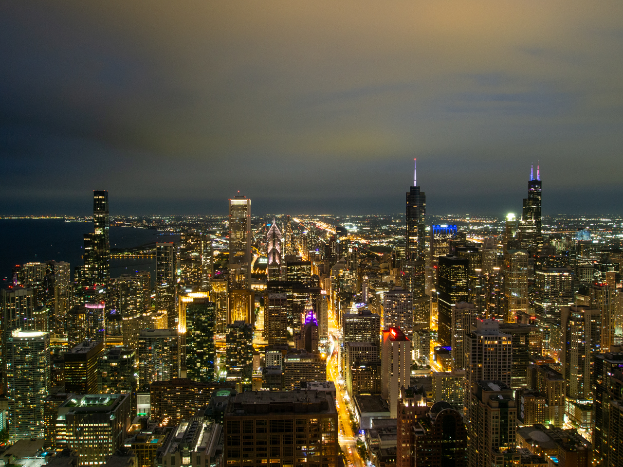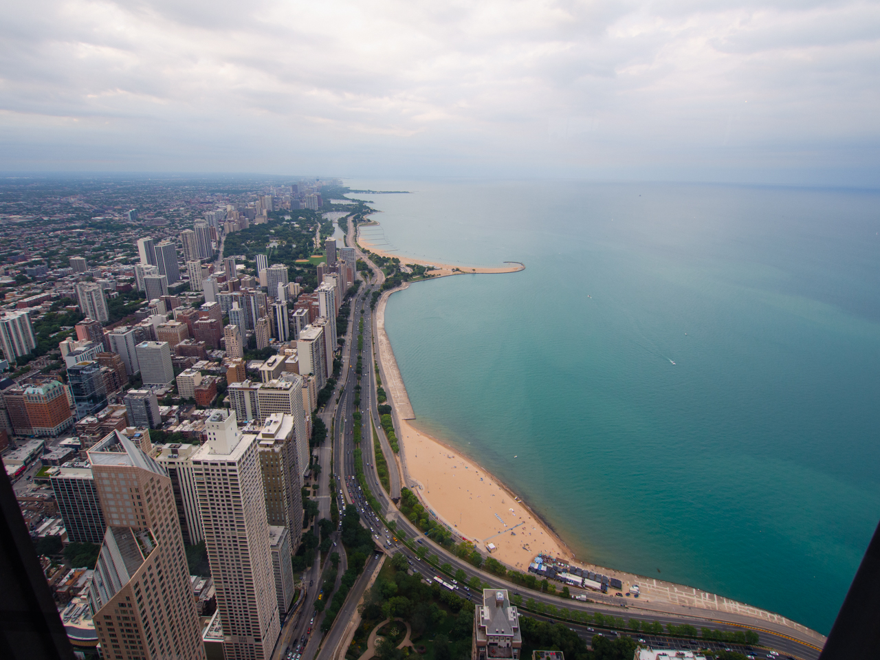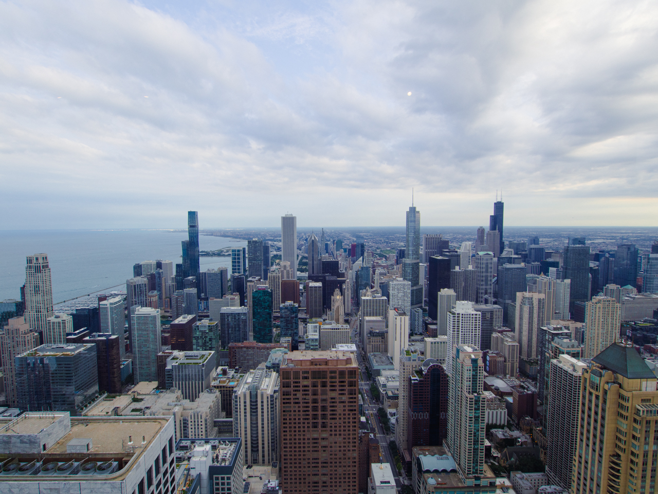 J’avais réservé en avance un ticket pour monter à l’observatoire du John Hancock Center. Il y a deux observatoires à Chicago et idéalement je souhaitais visiter les deux. Mais la météo était très incertaine pour ce week-end donc j’avais choisi dont la vue me plaisait le plus. Pourquoi choisir l’observatoire du John Hancock Center plutôt que celui de la Willis Tower qui est plus haut ? Je voulais avoir la vue sur la ville et sur le lac bleu, et l’orientation de la John Hancock Center donne un meilleur résultat au coucher de soleil. L’avantage de la Willis Tower c’est par contre que l’on a une vue compète sur le Loop et la Magnifient Miles dont le John Hancock Center, ça doit être super aussi. Bien sur, le temps a changé et lorsque j’arrive tout en haut les nuages s’imposent et la vue est un peu moins intéressante. Le lac ne ressort pas aussi bleu que je l’imaginais.